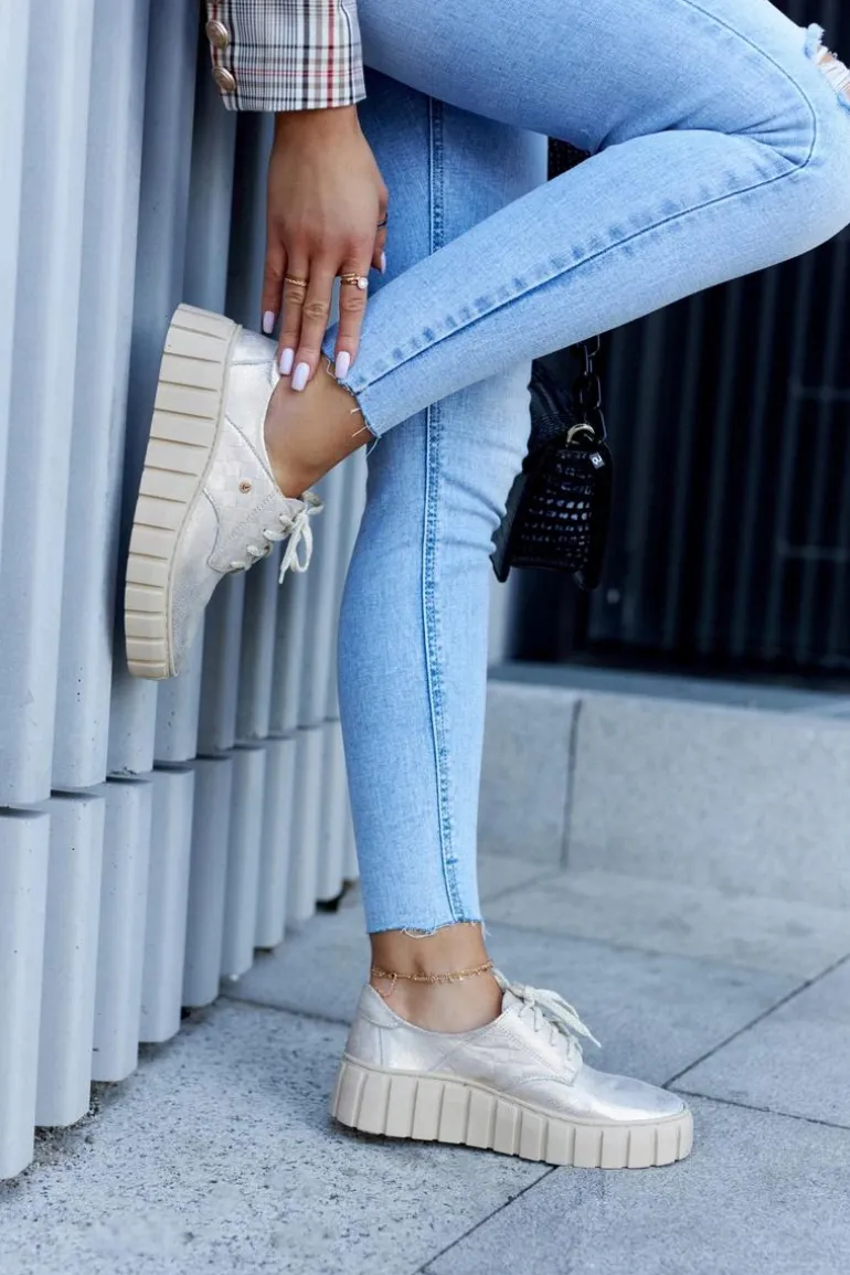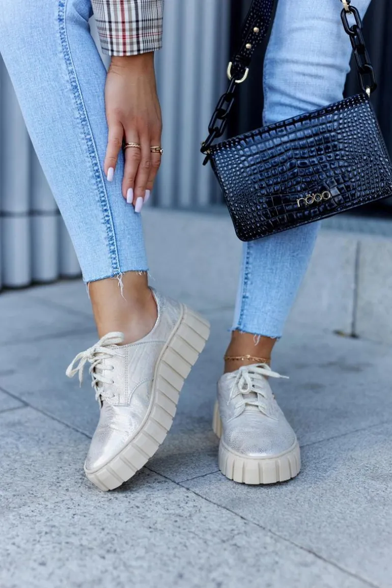 Półbuty posiadają wiązanie na płaskie, ozdobione błyszczącą nicią sznurowadła. Osadzone na masywnej platformie z żłobieniami po bokach. Wewnątrz wygodna wkładka z naturalnej skóry, która jest dodatkowo profilowana. Cholewka przed kostkę została wykonana z naturalnej skóry z efektem metalicznym. Bardzo lekkie i komfortowe w użytkowaniu. Idealne do eleganckich spodni, tiulowych spódnic czy dzianinowych sukienek. Możesz je łączyć z różnymi stylizacjami – zawsze będą wyglądać świetnie! Te cudne buty zdecydowanie muszą znaleźć się w Twojej garderobie!Przy wyborze rozmiaru prosimy sugerować się tabelą rozmiarów.