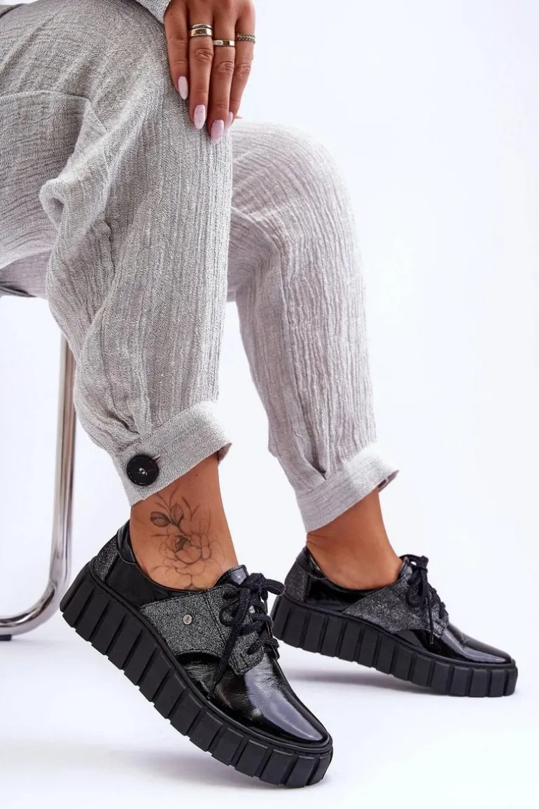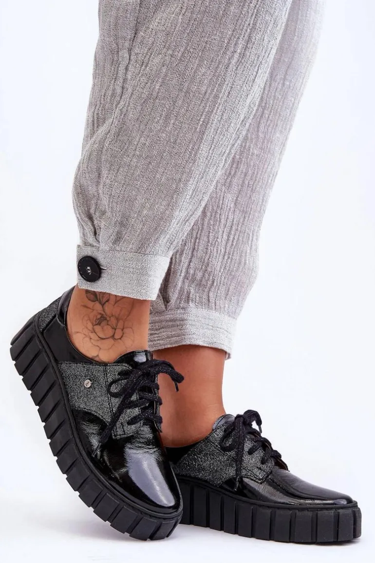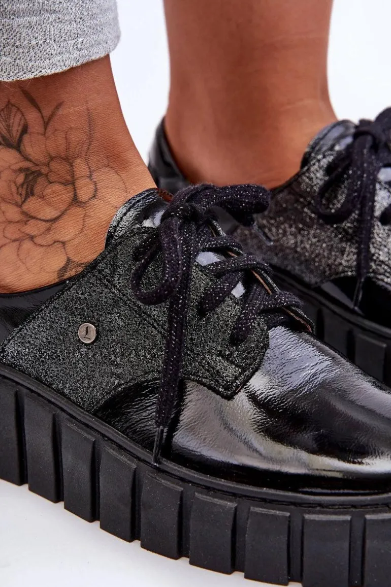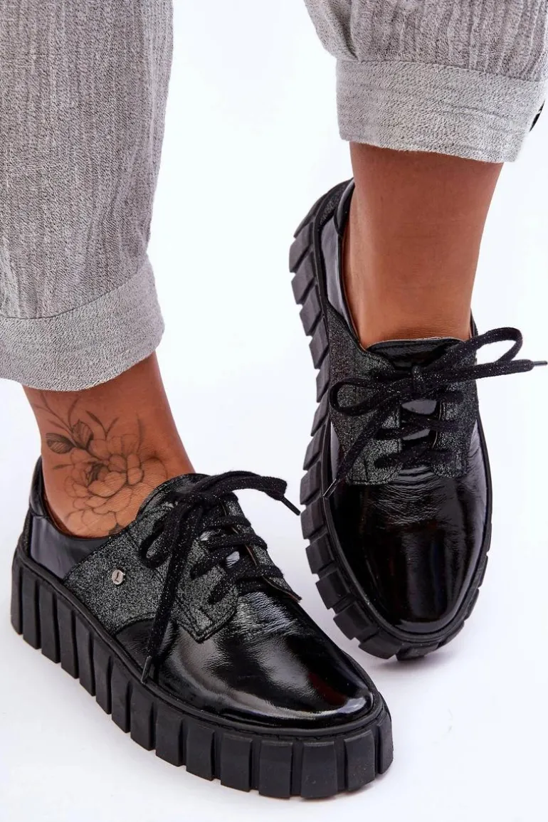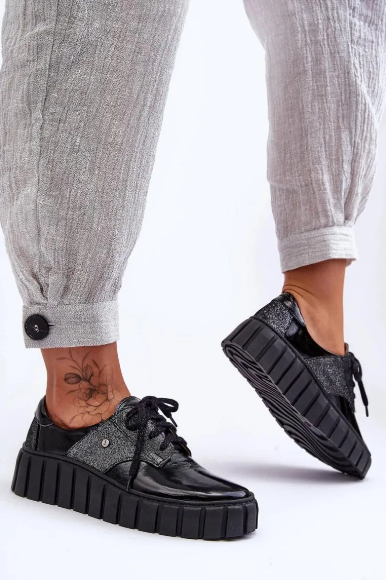 Półbuty posiadają wiązanie na ozdobione błyszczącą nicią sznurowadła. Osadzone na masywnej platformie ze żłobieniami po bokach. Wewnątrz wygodna wkładka ze skóry naturalnej, która jest dodatkowo profilowana. Cholewka przed kostkę została wykonana również z naturalnej skóry. Bardzo lekkie i komfortowe w użytkowaniu. Idealne do eleganckich spodni, tiulowych spódnic czy dzianinowych sukienek. Możesz je łączyć z różnymi stylizacjami – zawsze będą wyglądać świetnie! Te cudne buty zdecydowanie muszą znaleźć się w Twojej garderobie!Przy wyborze rozmiaru prosimy sugerować się tabelą rozmiarów.