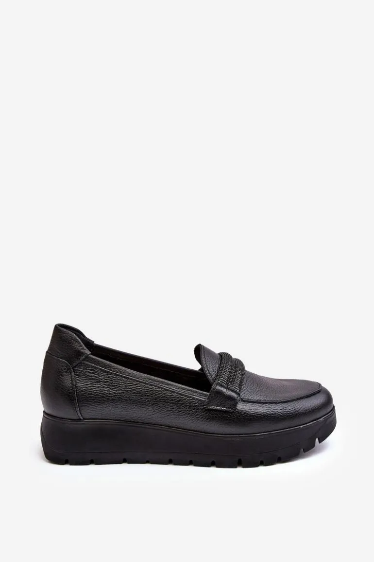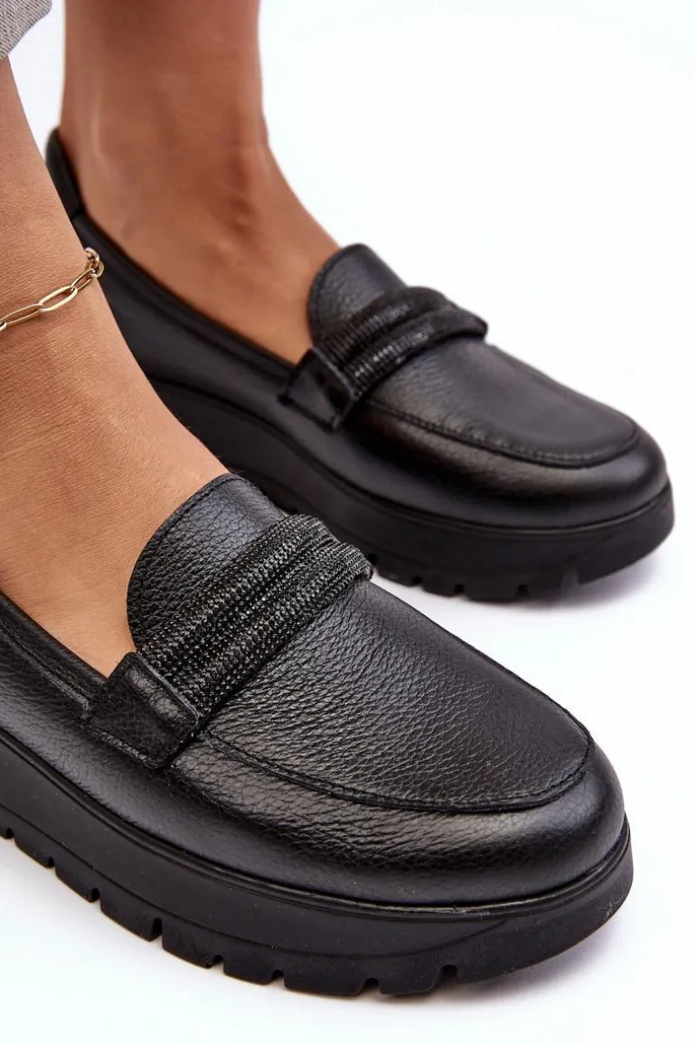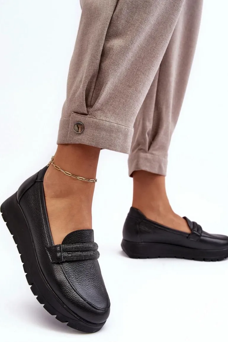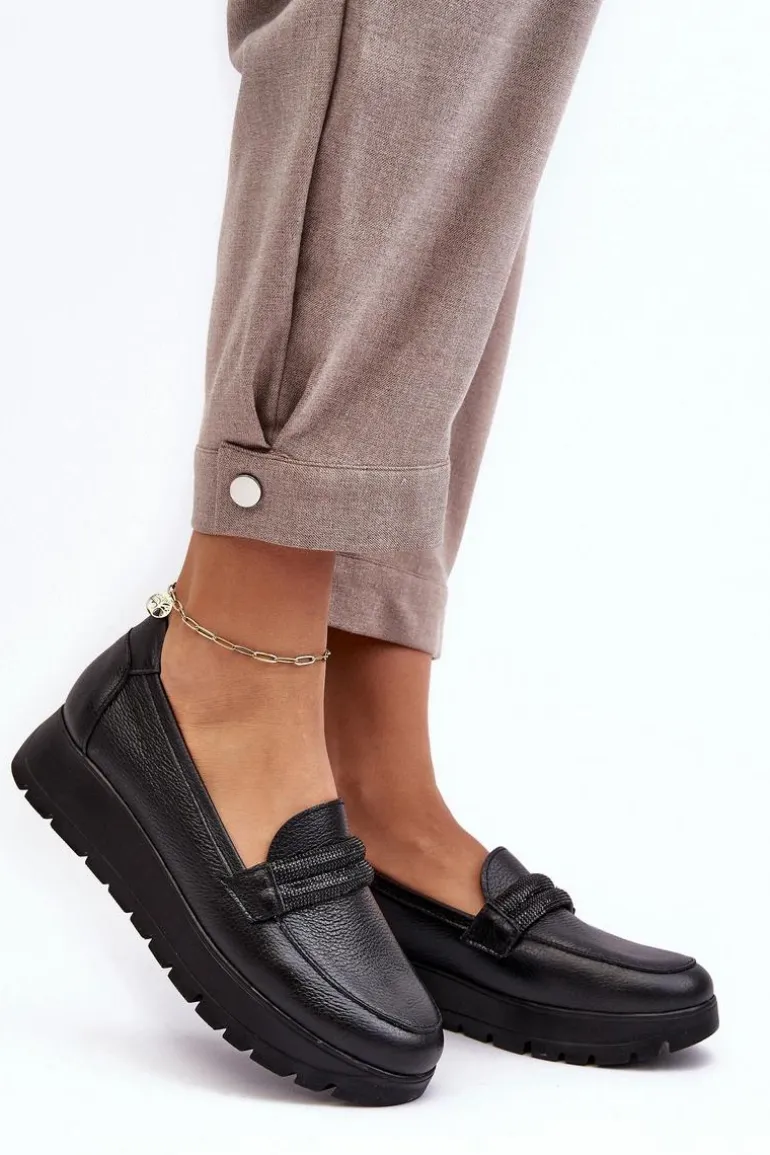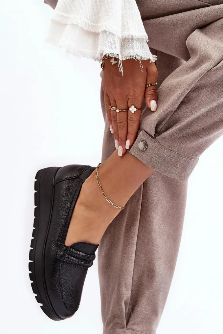 Damskie, wsuwane półbuty zostały wykonane z naturalnej skóry. Osadzone na masywnej platformie. Posiadają zaokrąglony nosek. Wkładka wykonana również ze skóry naturalnej zapewni komfort podczas użytkowania. Dodatkowo zapiętek w tym obuwiu jest usztywniony. Modne, wygodne, a także wykonane z dbałością o detale. Przy wyborze rozmiaru prosimy sugerować się tabelą rozmiarów.