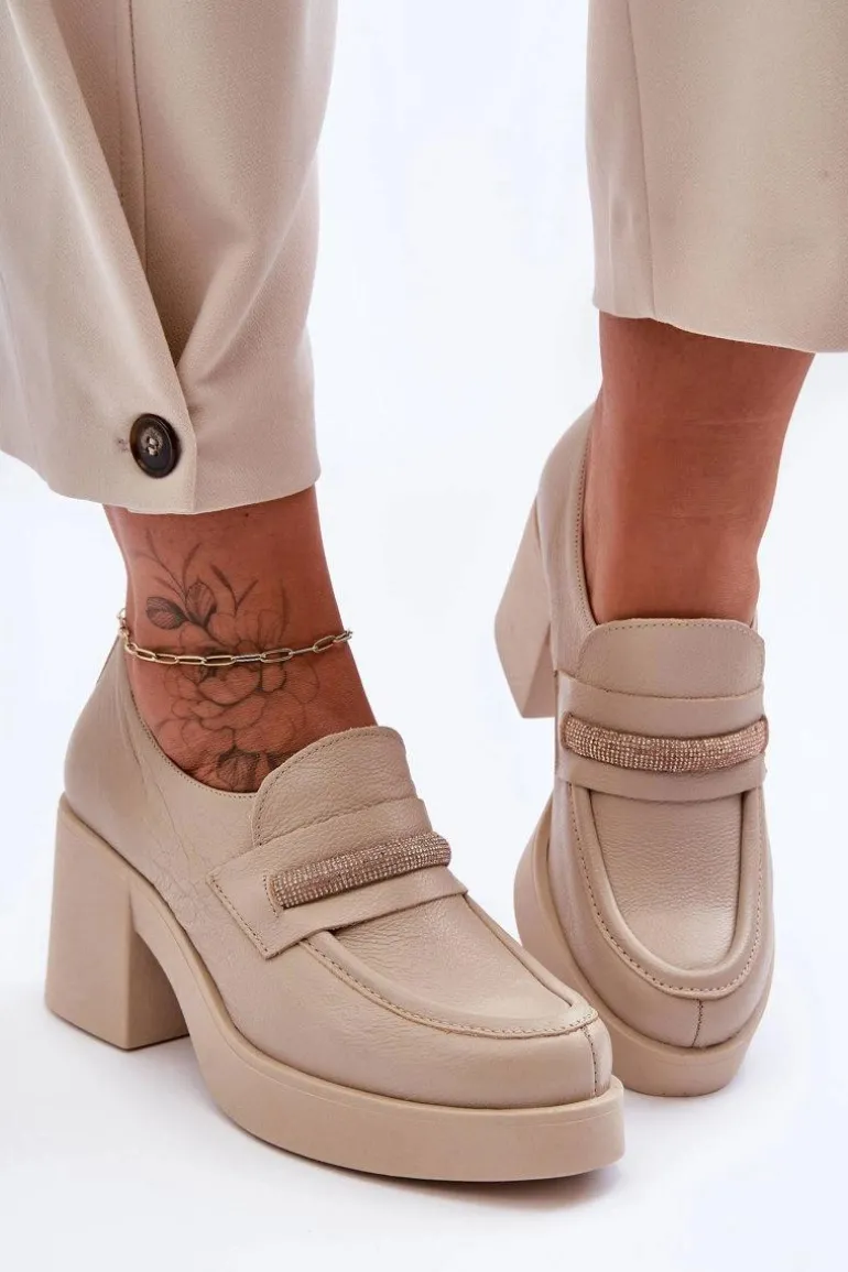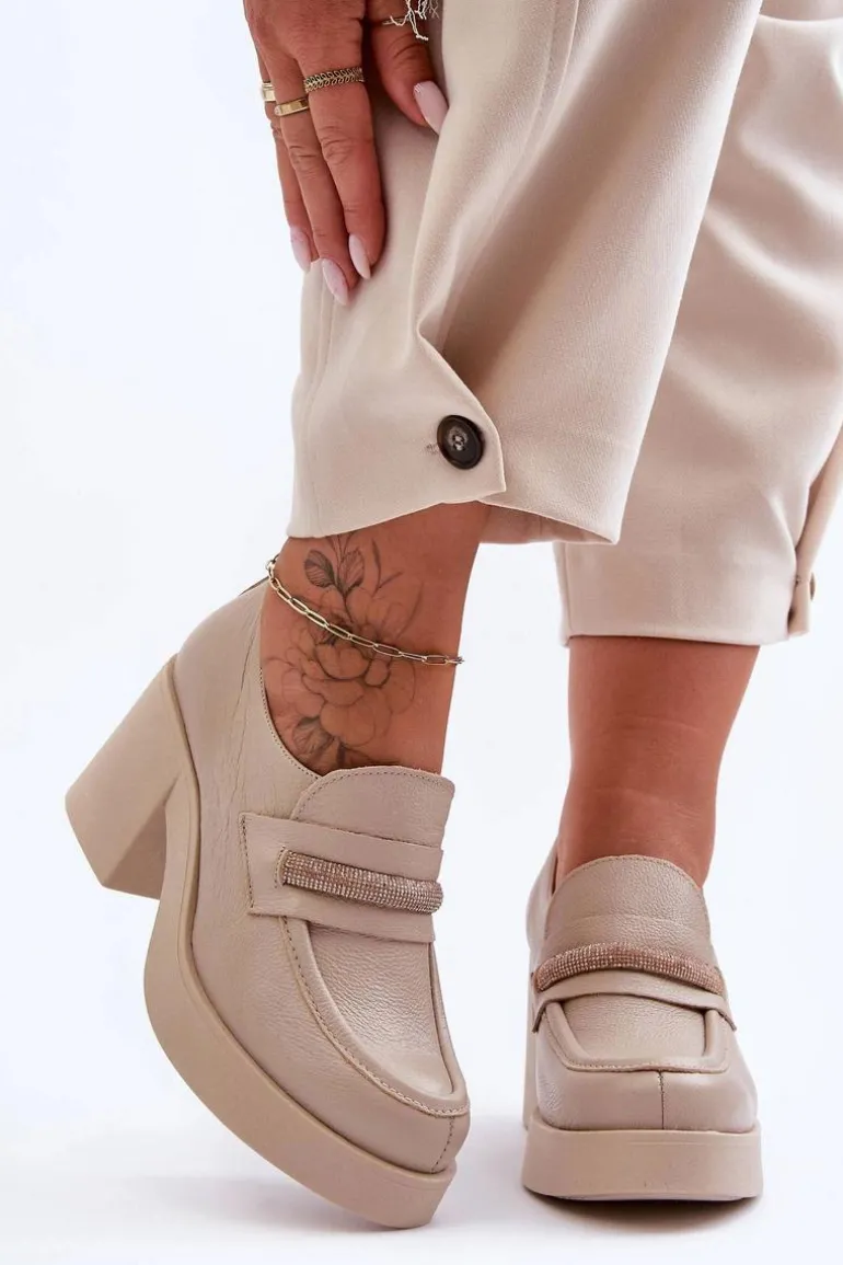 Damskie półbuty na obcasie z cholewką wykonaną ze skóry naturalnej. Wnętrze zostało pokryte również skórą naturalną dzięki temu są bardzo komfortowe w użytkowaniu. Z przodu znajduje się błyszcząca ozdoba. Stylowy obcas w postaci szerokiego słupka zapewni stabilizację na każdym kroku. Zapiętek jest usztywniany. Dodatkowo pod językiem znajduje się gumka ściągająca, która sprawi, że but będzie idealnie dopasowany do stopy. Przy wyborze rozmiaru prosimy sugerować się tabelą rozmiarów.
