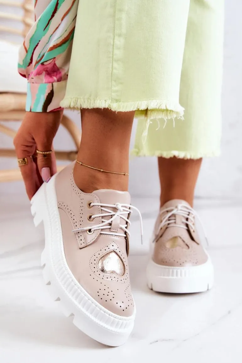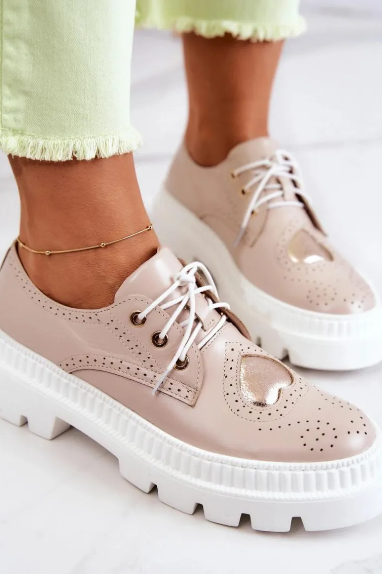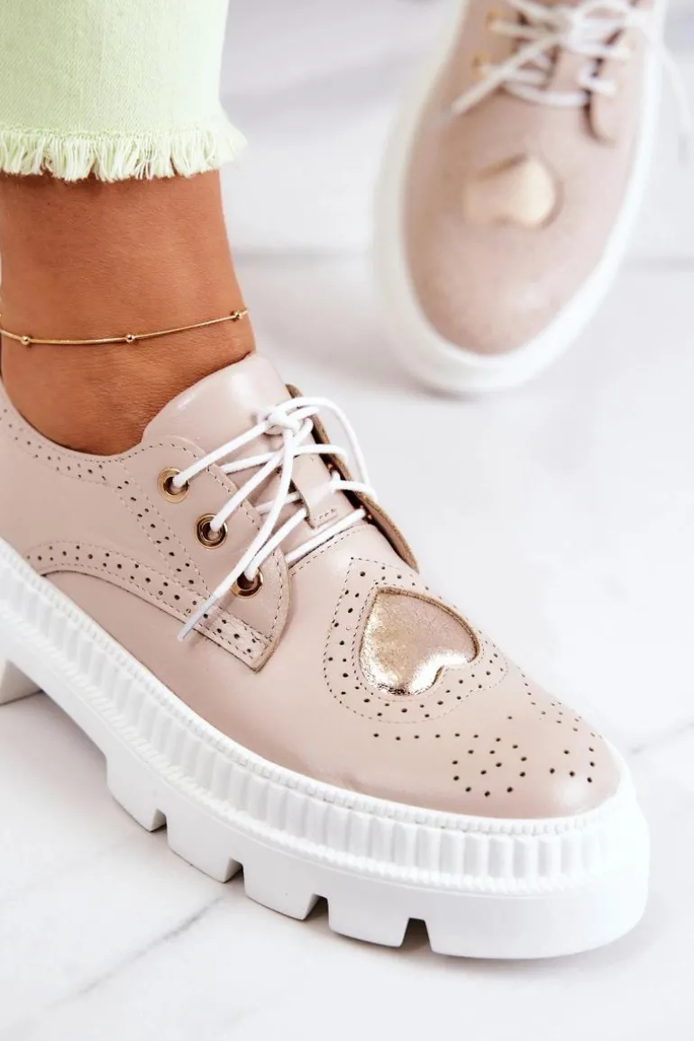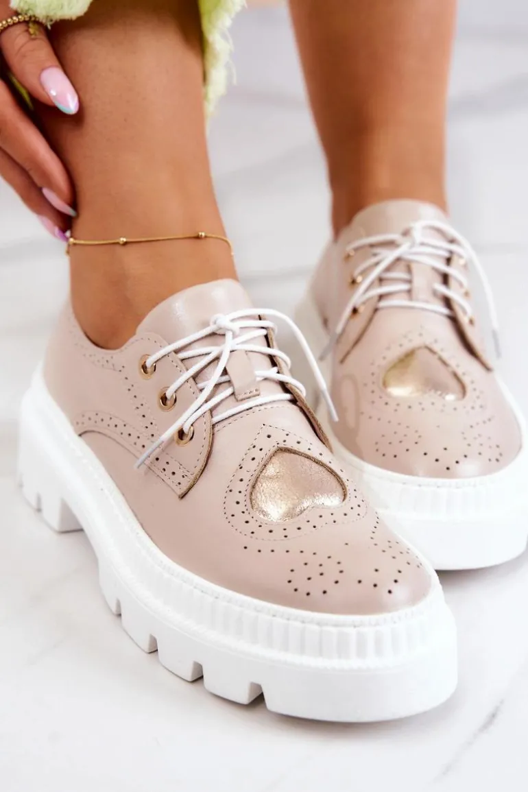 Model ten skradł serce niejednej miłośniczce modowych trendów! Półbuty zostały wykonane z naturalnej skóry z delikatna perforacją. Zapiętek jest usztywniany. Klasyczne wiązanie sprawia, że odpowiednio dopasujesz buta do tęgości nogi. Urocze, ozdobne serce sprawia, że buty wyglądają niezwykle wyjątkowo. Miękka, skórzana wkładka oraz płaski obcas zapewniają wygodę przez cały dzień! Przy wyborze rozmiaru prosimy sugerować się tabelą rozmiarów.