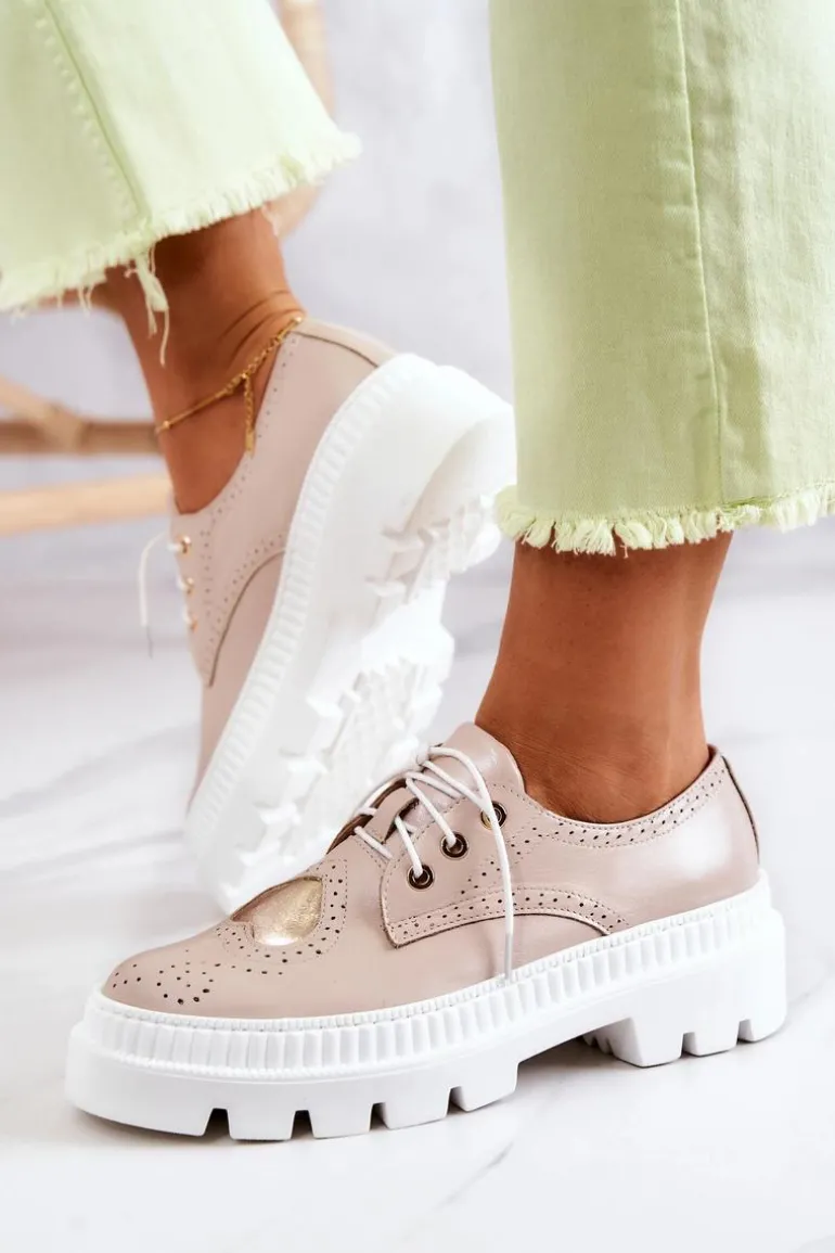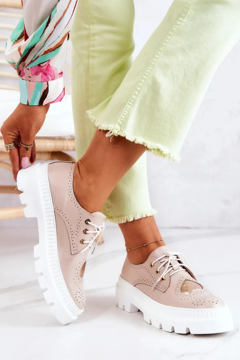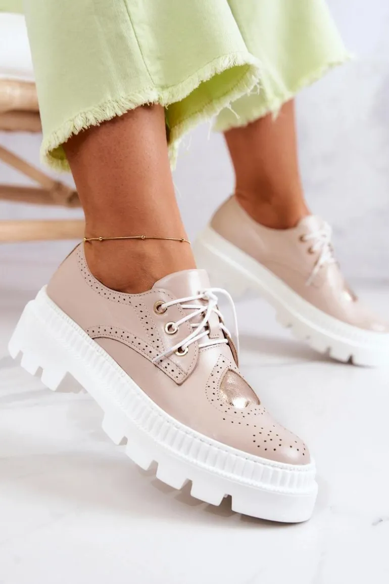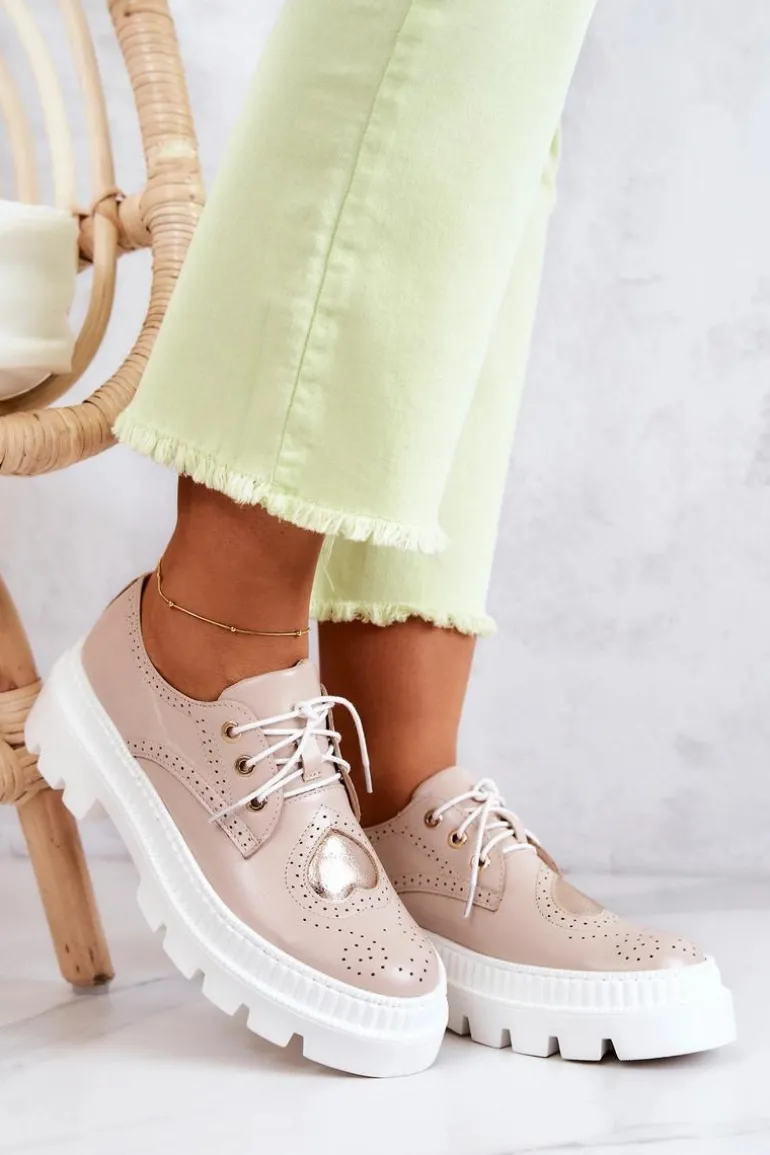 Model ten skradł serce niejednej miłośniczce modowych trendów! Półbuty zostały wykonane z naturalnej skóry z delikatna perforacją. Zapiętek jest usztywniany. Klasyczne wiązanie sprawia, że odpowiednio dopasujesz buta do tęgości nogi. Urocze, ozdobne serce sprawia, że buty wyglądają niezwykle wyjątkowo. Miękka, skórzana wkładka oraz płaski obcas zapewniają wygodę przez cały dzień! Przy wyborze rozmiaru prosimy sugerować się tabelą rozmiarów.
