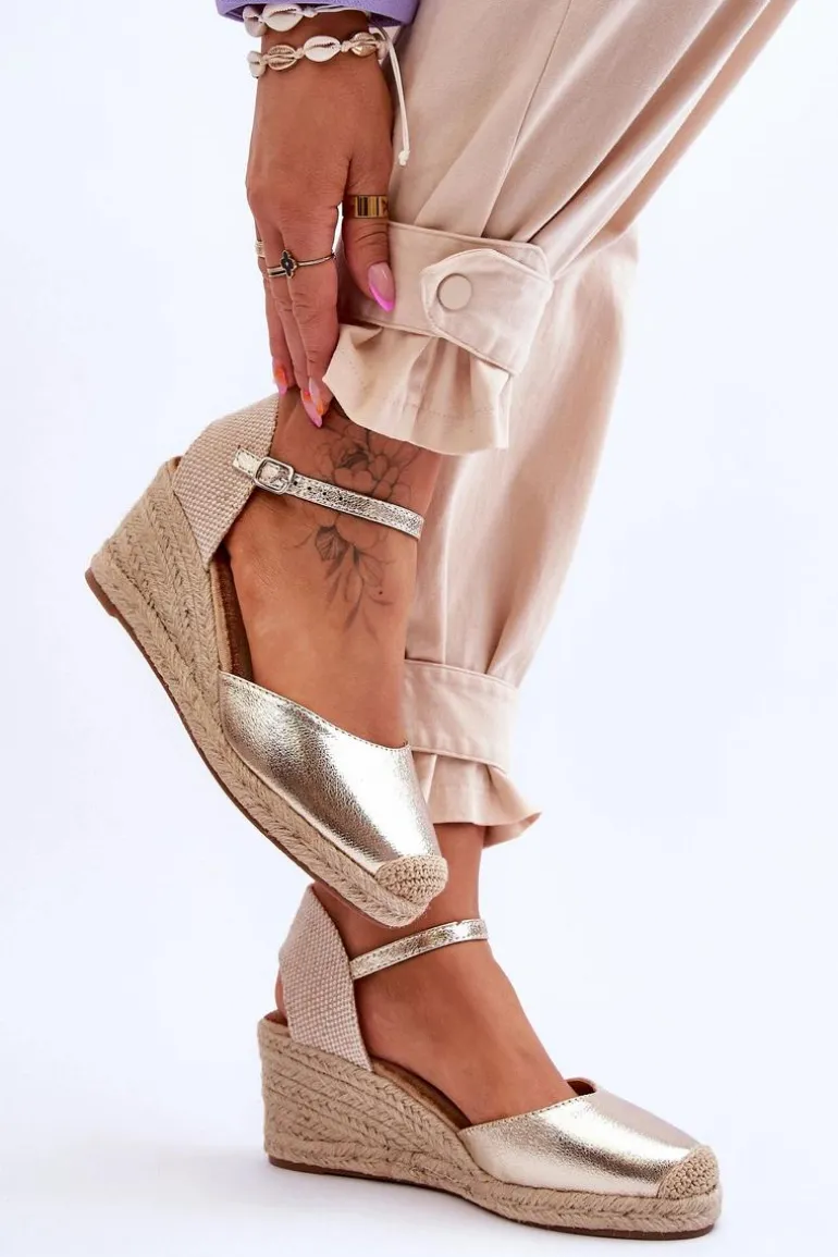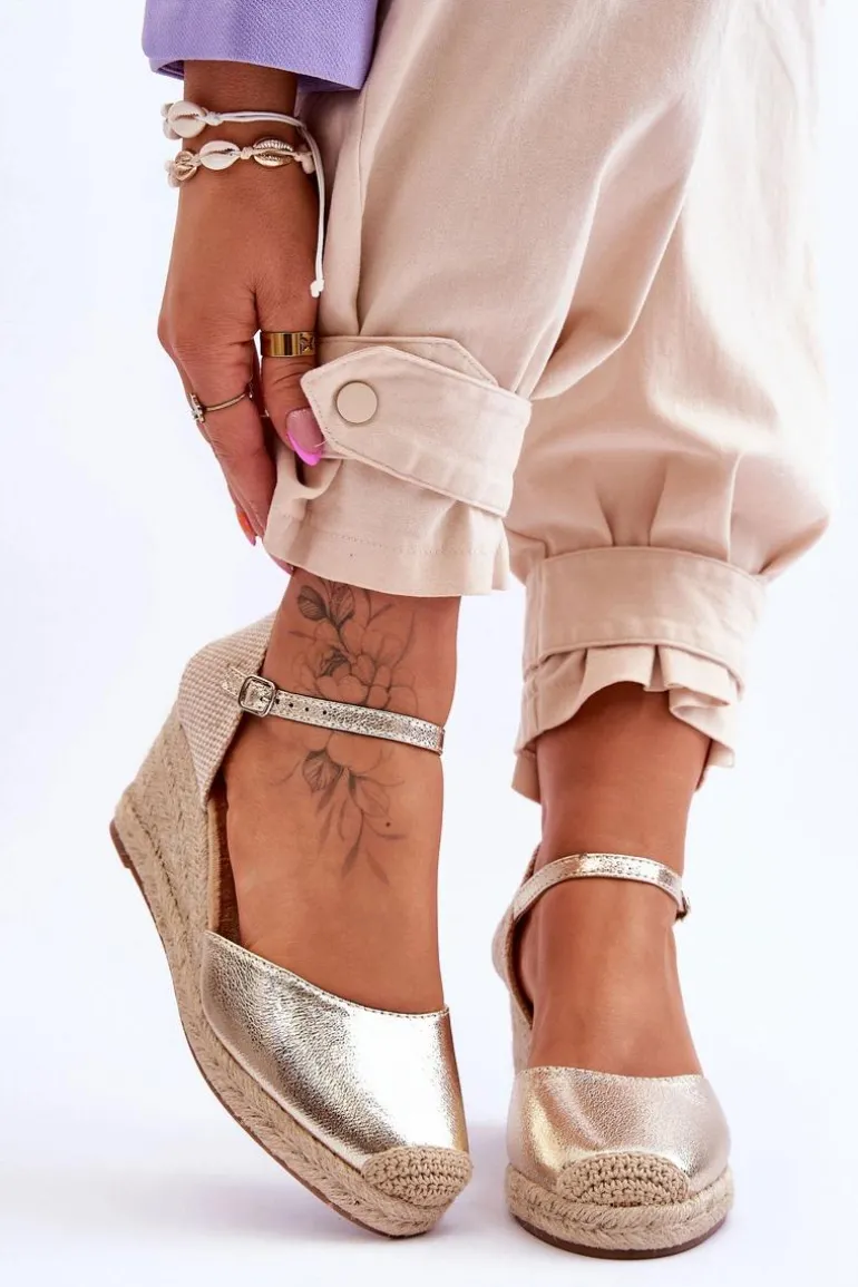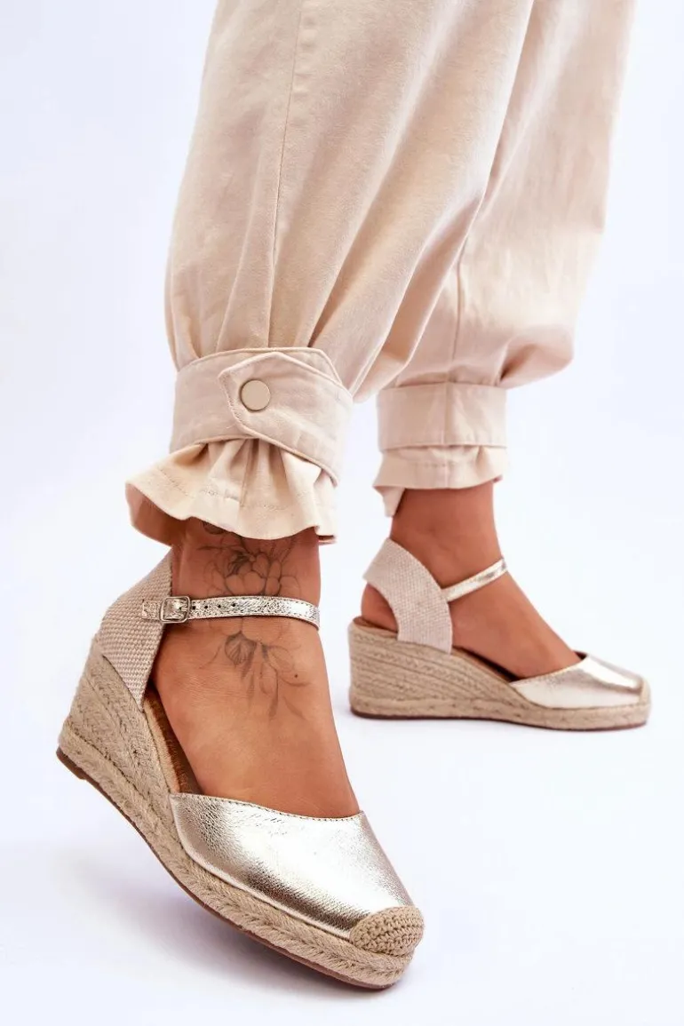 Skórzane Sandałki Espadryle Na Koturnie Złote Cammer