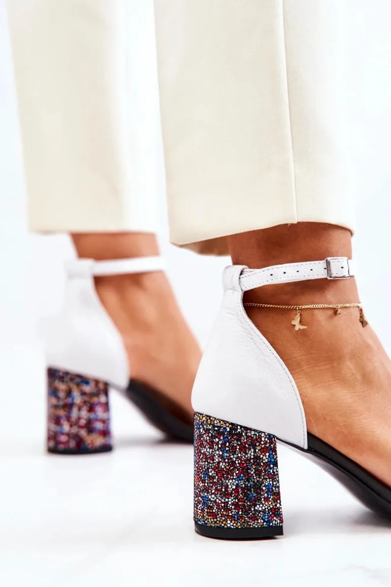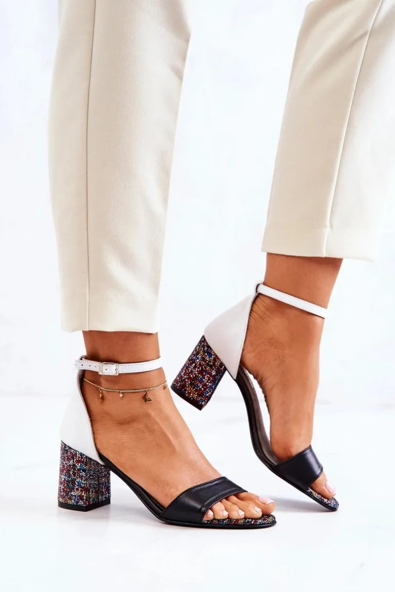 Skórzane Sandałki Na Słupku Czarno-Białe Lorene
