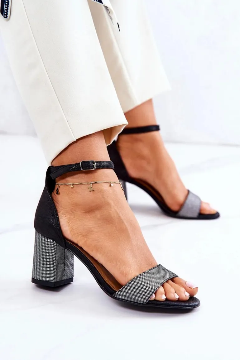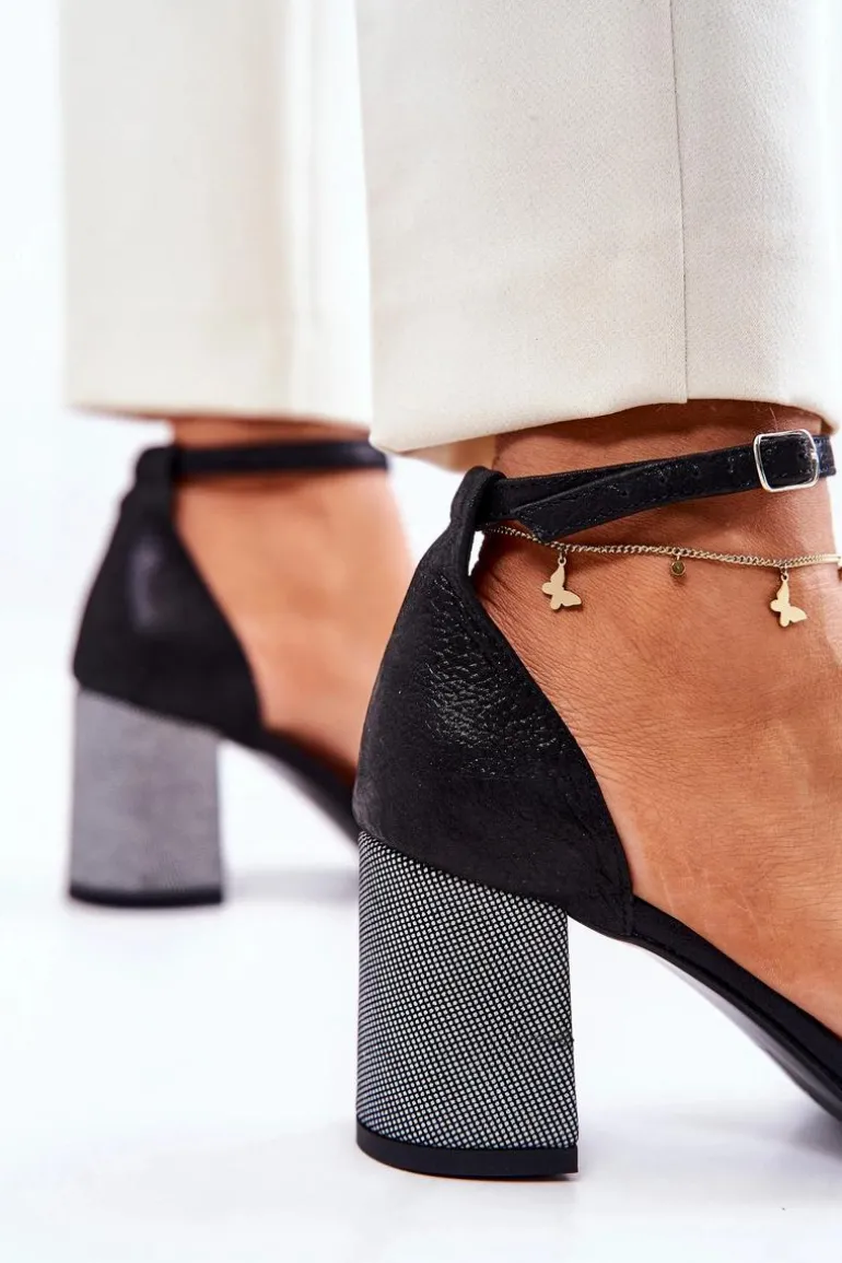 Skórzane Sandałki Na Słupku Czarno-Srebrne Lorene