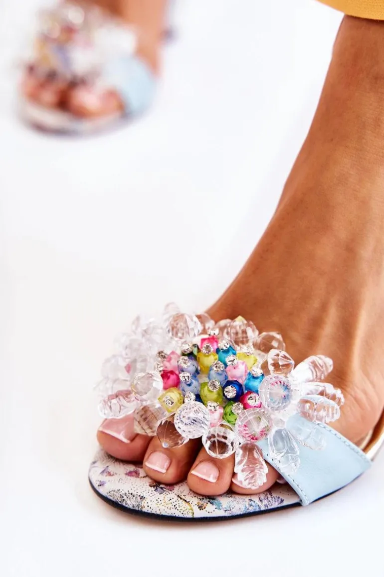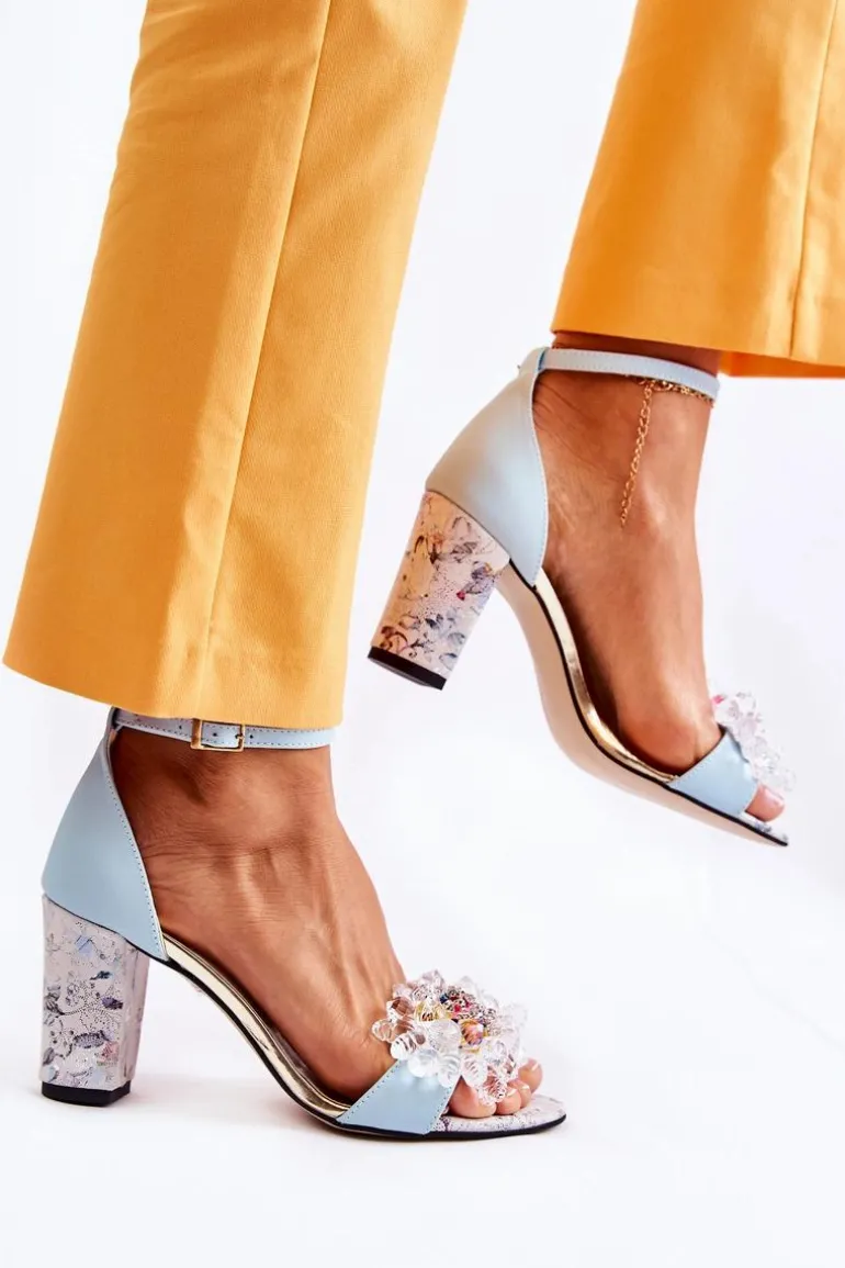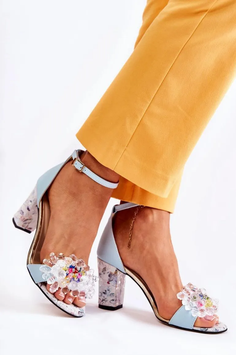 Wygodne sandały to marzenie każdej kobiety! Elegancki model został wykonany z naturalnej skóry. Stabilny, szeroki słupek zapewni Ci gustowny wygląd. Miękka, skórzana wkładka to gwarancja komfortu przez cały dzień. Sandałki są zapinane na regulowany pasek ze sprzączką. Przedni paseczek posiada ozdoby w postaci imitacji kryształków i cyrkonii. Buty idealne na wiele okazji. Dodatkowo buty posiadają usztywniany zapiętek. Przy wyborze rozmiaru prosimy kierować tabelą rozmiarów.