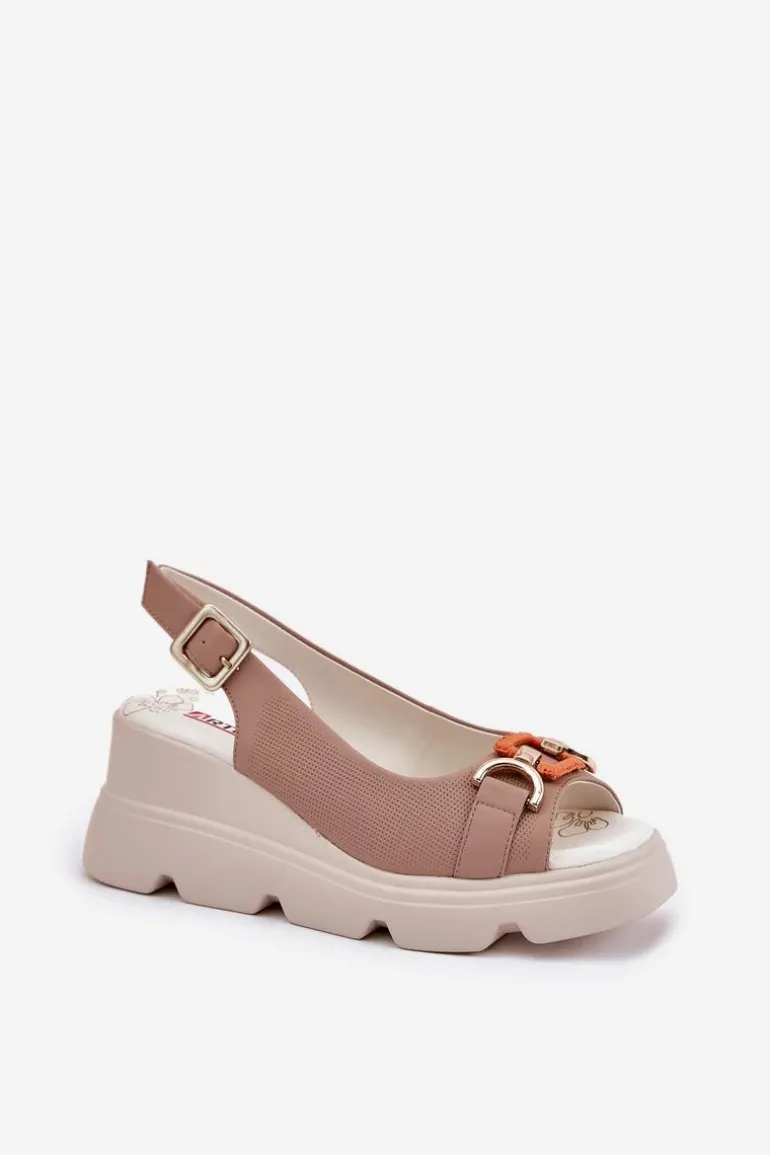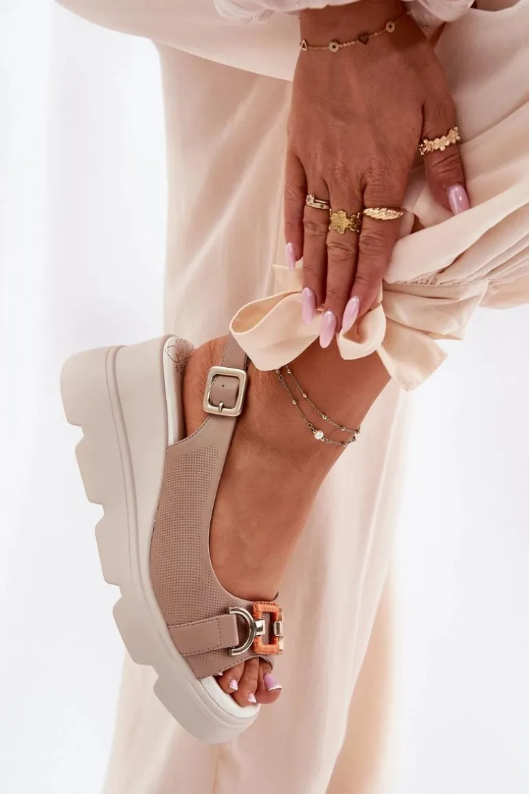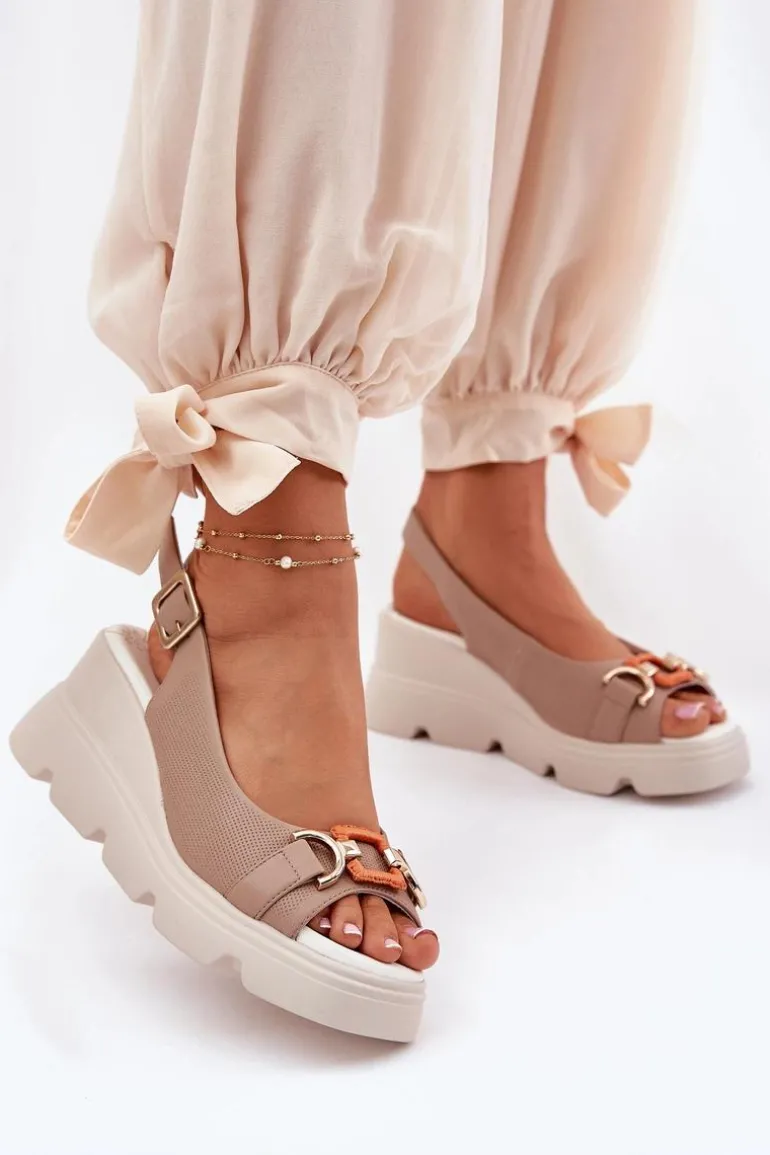 Damskie sandały wykonane z wysokiej jakości naturalnej skóry to połączenie elegancji i komfortu. Osadzone na platformie i koturnie, zapewniają wygodę oraz stabilność przez cały dzień. Z przodu znajduje się subtelny ozdobny detal, który dodaje im wyjątkowego charakteru. Miękka wkładka gwarantuje komfort noszenia, a zapinanie na klamrę z regulowanym paskiem umożliwia idealne dopasowanie do stopy. Te sandały to doskonały wybór do letnich stylizacji, idealne na różne okazje. Przy wyborze rozmiaru prosimy sugerować się tabelą rozmiarów.