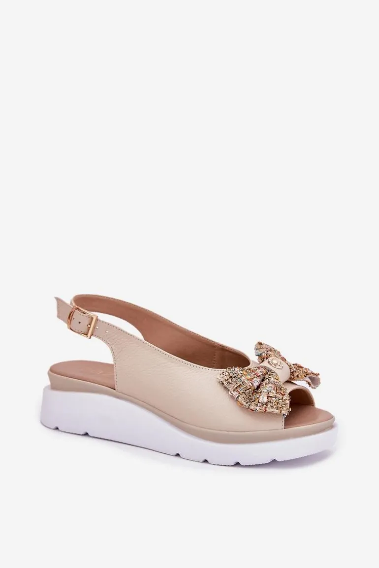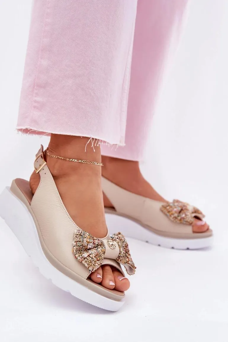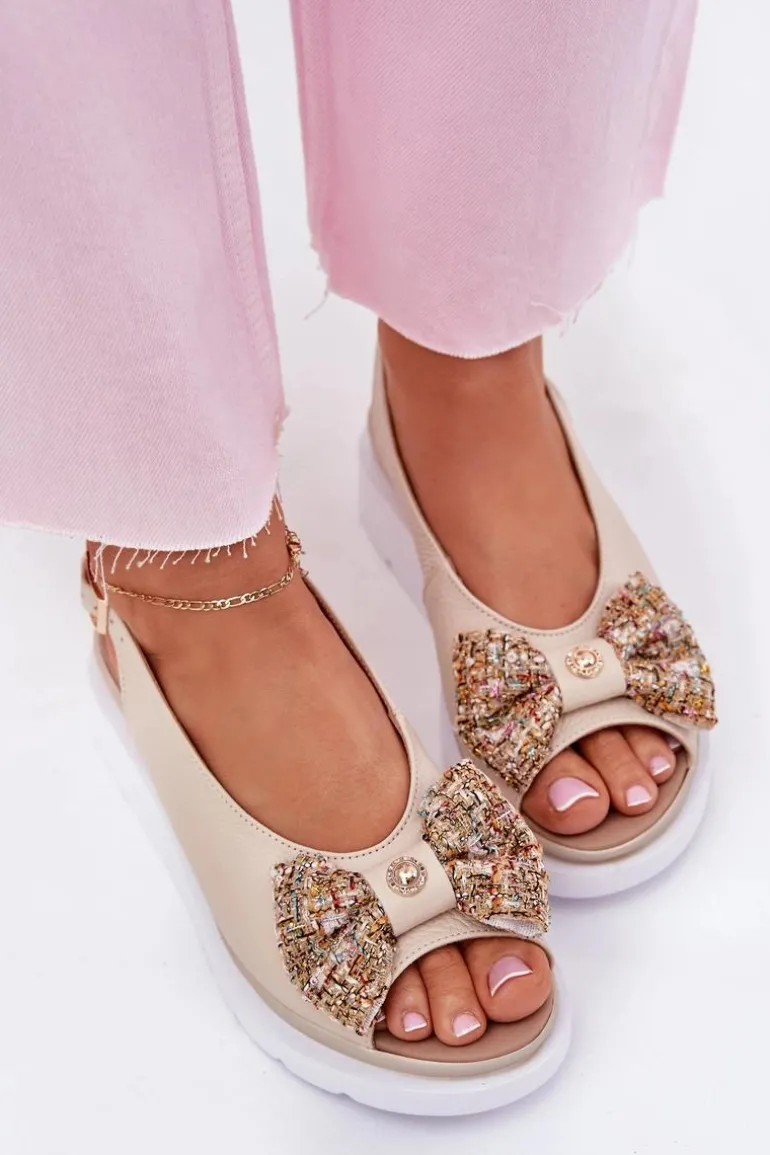 Sandały damskie z naturalnej skóry, osadzone na koturnie, to elegancka i wygodna opcja na letnie dni. Zapinane na klamrę z regulowanym paskiem, zapewniają doskonałe dopasowanie do stopy. Z przodu znajdują się urocza kokardka ze złotym detalem, która dodaje im subtelnego uroku. Doskonałe do sukienek, spódnic czy spodni, łączą komfort z modnym wyglądem. Idealne na codzienne wyjścia oraz specjalne okazje. Przy wyborze rozmiaru prosimy kierować się tabelą rozmiarów.
