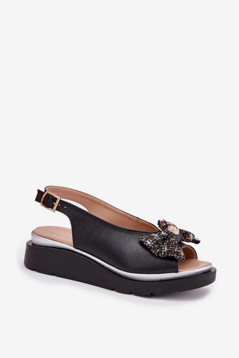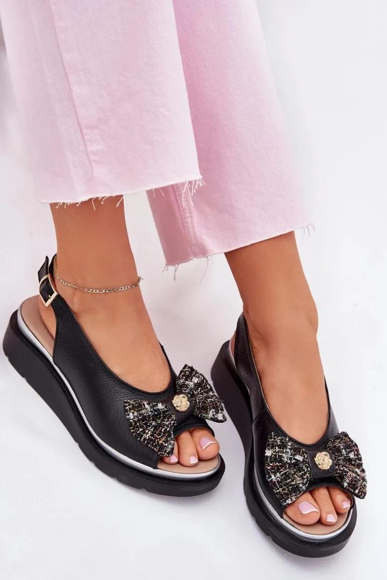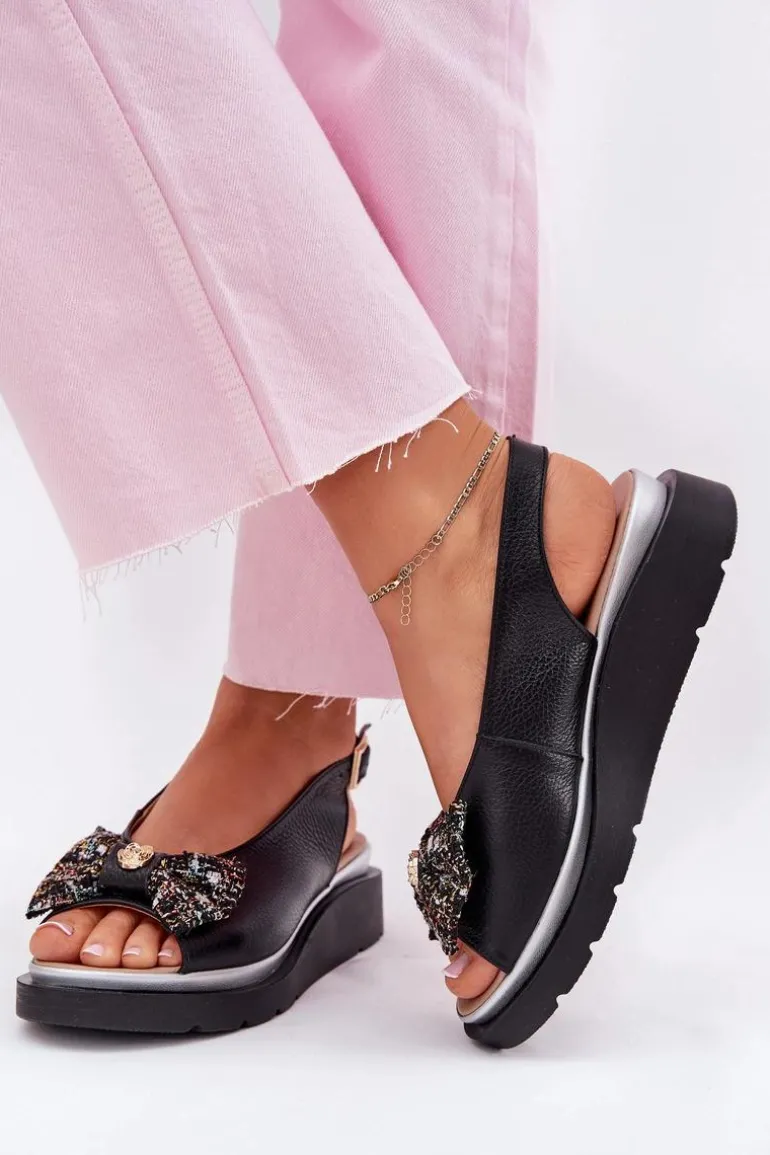 Sandały damskie z naturalnej skóry, osadzone na koturnie, to elegancka i wygodna opcja na letnie dni. Zapinane na klamrę z regulowanym paskiem, zapewniają doskonałe dopasowanie do stopy. Z przodu znajdują się urocza kokardka ze złotym detalem, która dodaje im subtelnego uroku. Doskonałe do sukienek, spódnic czy spodni, łączą komfort z modnym wyglądem. Idealne na codzienne wyjścia oraz specjalne okazje. Przy wyborze rozmiaru prosimy kierować się tabelą rozmiarów.