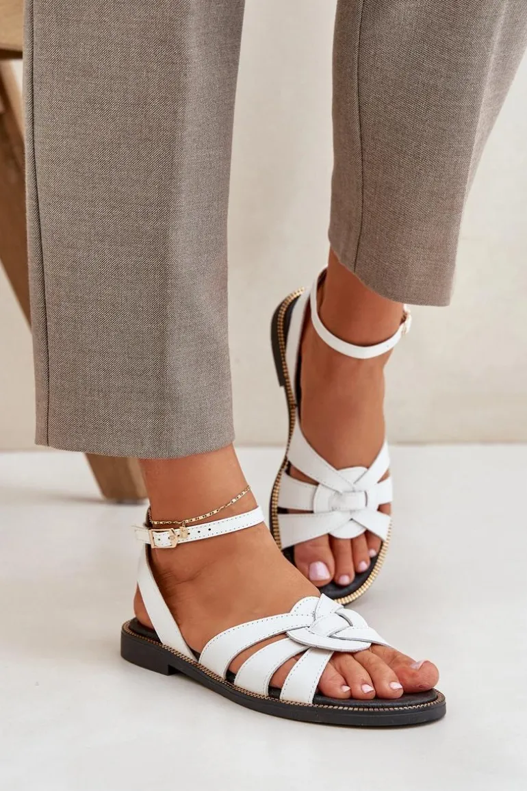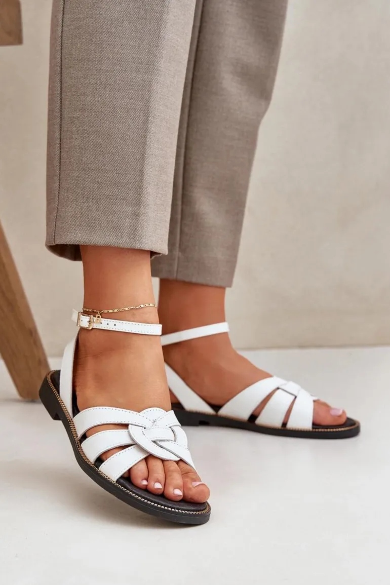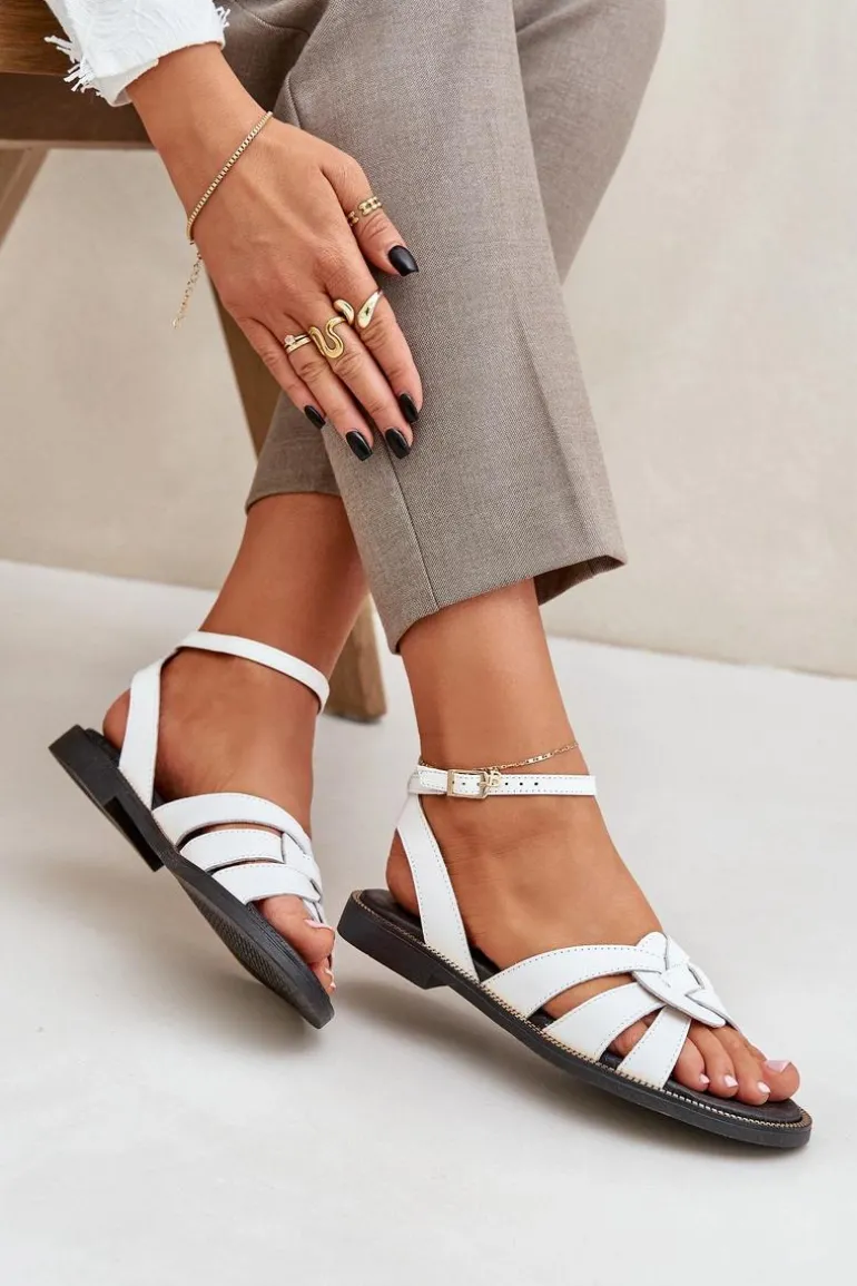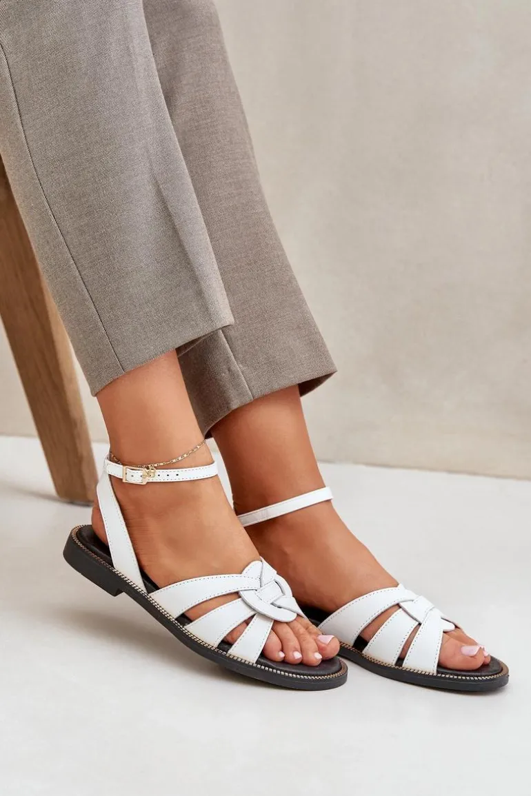 Skórzane Sandały Damskie Na Płaskim Obcasie Zazoo 3688 Białe