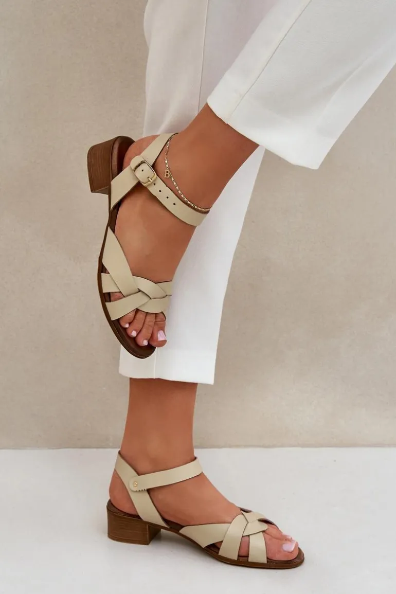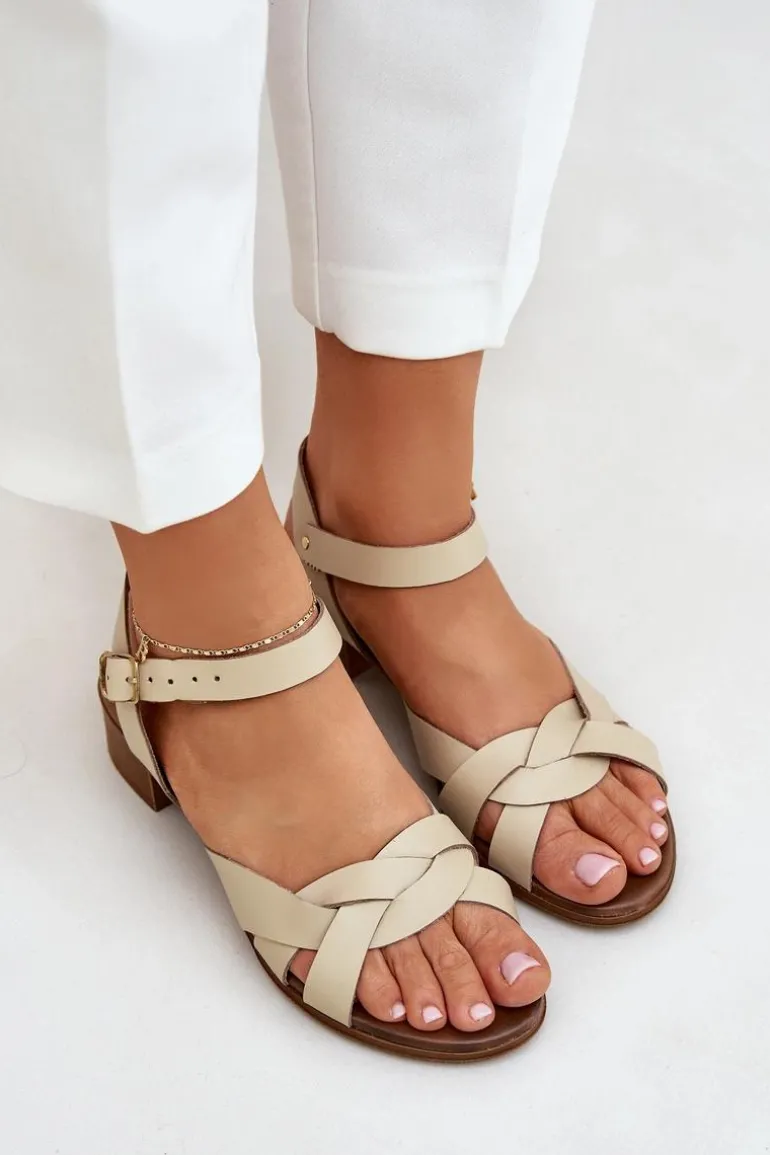 Sandały wykonane z naturalnej skóry to elegancka i komfortowa opcja na ciepłe dni. Osadzone na niskim obcasie, zapewniają wygodę i stabilność podczas chodzenia. Zapinane na regulowany pasek, co pozwala na idealne dopasowanie do stopy. Z przodu przeplatające się paseczki. Te sandały to doskonały wybór na letnie dni! Przy wyborze rozmiaru prosimy sugerować się tabelą rozmiarów.