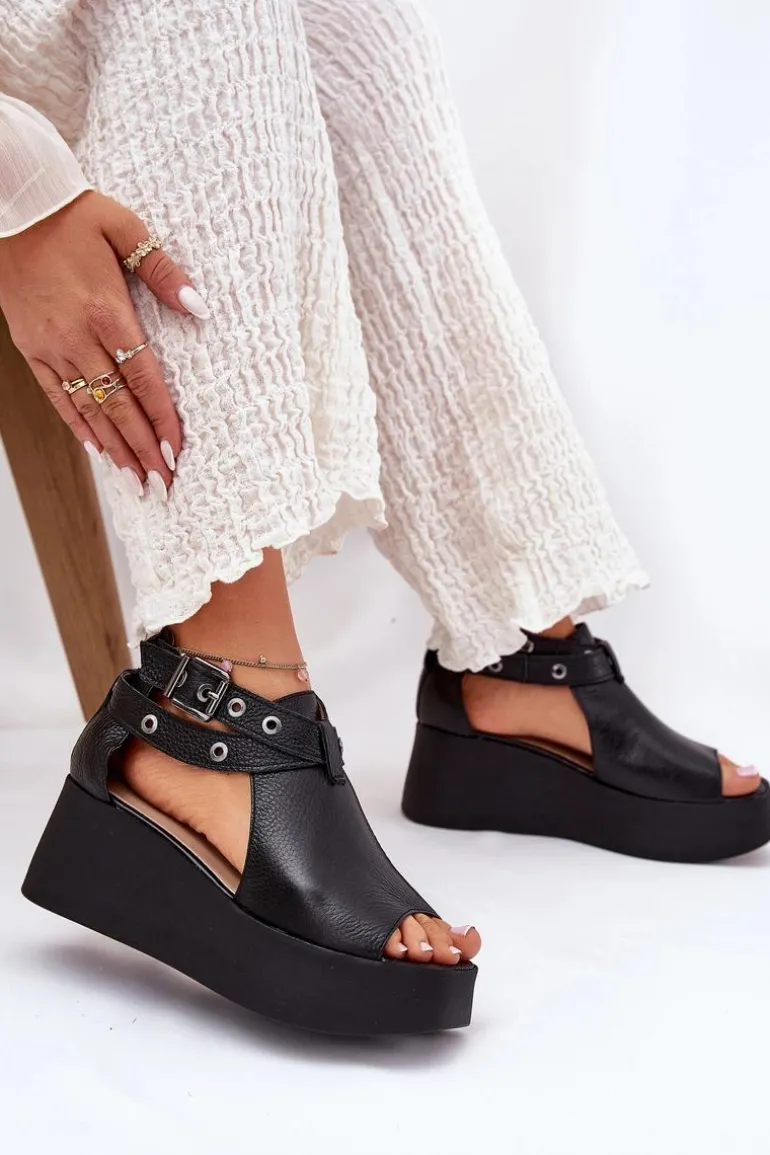 Sandały wykonane ze skóry naturalnej, są nie tylko stylowe, ale także trwałe i wygodne. Unikalny design dodaje uroku każdej letniej stylizacji, podkreślając indywidualny styl. Koturn wraz z platformą zapewniają dodatkową wysokość. Idealne dla kobiet, które cenią sobie modę i komfort w jednym! Przy wyborze rozmiaru prosimy kierować się tabelą rozmiarów.