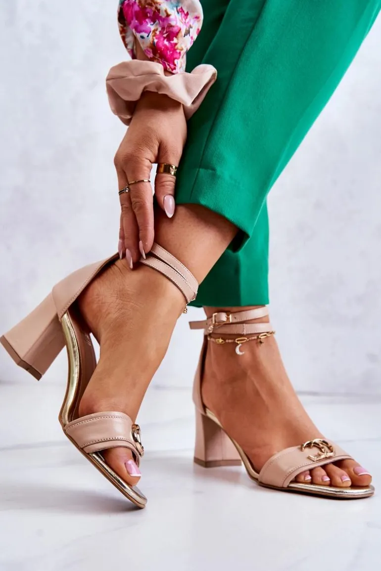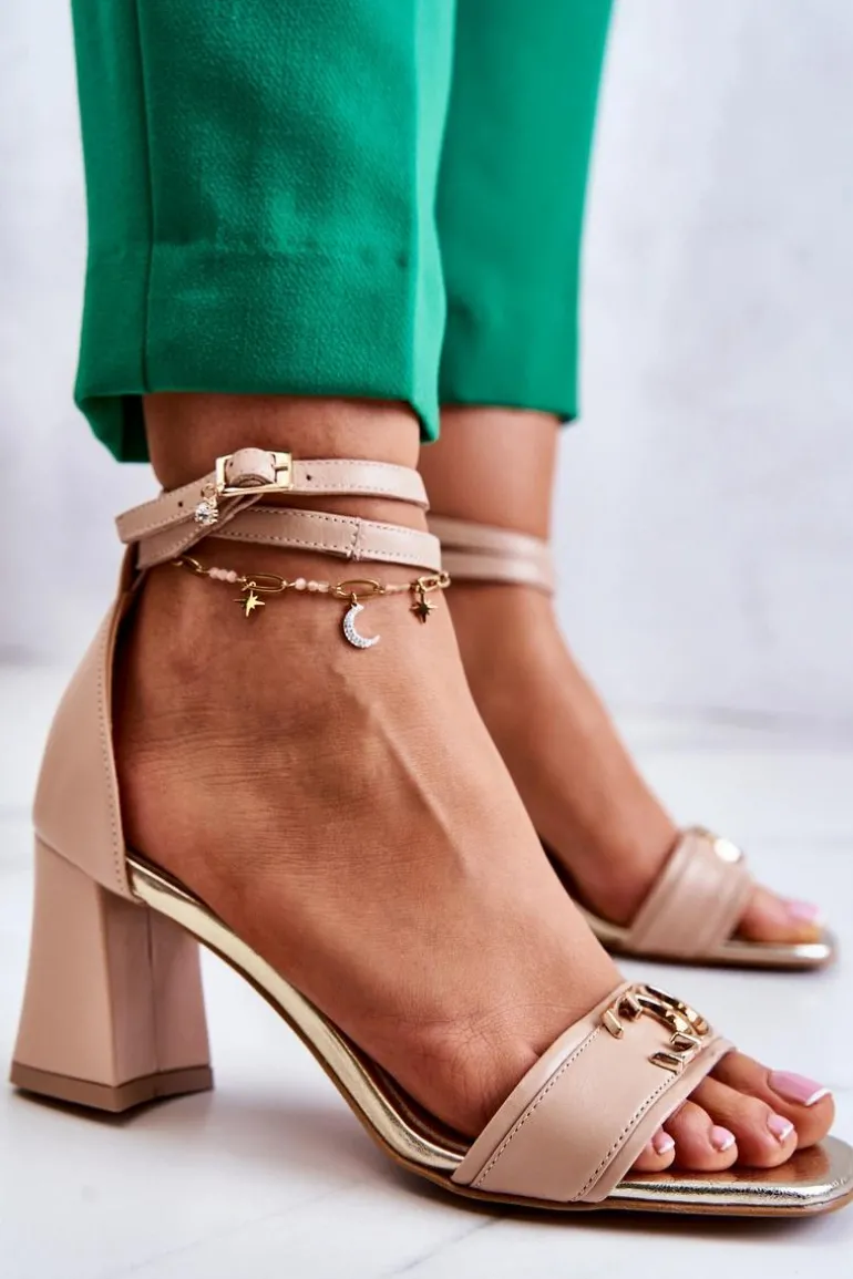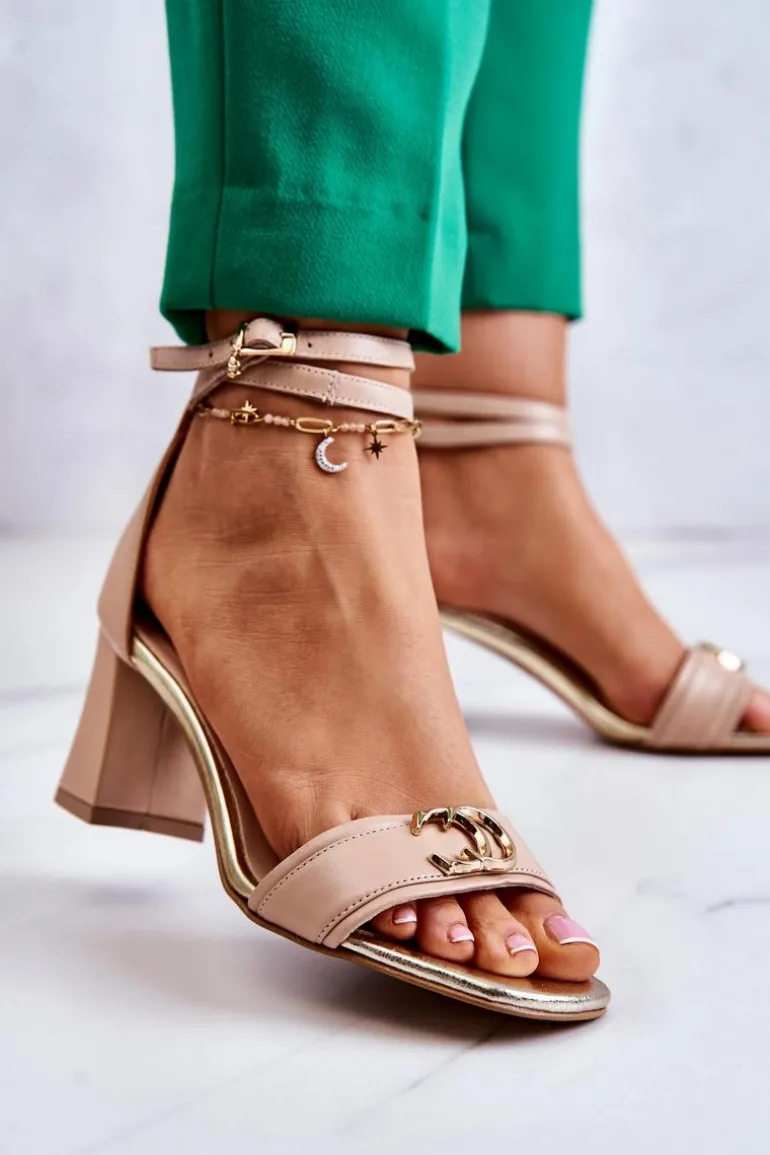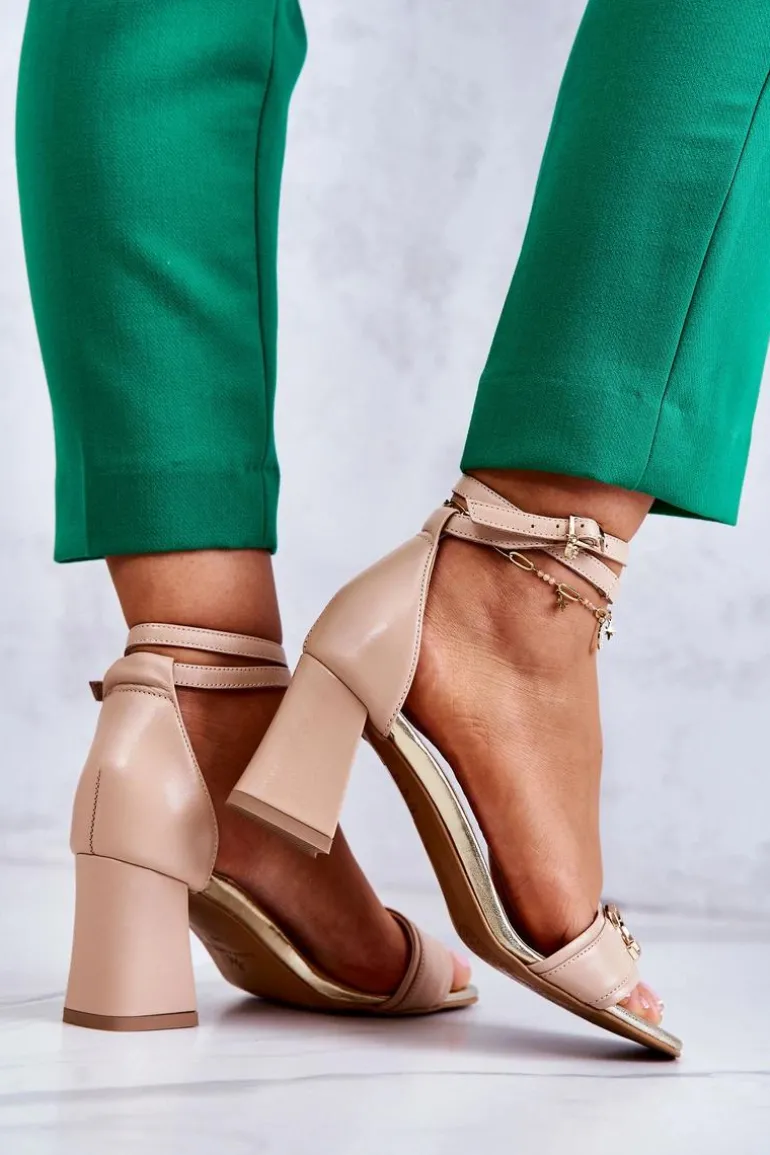 Cudowne sandały wykonane z naturalnej skóry. Posiadają ozdobę na przednim pasku wykonaną z tworzywa sztucznego. Miękka wkładka wykonana z naturalnej skóry zapewni komfort podczas użytkowania. Paseczek jest zapinany wokół kostki na sprzączkę i jest regulowany. Dodatkowo przy sprzączce znajduje się ozdoba w postaci dżetu imitującego cyrkonię. Obcas w postaci słupka jest stabilny i wygodny. Buty świetnie sprawdzą się na spotkania biznesowe, podczas uroczystości rodzinnych czy imprezach ze znajomymi. Przy wyborze rozmiaru prosimy sugerować się tabelą rozmiarów.