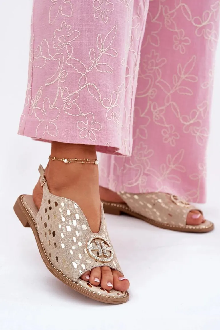 Damskie sandały z naturalnej skóry zamszowej to elegancka propozycja na letnie dni. Osadzone na płaskim obcasie, zapewniają wygodę i komfort przez cały dzień. Zapinane na sprzączkę, pozwalają na idealne dopasowanie do stopy. Z przodu znajduje się subtelna ozdoba, która nadaje im wyjątkowego charakteru. Skórzana wkładka gwarantuje dodatkową wygodę, czyniąc te sandały doskonałym wyborem do eleganckich letnich stylizacji. Przy wyborze rozmiaru prosimy kierować się tabelą rozmiarów.