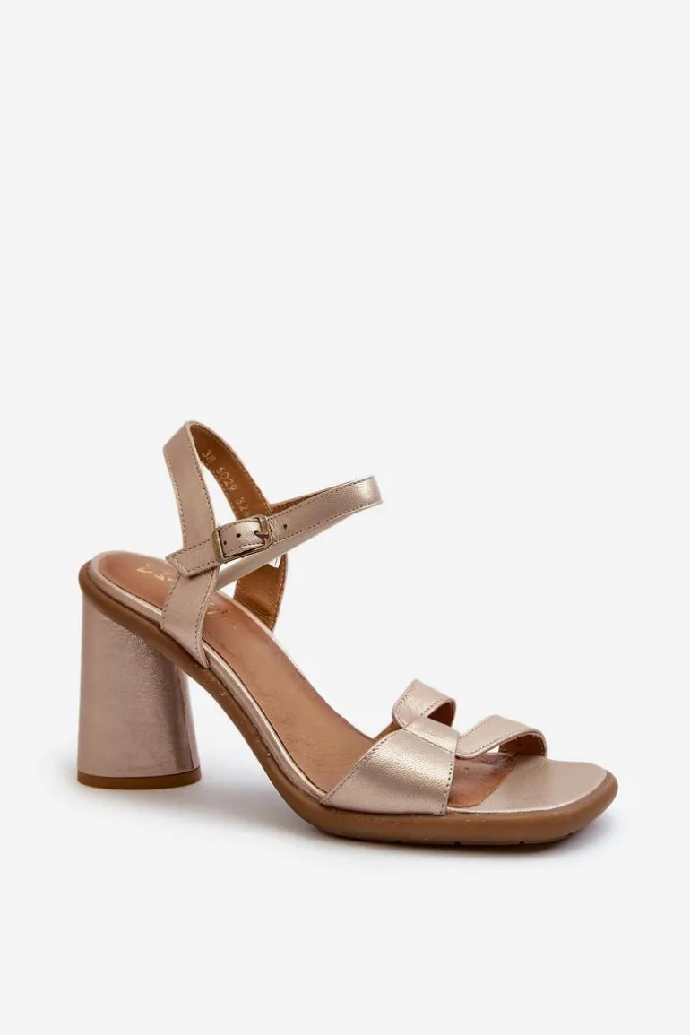 Modne, damskie sandały zostały wykonane z naturalnej skóry. Model ten posiada miękką wkładkę, która jest niezwykle wygodna podczas użytkowania. Sandałki osadzono obcasie w postaci trójkątnego słupka. Są zapinane na regulowany pasek ze sprzączką. Idealne obuwie na różnego rodzaju uroczystości czy ważne spotkania w letnie dni! Przy wyborze rozmiaru prosimy sugerować się tabelą rozmiarów.