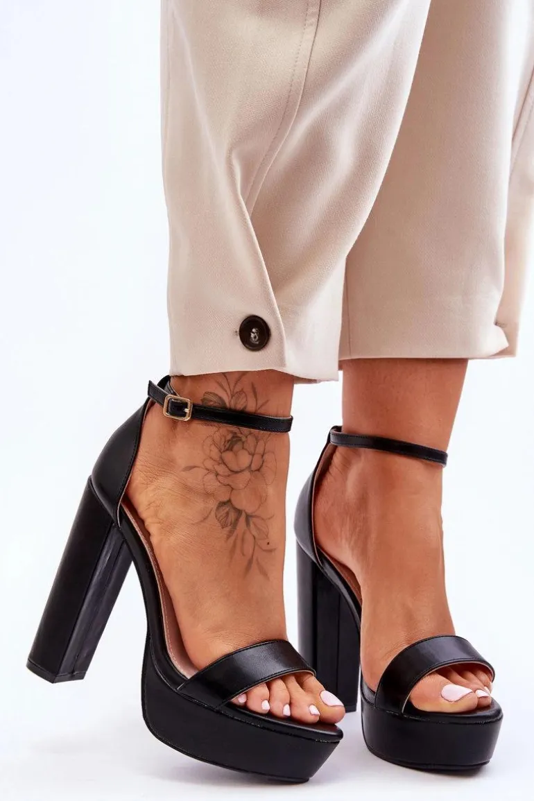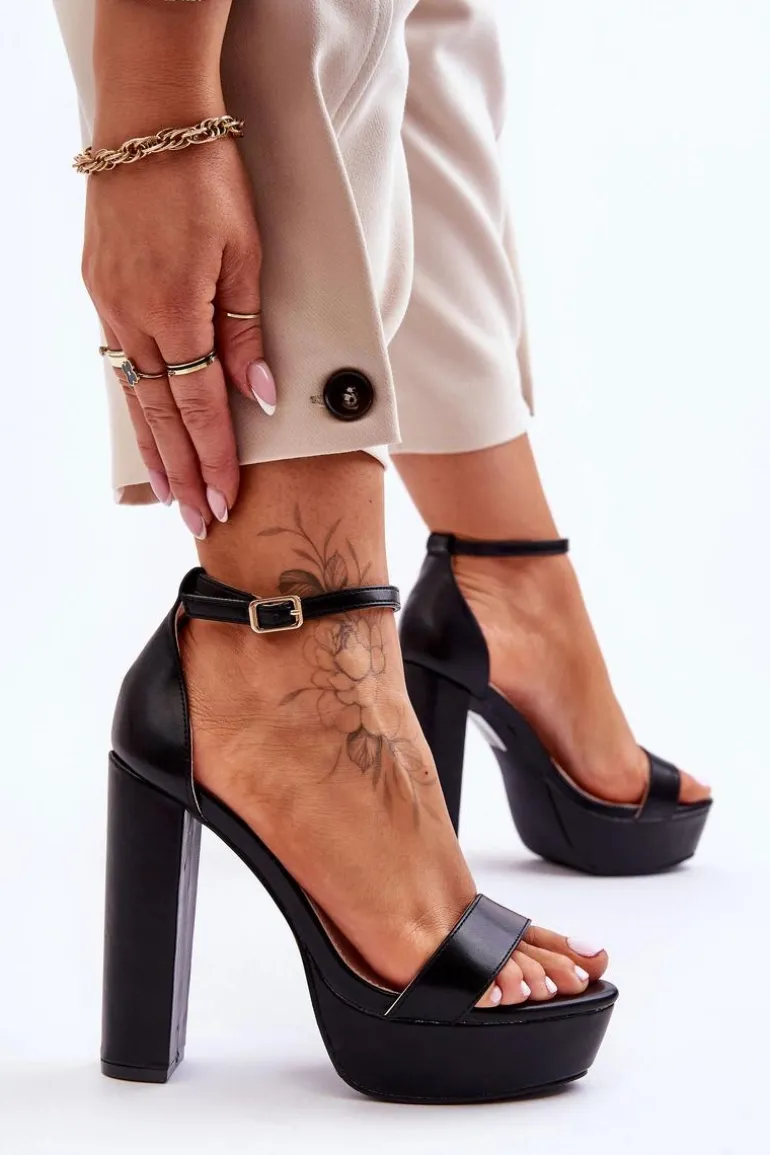 Damskie sandałki zostały wykonane z eko skóry. Model ten posiada na przodzie pasek przytrzymujący stopę przed przesuwaniem. Sandałki osadzono na obcasie w postaci wysokiego słupka oraz platformie. Dodatkowo sandałki posiadają usztywniany zapiętek. Model ten jest zapinany na regulowany pasek ze sprzączką. Przy wyborze rozmiaru prosimy sugerować się tabelą rozmiarów.