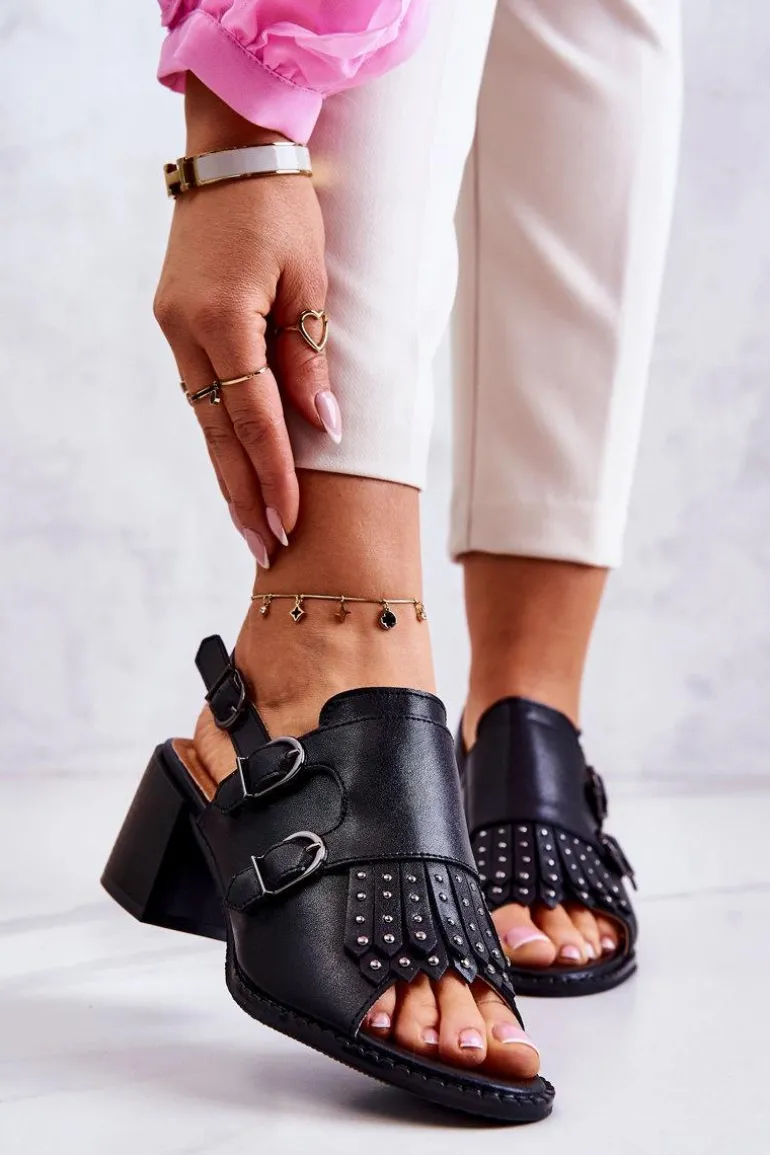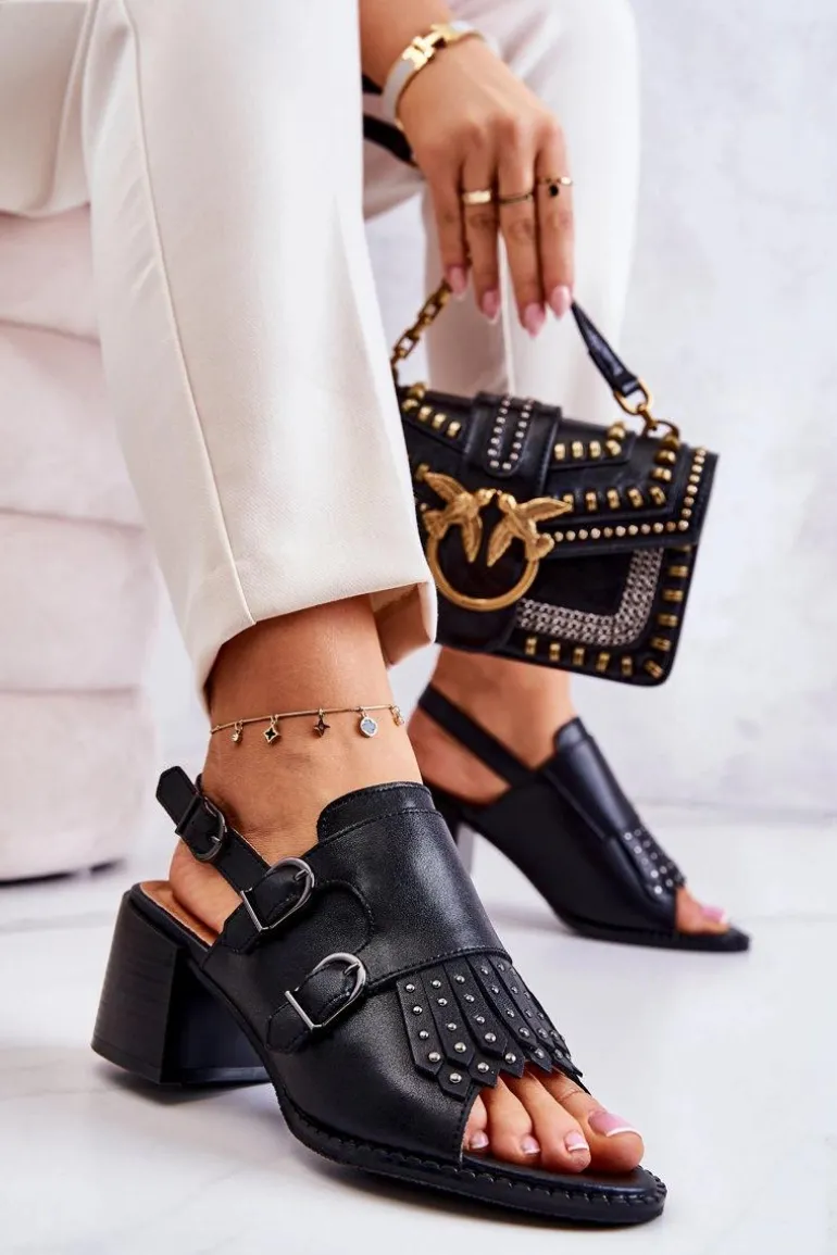 Sandały wykonane z eko skóry utrzymane w jednolitej kolorystyce. Osadzone na masywnym obcasie w postaci słupka. Ozdobione ćwiekami oraz sprzączkami z przodu cholewki. Posiadają regulowany pasek zapinany wokół kostki na sprzączkę. Wkładka z naturalnej skóry zapewni komfortowe użytkowanie. Uniwersalne, a jednocześnie eleganckie sandałki będą pasować do wielu outfitów! Koniecznie powinnaś je mieć w swojej szafie! Przy wyborze rozmiaru prosimy sugerować się tabelą rozmiarów.
