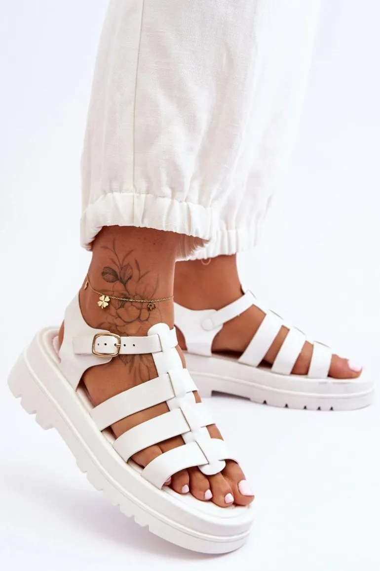 Przewiewne sandały damskie zostały wykonane z eko skóry. Zapinane na regulowany pasek ze sprzączką. Sandałki posiadają odkryty, lekko kwadratowy nosek oraz odkrytą piętę. Miękka, eko skórzana wkładka zapewni wygodę podczas użytkowania. Płaski obcas oraz platforma sprawiają, że buty są niezwykle stabilne. Te sandałki to idealny fason na upalne dni. Świetnie będą prezentować się z zarówno ze spodniami, jak i sukienkami. Przy wyborze rozmiaru prosimy sugerować się tabelą rozmiarów.