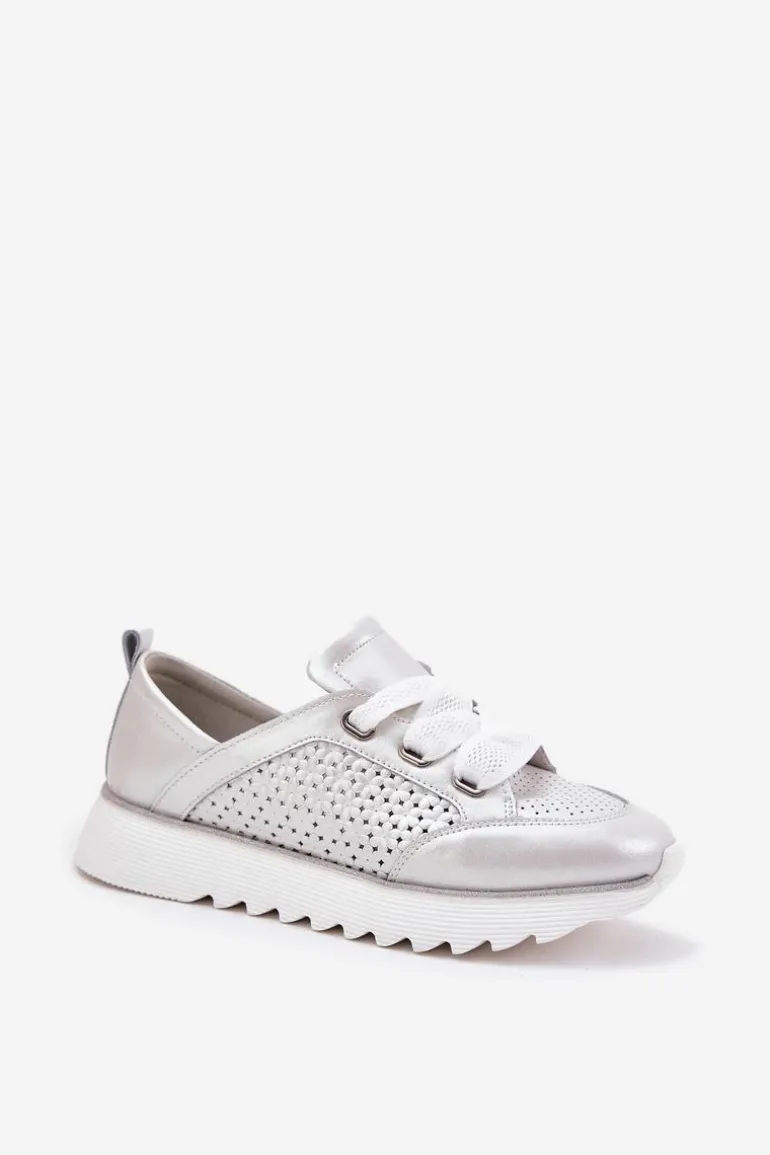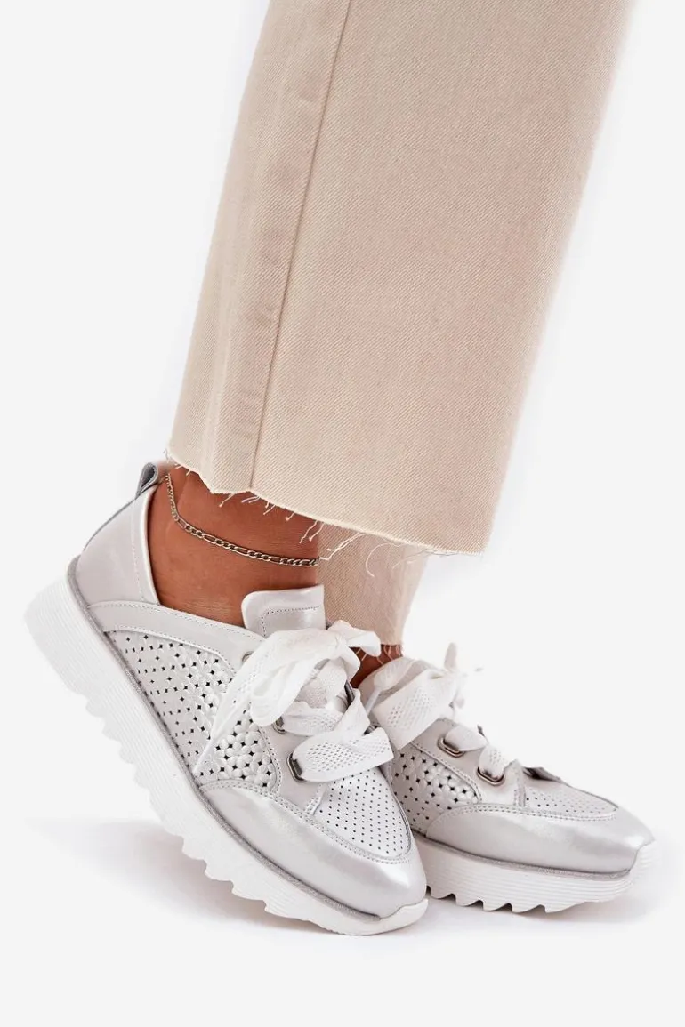 Damskie buty sportowe wykonane z naturalnej skóry to połączenie stylu i komfortu. Osadzone na platformie z brokatowym wykończeniem. Cholewka z ażurowym wzorem nadaje im lekkości i oryginalności, a grube sznurowanie zapewnia idealne dopasowanie do stopy. Miękka wkładka dba o komfort przez cały dzień, czyniąc te buty doskonałym wyborem do codziennych looków. Idealne na każdą okazję, łączą funkcjonalność z modnym wyglądem. Przy wyborze rozmiaru prosimy sugerować się tabelą rozmiarów.