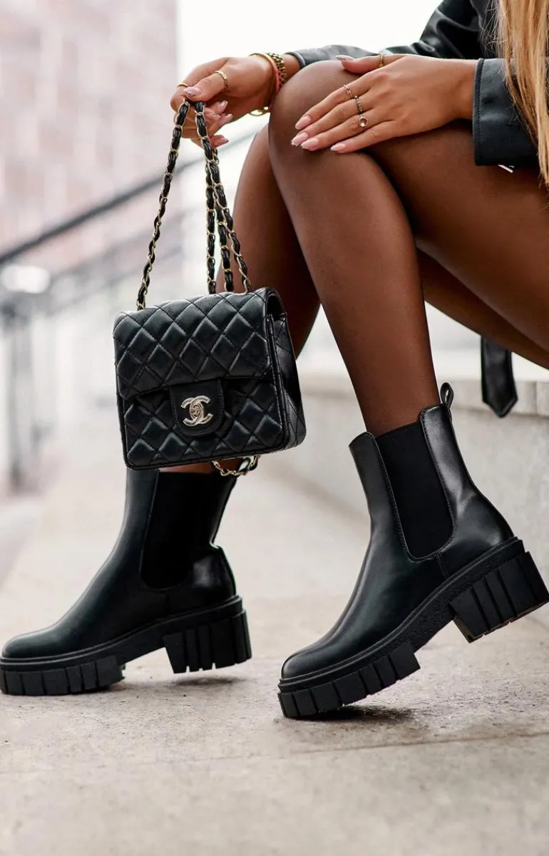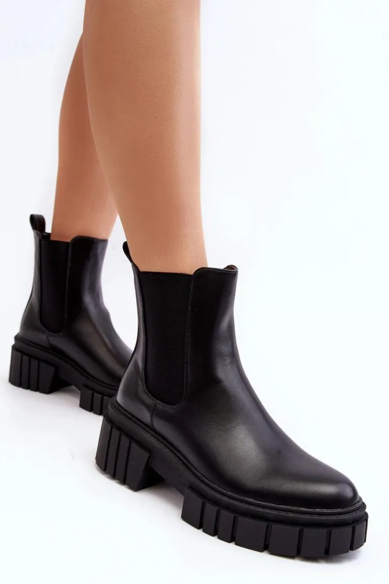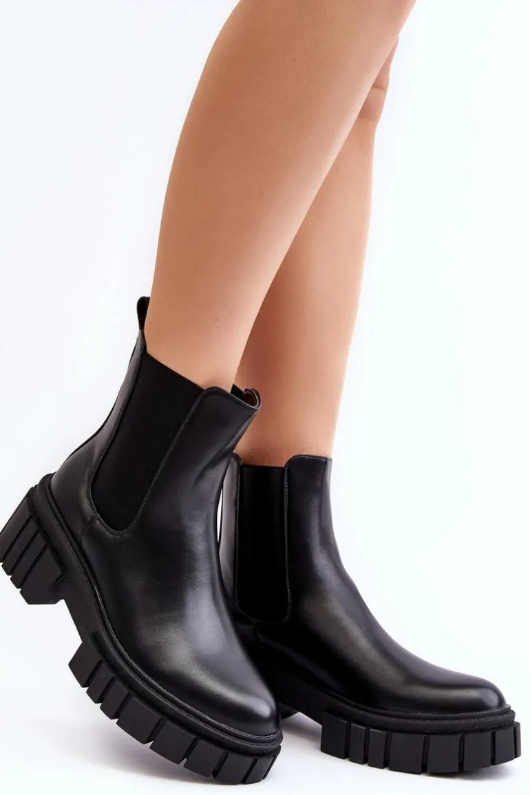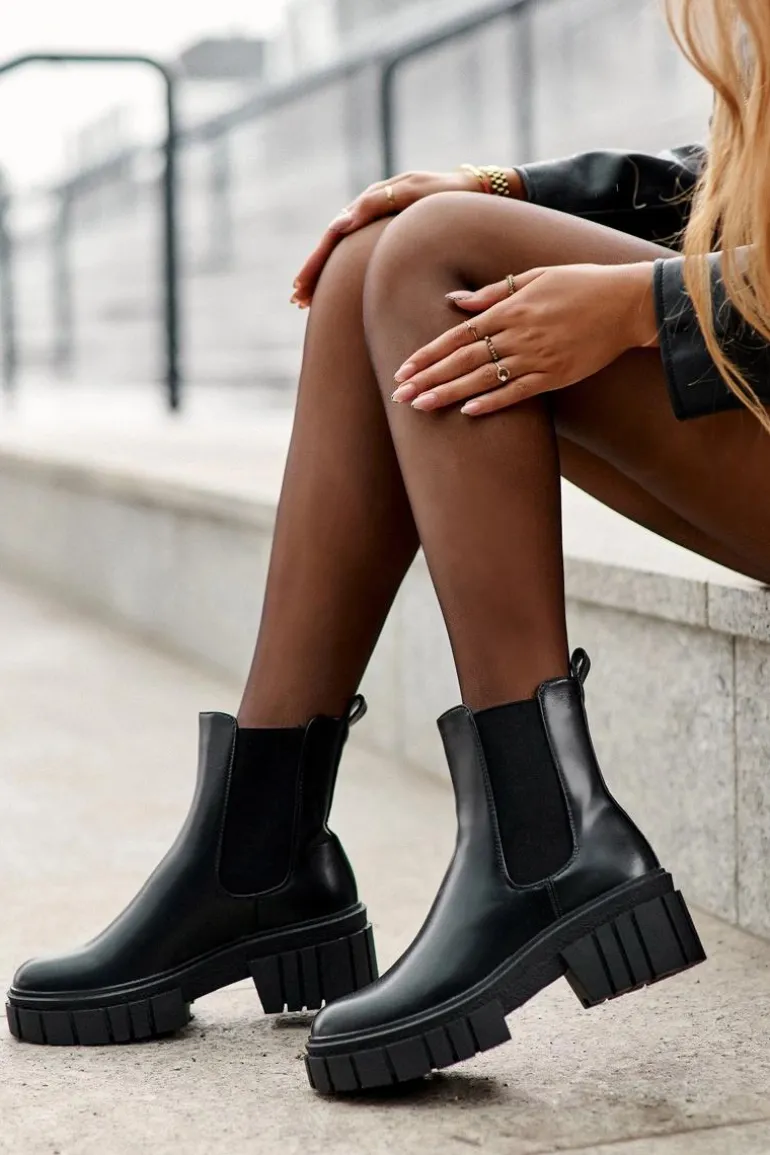 Botki damskie osadzone na masywnym płaskim obcasie i platformie. Wykonane z eko skóry. Model wsuwany. Elastyczne wstawki na bokach cholewki. Środek ocieplony kocem obuwniczym. Noski zaokrąglone, zapiętek usztywniony. Koniecznie powinnaś mieć ten model w swojej szafie! Przy wyborze rozmiaru prosimy sugerować się tabelą rozmiarów.