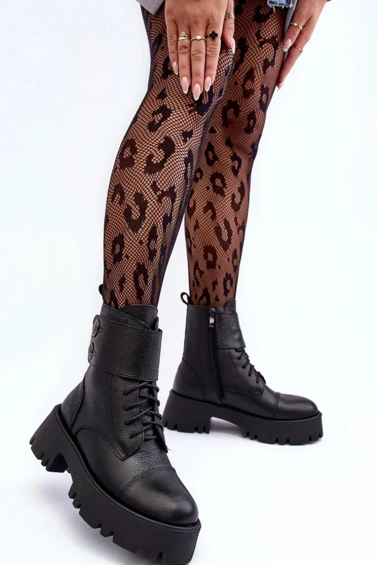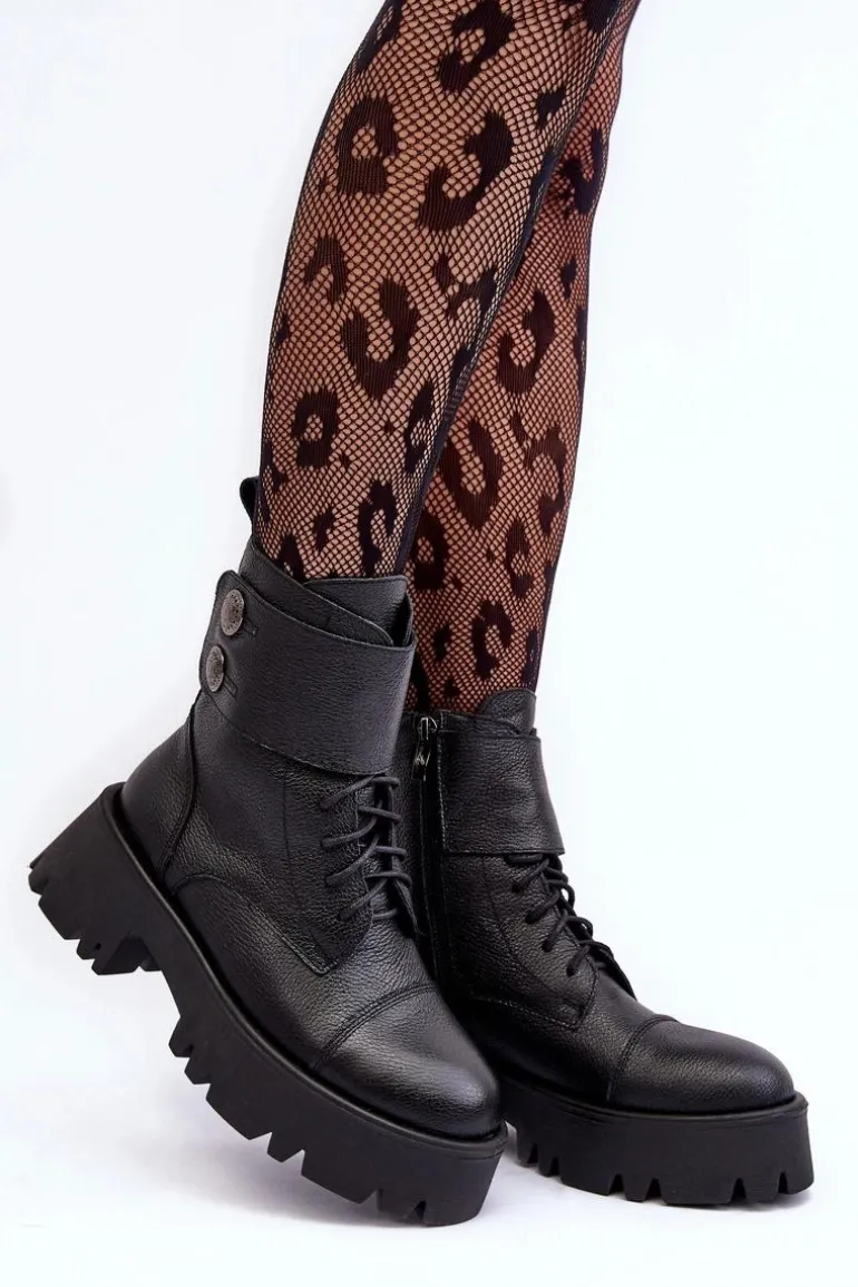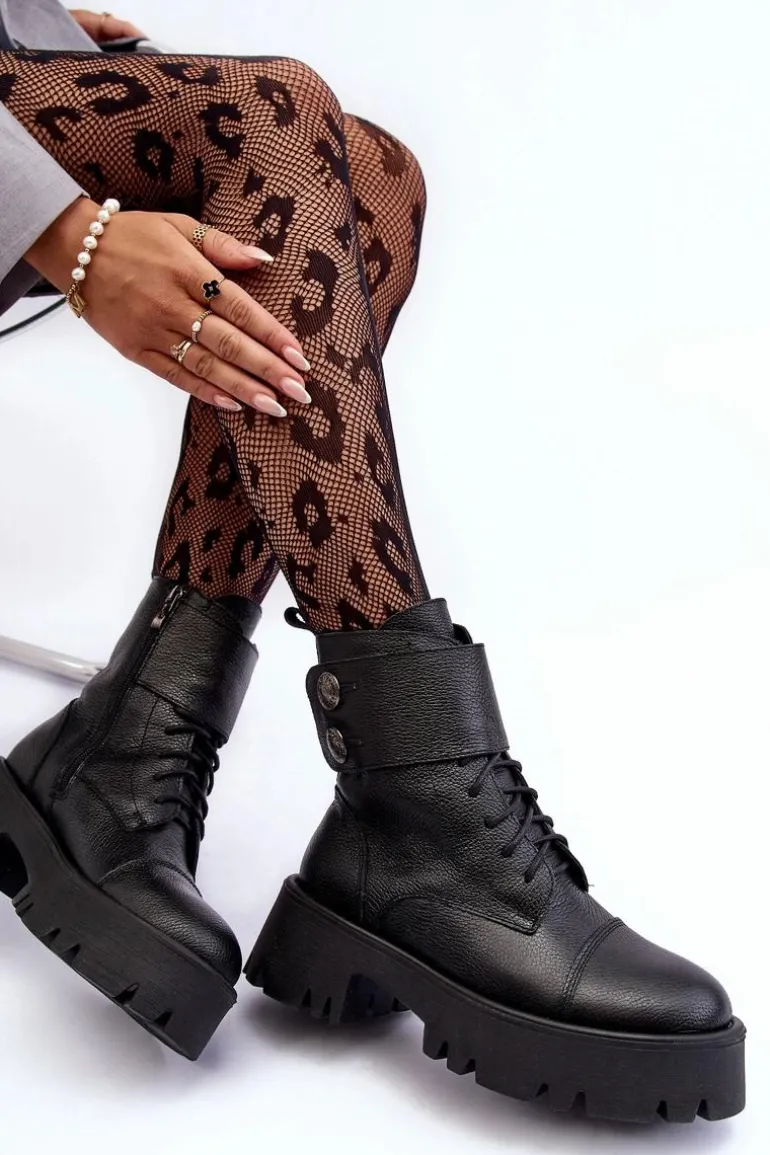 Botki damskie wykonane ze skóry naturalnej. Osadzone na masywnym, płaskim obcasie i platformie. Zapinane na suwak z boku. Cholewka ozdobiona szerokim paskiem. Wnętrze ocieplone kocem obuwniczym. Podeszwa jest antypoślizgowa. Model ten będzie pasować do wielu jesienno-zimowych stylizacji! Przy wyborze rozmiaru prosimy kierować się tabelą rozmiarów