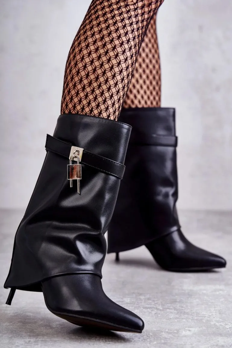 Wyjątkowe, wsuwane kozaki zostały wykonane z eko skóry. Model ten posiada cholewkę zachodzącą na obcas cholewkę, co wyróżnia to obuwie na tle innych kozaków. Pasek z ozdobą zapinany na rzep można całkowicie zdjąć. Model z noskiem w szpic oraz obcas w postaci szpilki optycznie wysmuklą nogi. Wkładka została wykonana z eko skóry. Dodatkowo kozaki posiadają usztywniany zapiętek. Przy wyborze rozmiaru prosimy sugerować się tabelą rozmiarów.