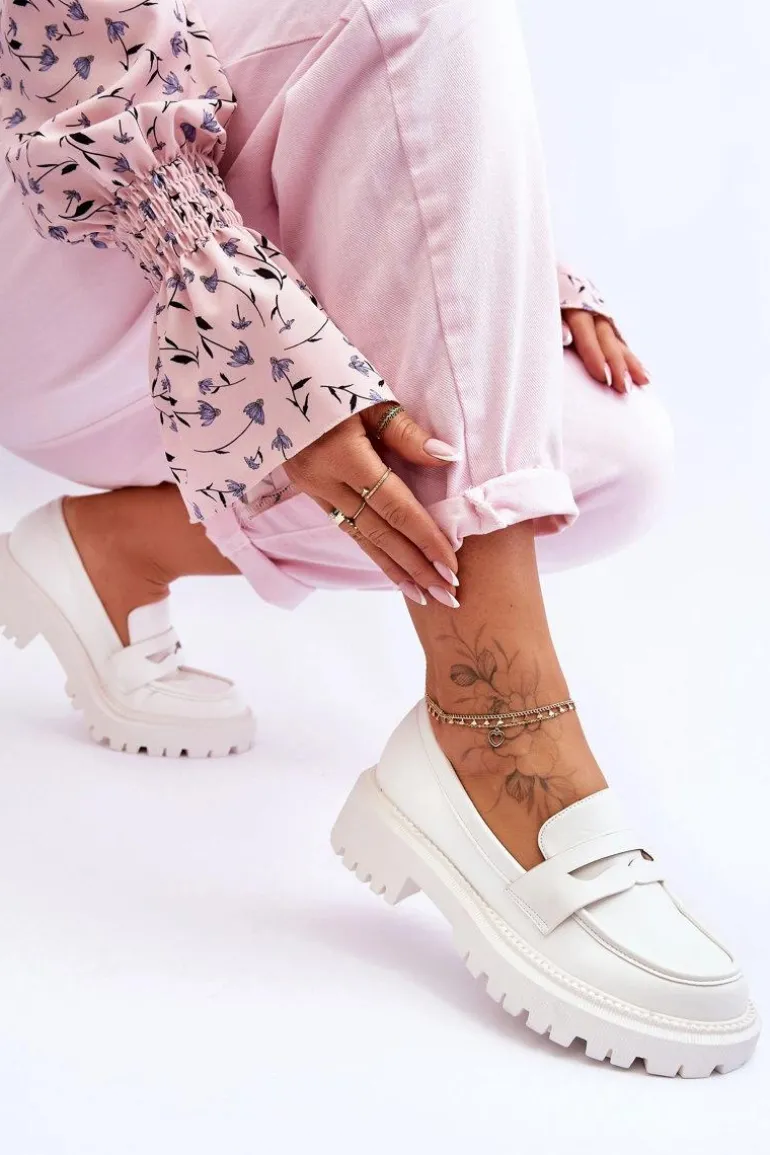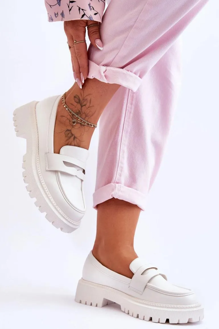 Wygodne, damskie mokasyny zostały wykonane z eko skóry. Model ten posiada na przodzie paseczek z delikatnym wycięciem. Mokasyny osadzono na płaskim, masywnym obcasie oraz platformie. Zapiętek został delikatnie usztywniony. Świetny model do wielu stylizacji w sezonie wiosenno-jesiennym. Przy wyborze rozmiaru prosimy sugerować się tabelą rozmiarów.