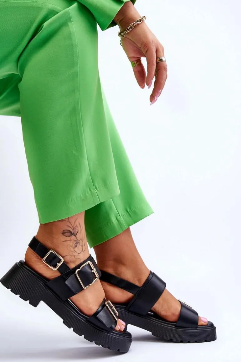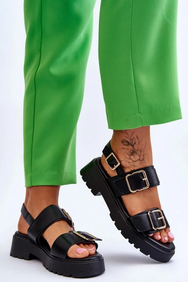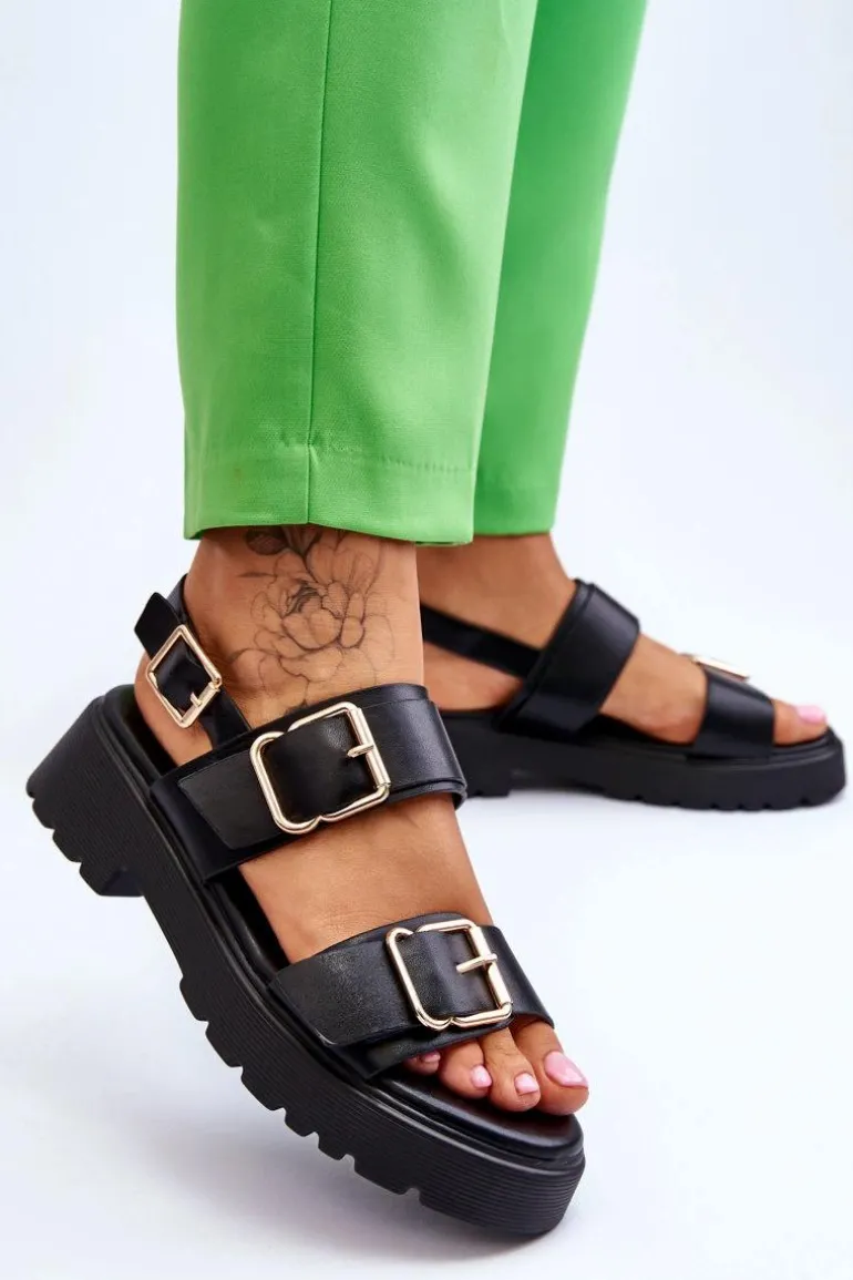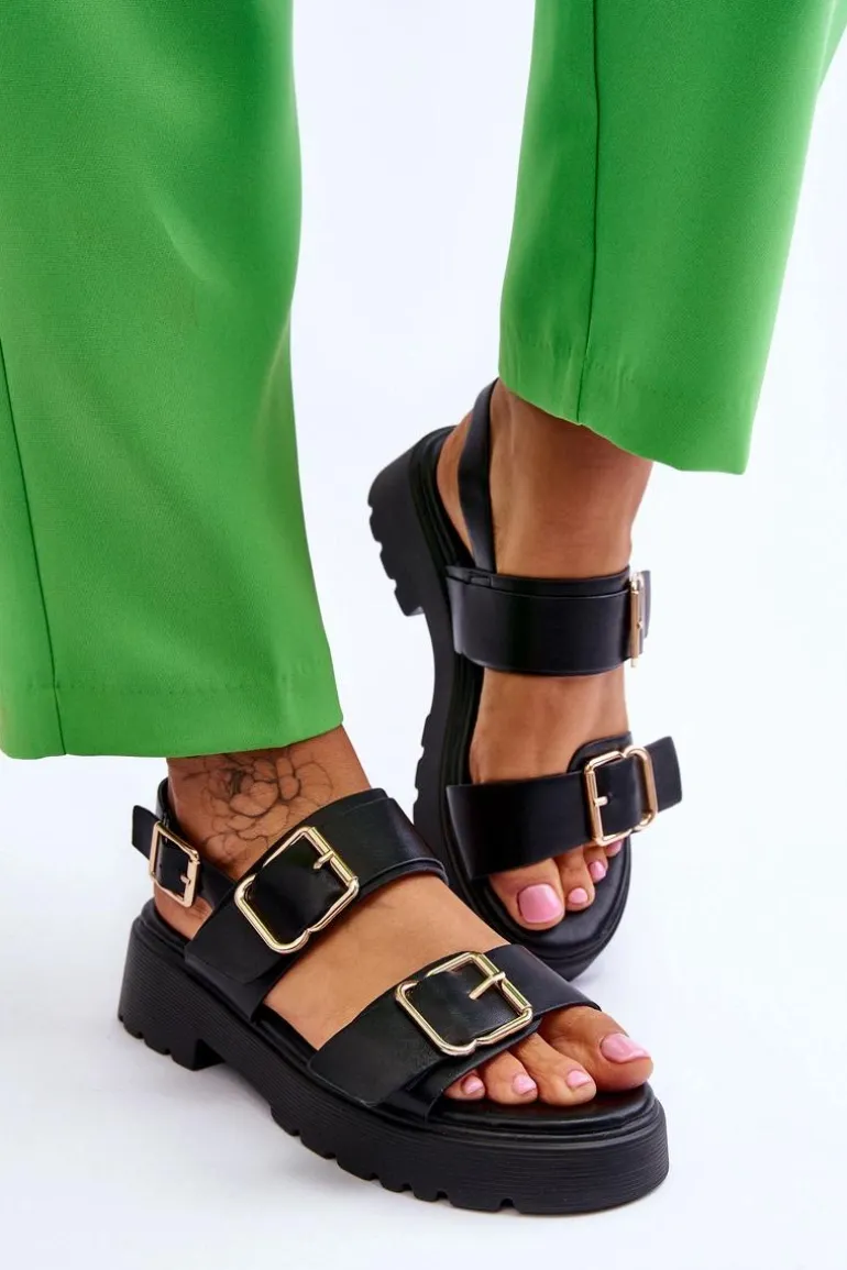 Wygodne sandały damskie zostały osadzone na płaskim obcasie oraz platformie. Wykonane z eko skóry z paskami i klamrami. Model ten posiada miękką wkładkę, która pozwoli na komfortowe użytkowanie obuwia nawet przez cały dzień! Zapinane wokół kostki na regulowany pasek z kwadratową sprzączką. Podeszwa wykonana z tworzywa sztucznego. Idealny model na letnie, upalne dni. Przy wyborze rozmiaru prosimy sugerować się tabelą rozmiarów.