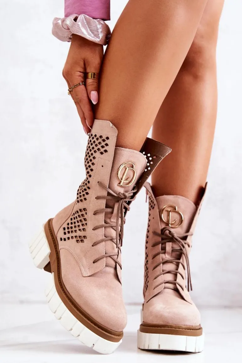 Botki firmy Nicole zostały wykonane w całości z naturalnej skóry. Posiadają masywną platformę, która świetnie odizoluje od zimnego podłoża. Ażurowy wzorek sprawia, że świetnie będzie prezentować się z wieloma stylizacjami. Workery posiadają suwak ułatwiający zakładanie oraz wiązanie. Miękka wkładka zadba o Twoją wygodę. Na języku znajduje się ozdobny emblemat. Przy wyborze rozmiaru prosimy sugerować się tabelą rozmiarów.
