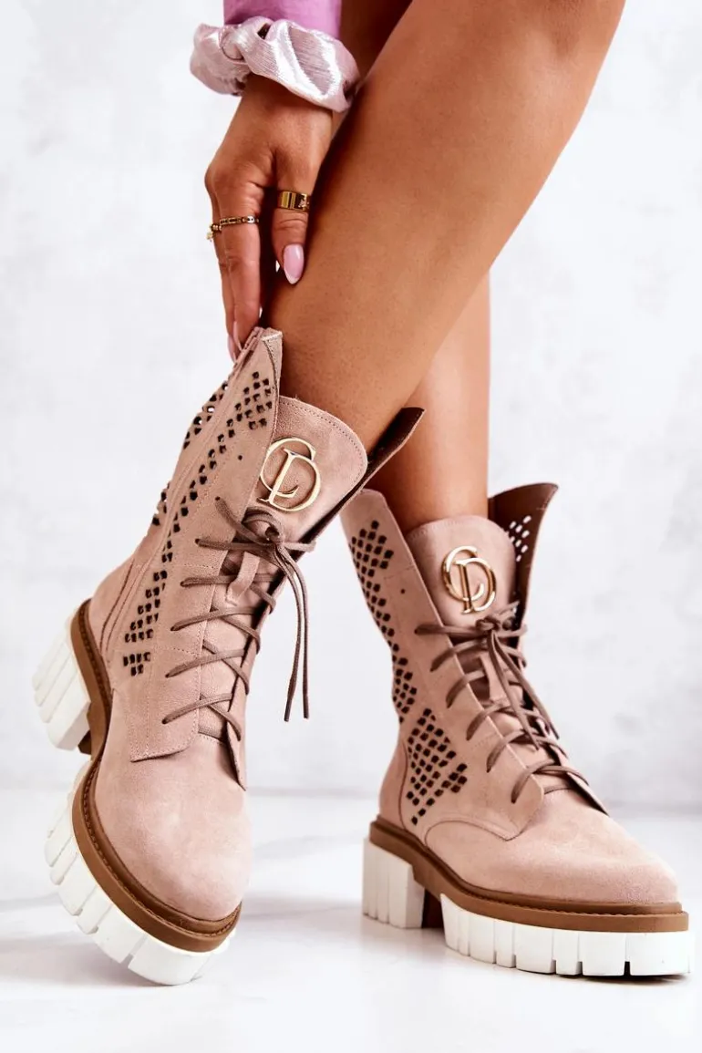 Skórzane Wysokie Botki Workery Nicole Różowe 2706