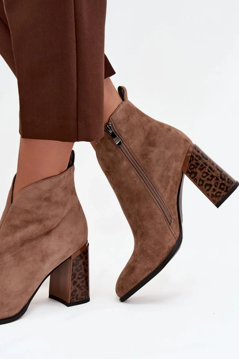 Botki damskie z naturalnego zamszu to propozycja łącząca klasykę z modnym akcentem. Zapinane na zamek, są wygodne w zakładaniu i zdejmowaniu. Osadzone na stabilnym obcasie typu słupek w panterkowy wzór, wyróżniają się oryginalnym wyglądem i przyciągają wzrok. Wnętrze butów zostało ocieplone kocem obuwniczym, co gwarantuje komfort i ciepło w chłodniejsze dni. Dodatkowym detalem jest przeszycie biegnące wzdłuż cholewki, które podkreśla elegancki charakter modelu. To botki idealne do jesiennych i zimowych stylizacji – świetnie sprawdzą się zarówno na co dzień, jak i w bardziej eleganckich zestawach.