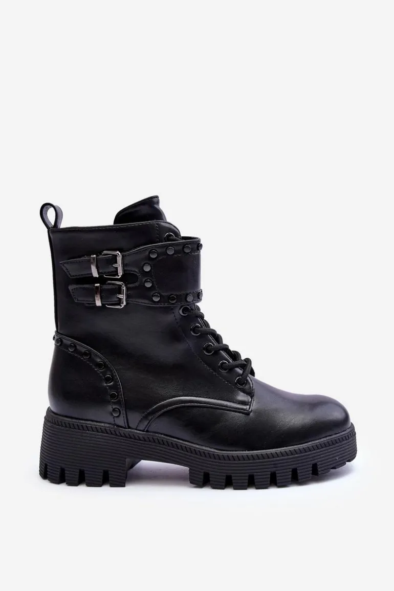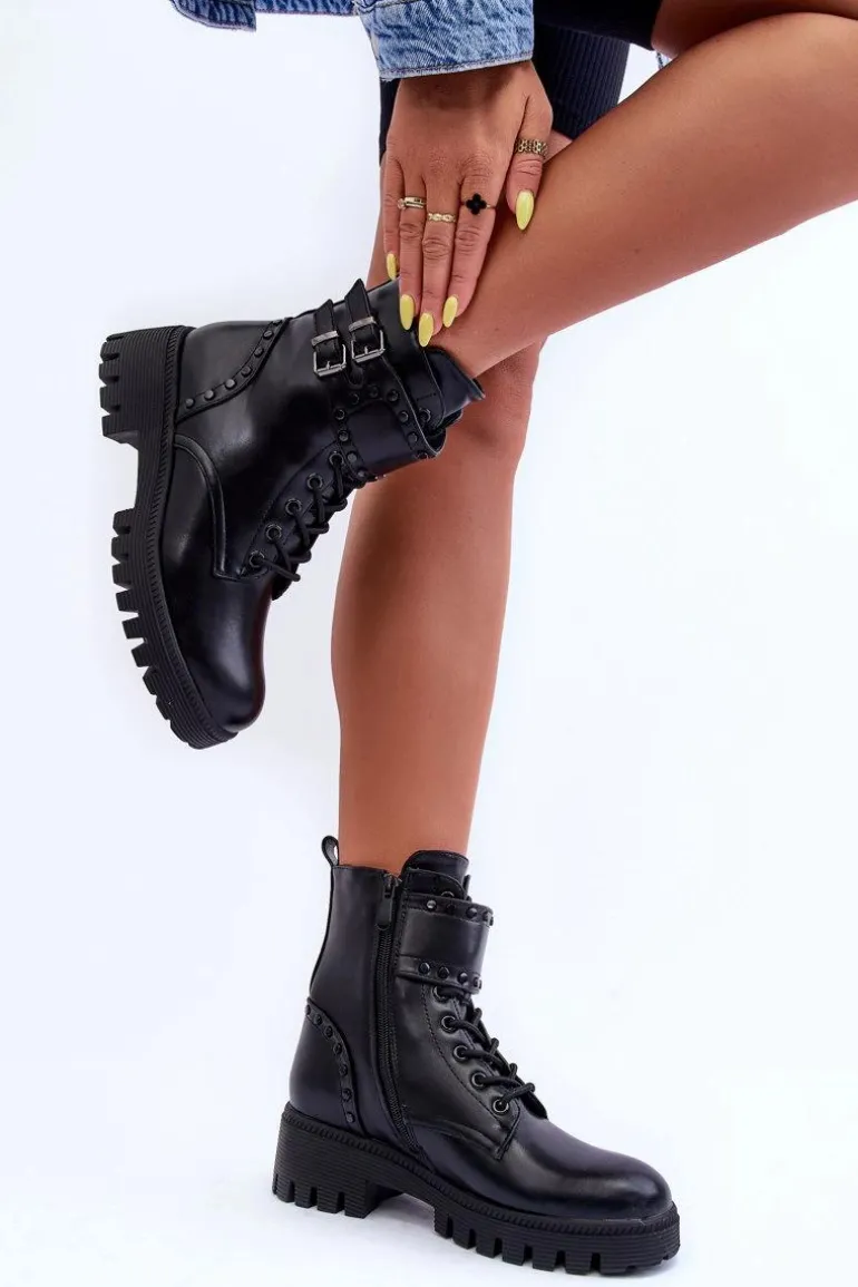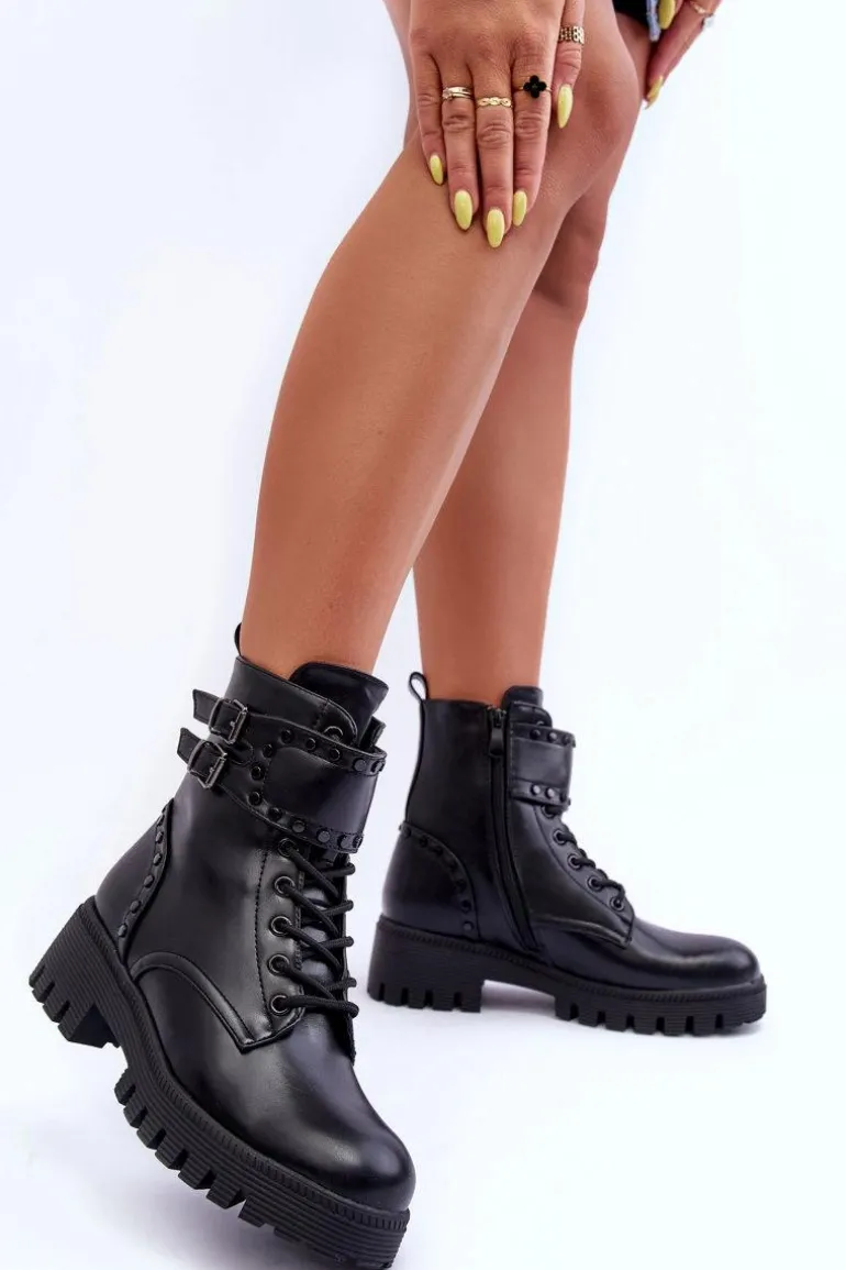 Stylowe botki damskie wykonane zostały eko skóry. Osadzone na płaskim obcasie i platformie. Zapinane na suwak z boku z dodatkowym sznurowaniem. Model ten został ozdobiony paskiem ze sprzączkami oraz dżetami. Idealne do jesiennych i zimowych stylizacji! Przy wyborze rozmiaru prosimy sugerować się tabelą rozmiarów.