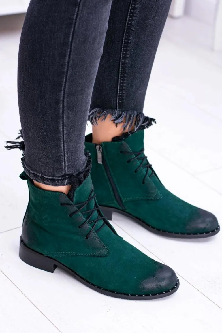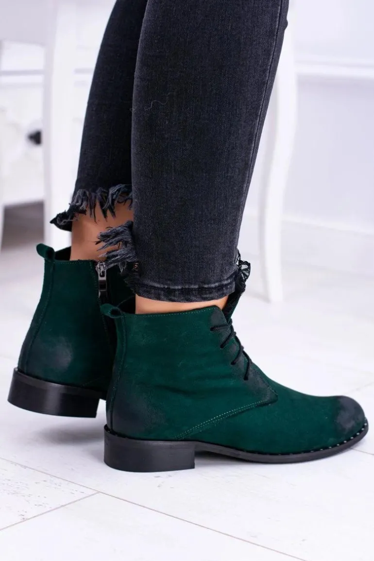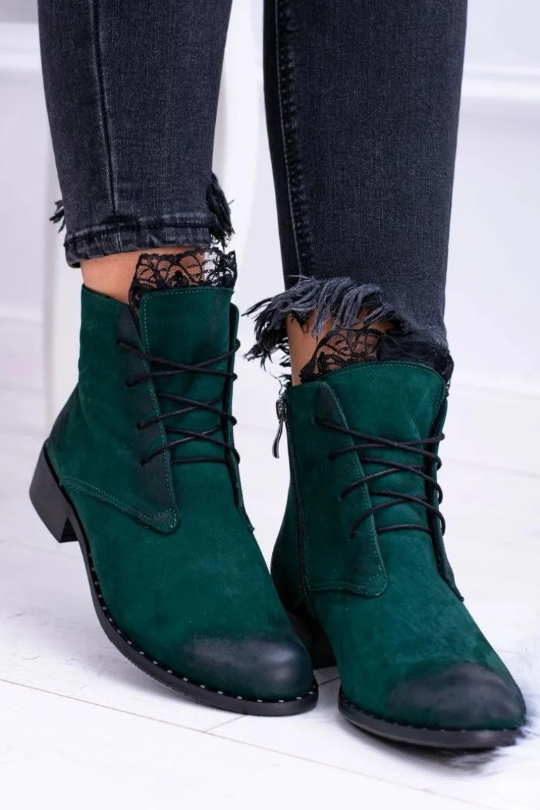 Skórzane Zielone Damskie Botki Z Koronką Millano