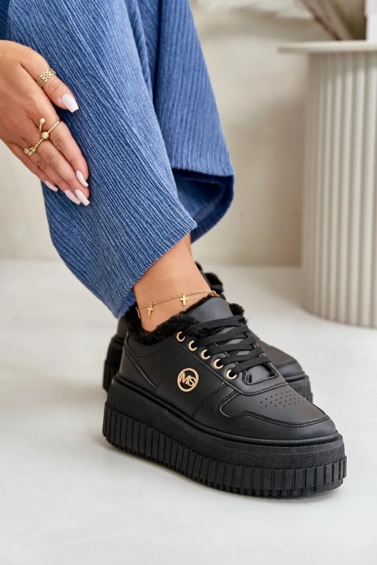 Damskie buty sportowe wykonane z eko skóry. Masywna podeszwa nie tylko unosi sylwetkę, ale także zapewnia doskonałą stabilność. Wnętrze ocieplone jest futerkiem, co zapewnia dodatkowy komfort i ochronę przed zimnem. Model klasycznie sznurowany. Idealne do noszenia zarówno na co dzień, jak i podczas aktywności na świeżym powietrzu. Przy wyborze rozmiaru prosimy kierować się tabelą rozmiarów.