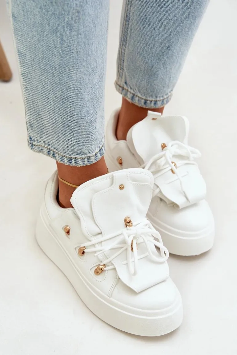 Damskie sneakersy wykonane z wysokiej jakości eko skóry to idealny wybór dla miłośniczek modnych rozwiązań. Osadzone na masywnej platformie, dodają kilku centymetrów wzrostu, jednocześnie zapewniając stabilność i komfort noszenia. Wkładka z miękkiej pianki zapewni wygodę nawet podczas długiego użytkowania. Ten stylowy fason idealnie dopełni wiele casualowych stylizacji! Przy wyborze rozmiaru prosimy kierować się tabelą rozmiarów.