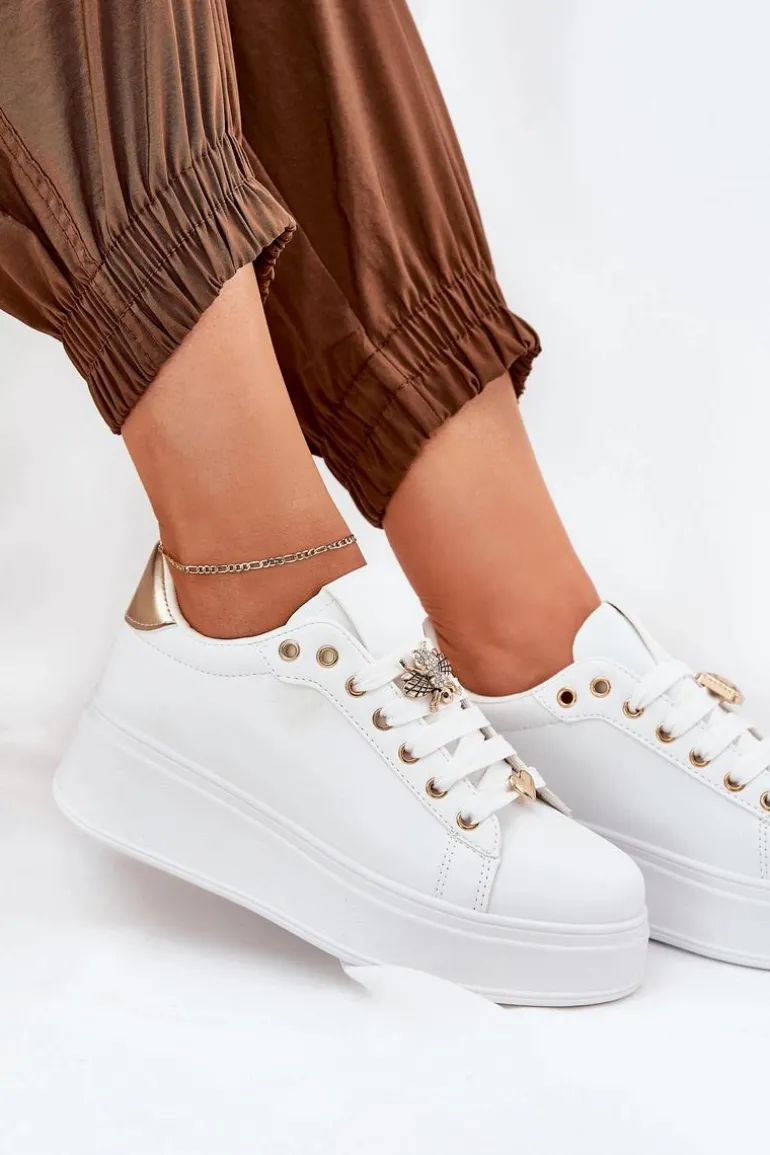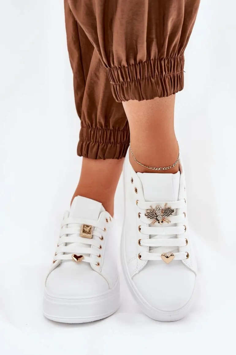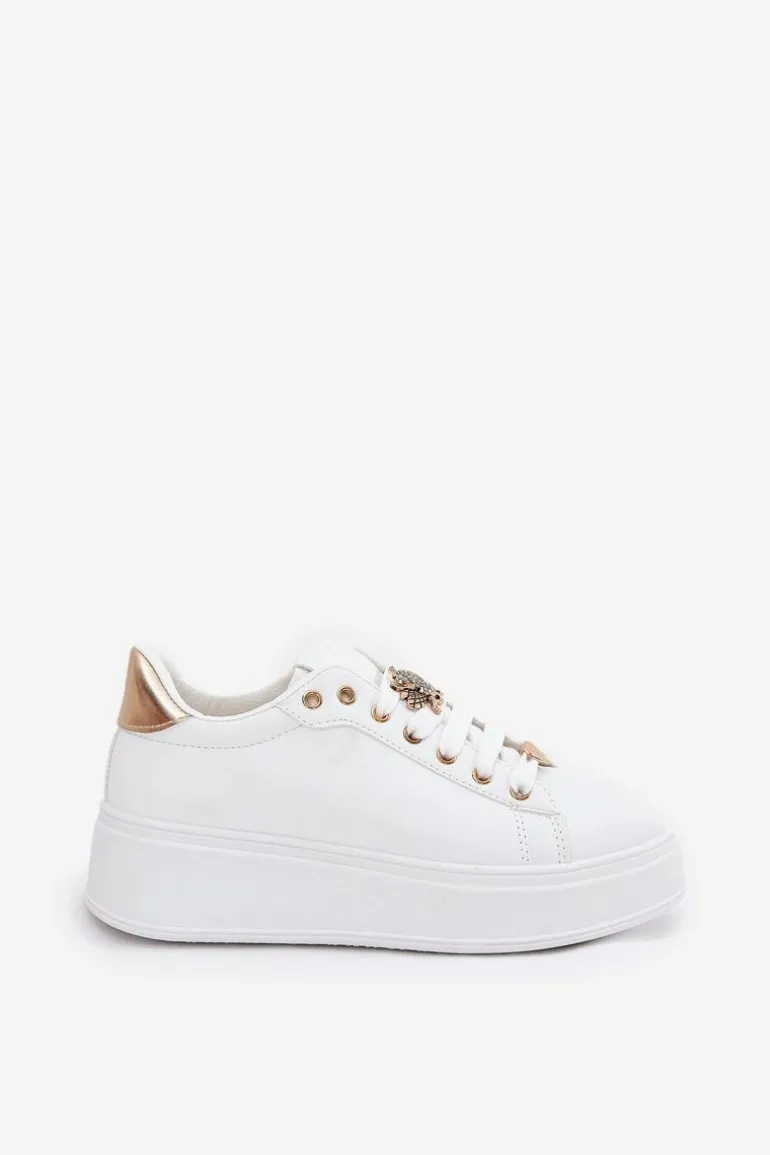 Damskie sneakersy wykonane z ekologicznej skóry. Umieszczone na platformie, zapewniają subtelne podwyższenie oraz komfort użytkowania. Posiadają zaokrąglone noski, które nadają im klasyczny wygląd. Ozdobne przypinki na sznurowadłach dodają unikalnego charakteru i dziewczęcego uroku. Ten model świetnie sprawdzi się zarówno w codziennych, jak i bardziej casualowych stylizacjach, stanowiąc eleganckie uzupełnienie każdej garderoby. Przy wyborze rozmiaru prosimy kierować tabelą rozmiarów.