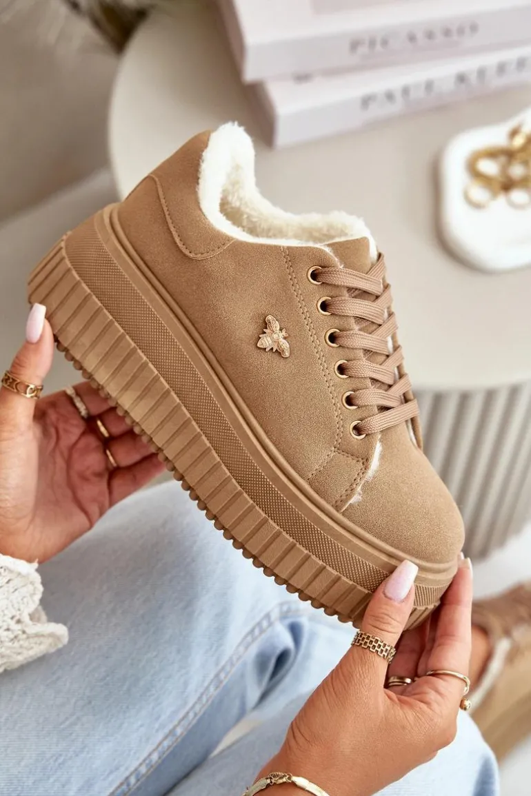 Sneakersy Damskie Ocieplane Na Masywnej Podeszwie Ze Złotym Detalem Brązowe Lotira