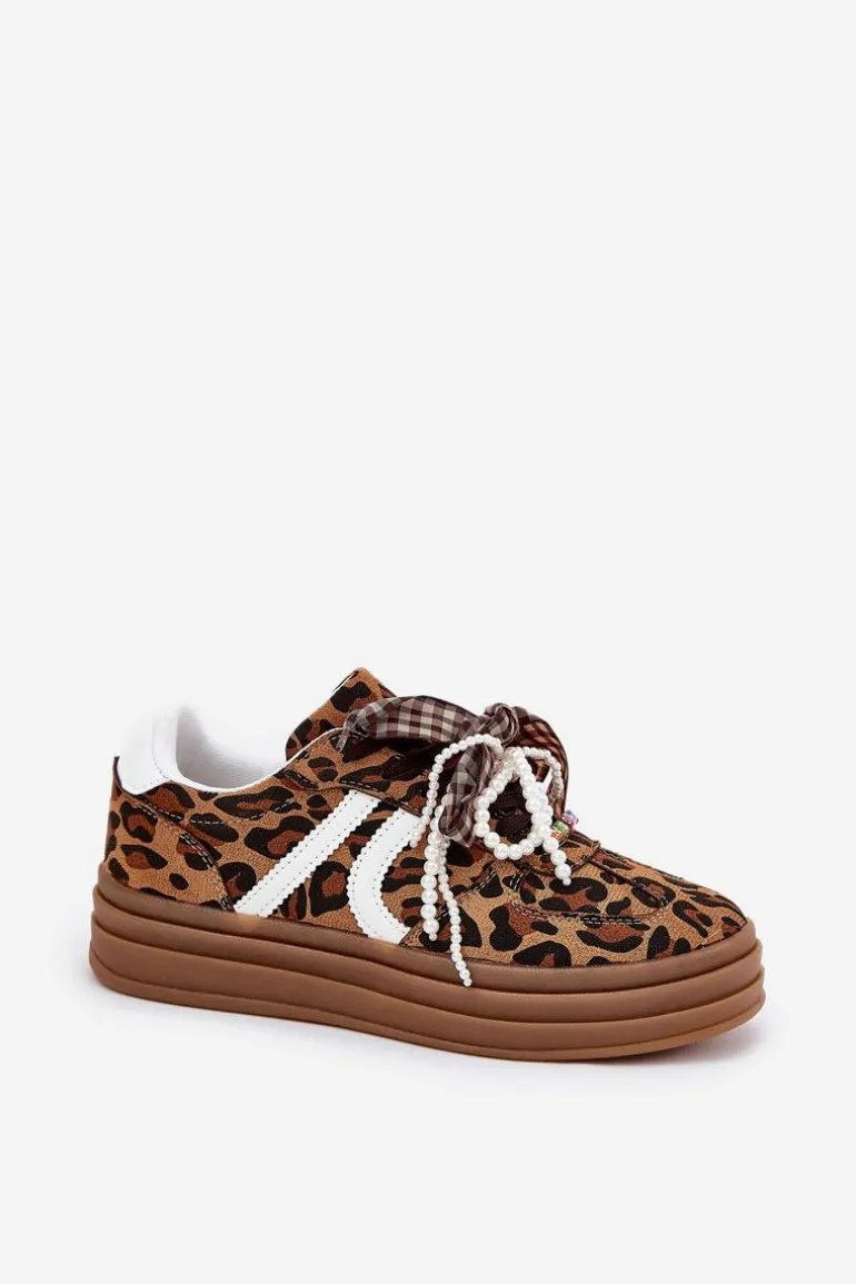 Sneakersy Damskie W Panterkę Na Platformie Z Ozdobami Brązowe Vinness