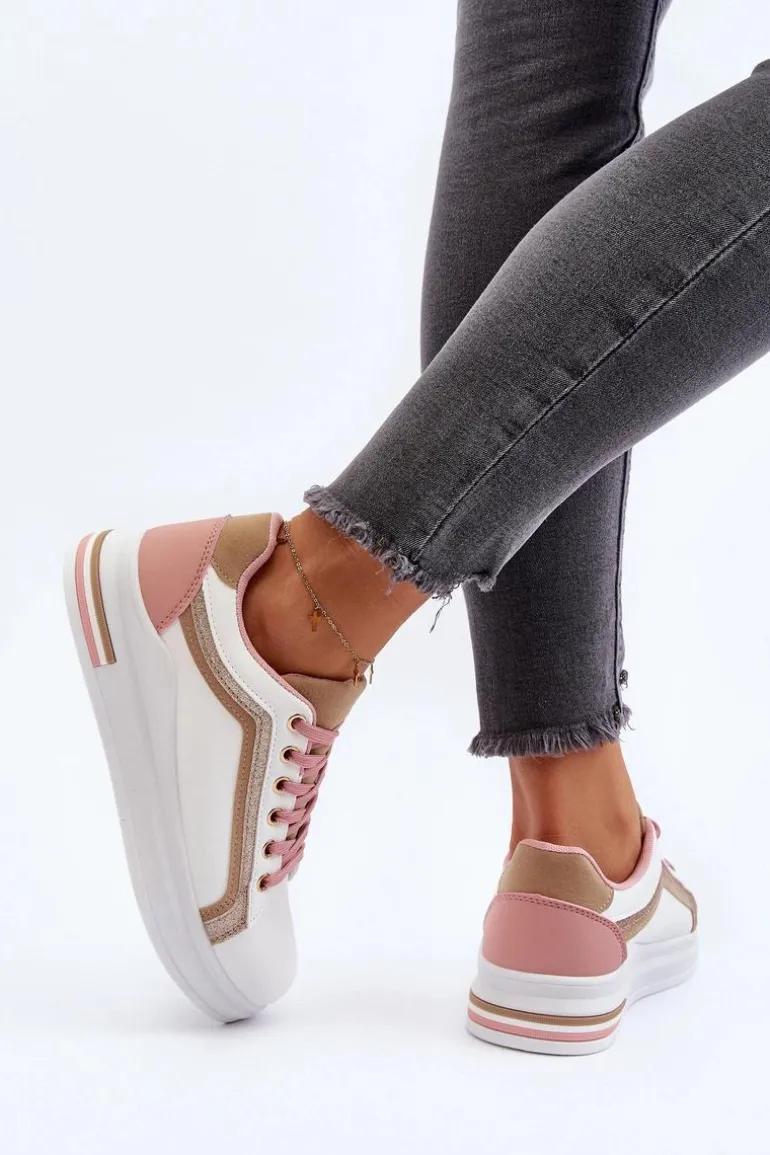 Sneakersy damskie osadzone na platformie. Cholewka ozdobiona przeszyciami oraz brokatem. Miękka wkładka z pianki zapewni wygodę podczas użytkowania, dodatkowo jest ona wyjmowana. Noski zaokrąglone. Ten ciekawy fason z pewnością dopełni wiele wiosennych stylizacji! Przy wyborze rozmiaru prosimy kierować się tabelą rozmiarów.