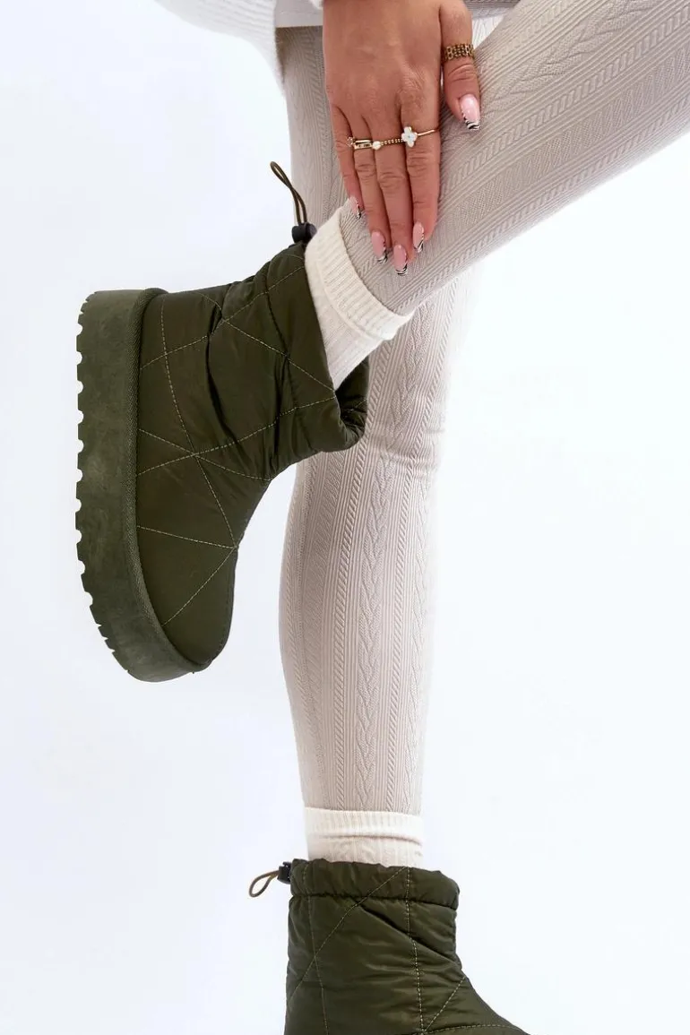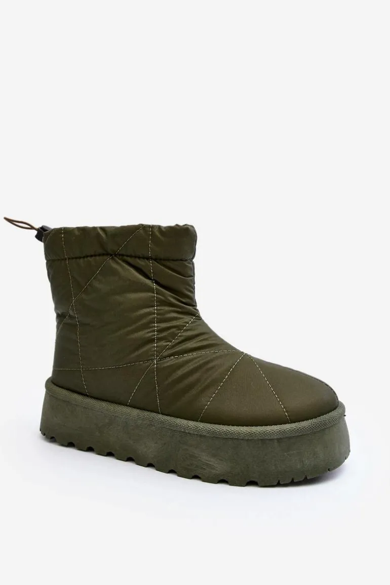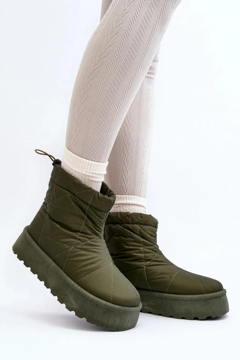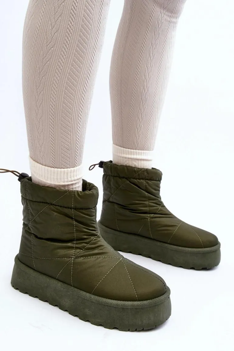 Śniegowce damskie wykonane z materiałów, które skutecznie chronią przed zimnem. Osadzone na masywnej platformie z gumowego tworzywa. Cholewka ozdobiona licznymi przeszyciami. Model wsuwany. Noski zaokrąglone. Środek ocieplony grubym futerkiem. Na górze cholewki ściągacz. Dodatkowo zapiętek jest usztywniony. Koniecznie powinnaś je mieć! Przy wyborze rozmiaru prosimy sugerować się tabelą rozmiarów.