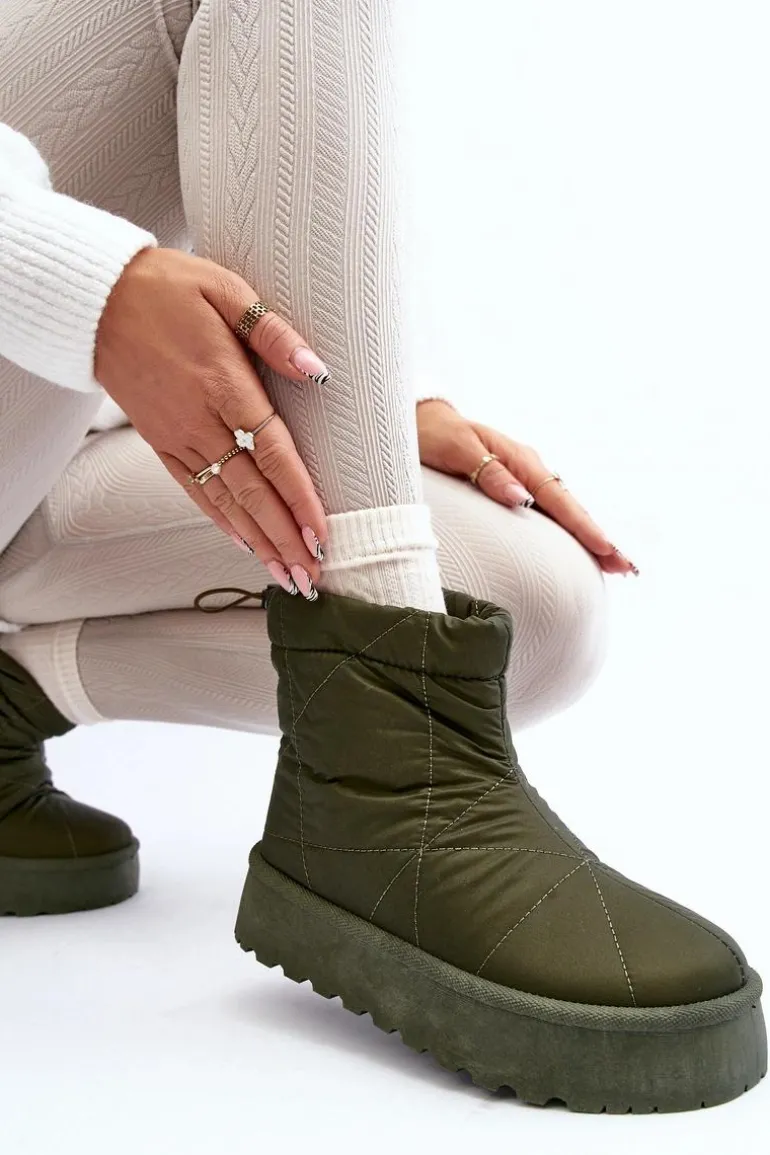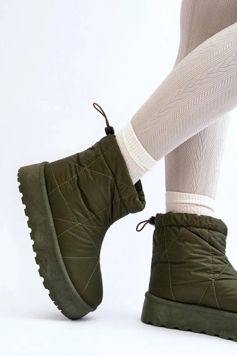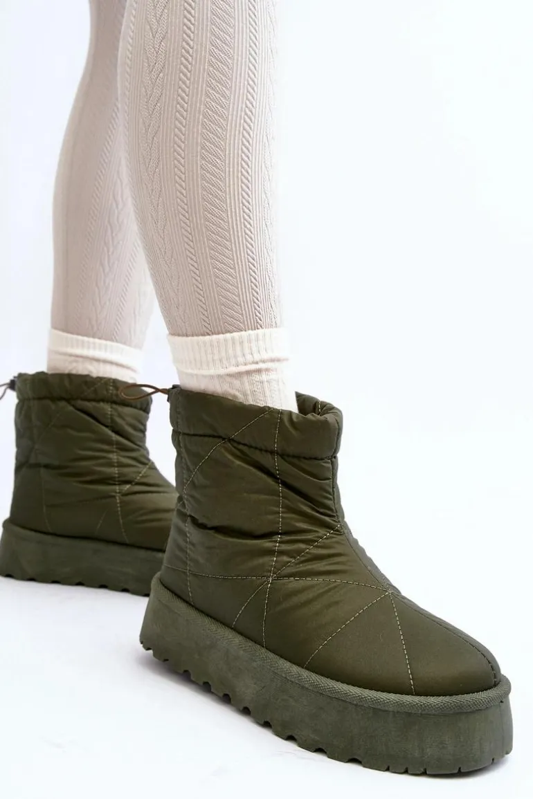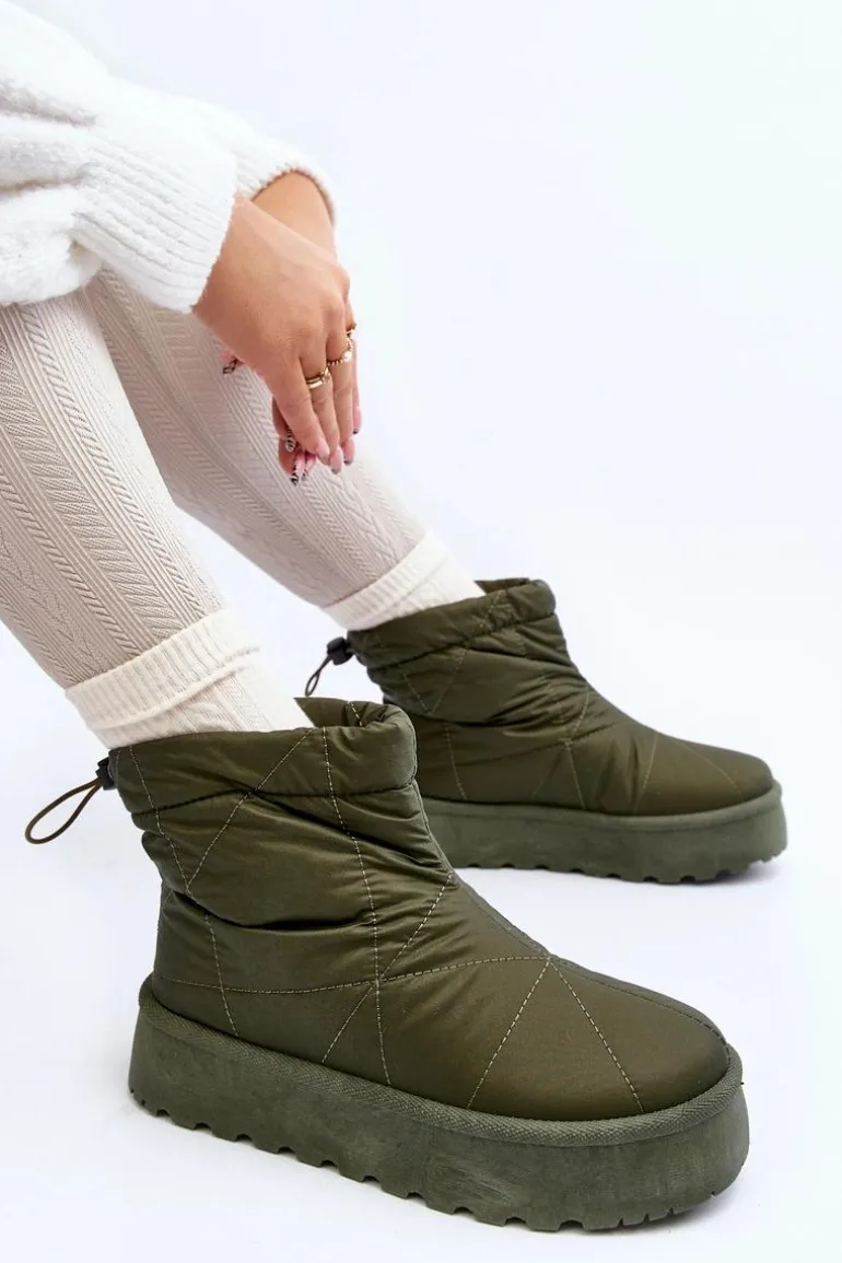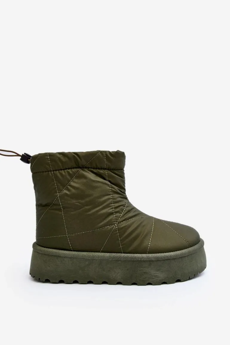 Śniegowce damskie wykonane z materiałów, które skutecznie chronią przed zimnem. Osadzone na masywnej platformie z gumowego tworzywa. Cholewka ozdobiona licznymi przeszyciami. Model wsuwany. Noski zaokrąglone. Środek ocieplony grubym futerkiem. Na górze cholewki ściągacz. Dodatkowo zapiętek jest usztywniony. Koniecznie powinnaś je mieć! Przy wyborze rozmiaru prosimy sugerować się tabelą rozmiarów.