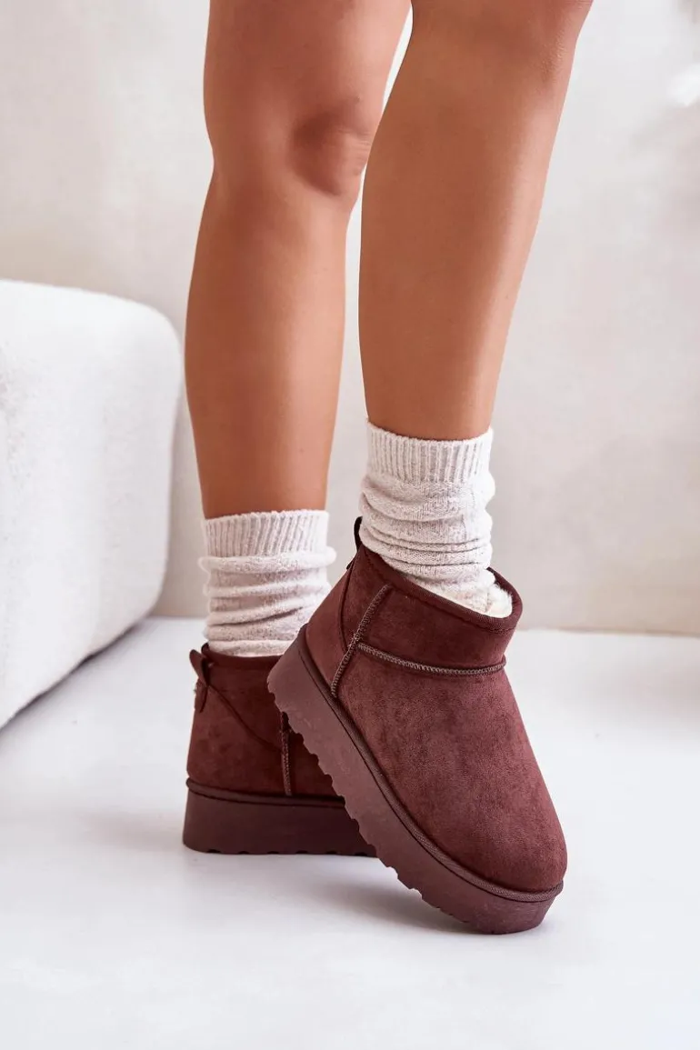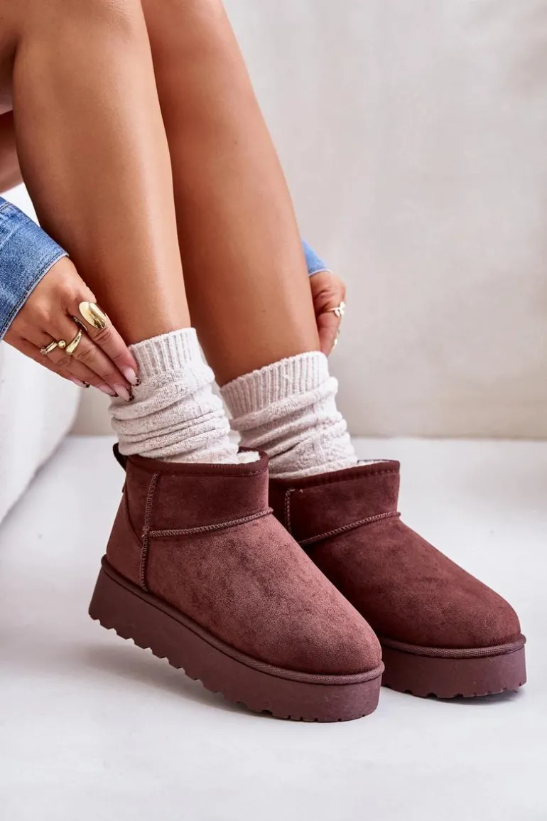 Modne śniegowce z cholewką za kostkę. Wewnątrz ocieplone grubym, syntetycznym futerkiem. Wykonane z eko zamszu. Osadzone na grubej platformie z gumowego tworzywa, która świetnie odizoluje od zimnego podłoża. Idealnie sprawdzą się podczas mroźnych dni. Modny od kilku sezonów fason świetnie wpasuje się w jesienno-zimowe stylizacje! Model ten dostępny jest również w rozmiarach dziecięcych. Stwórz komplet mama + dziecko! Przy wyborze rozmiaru prosimy sugerować się tabelą rozmiarów.