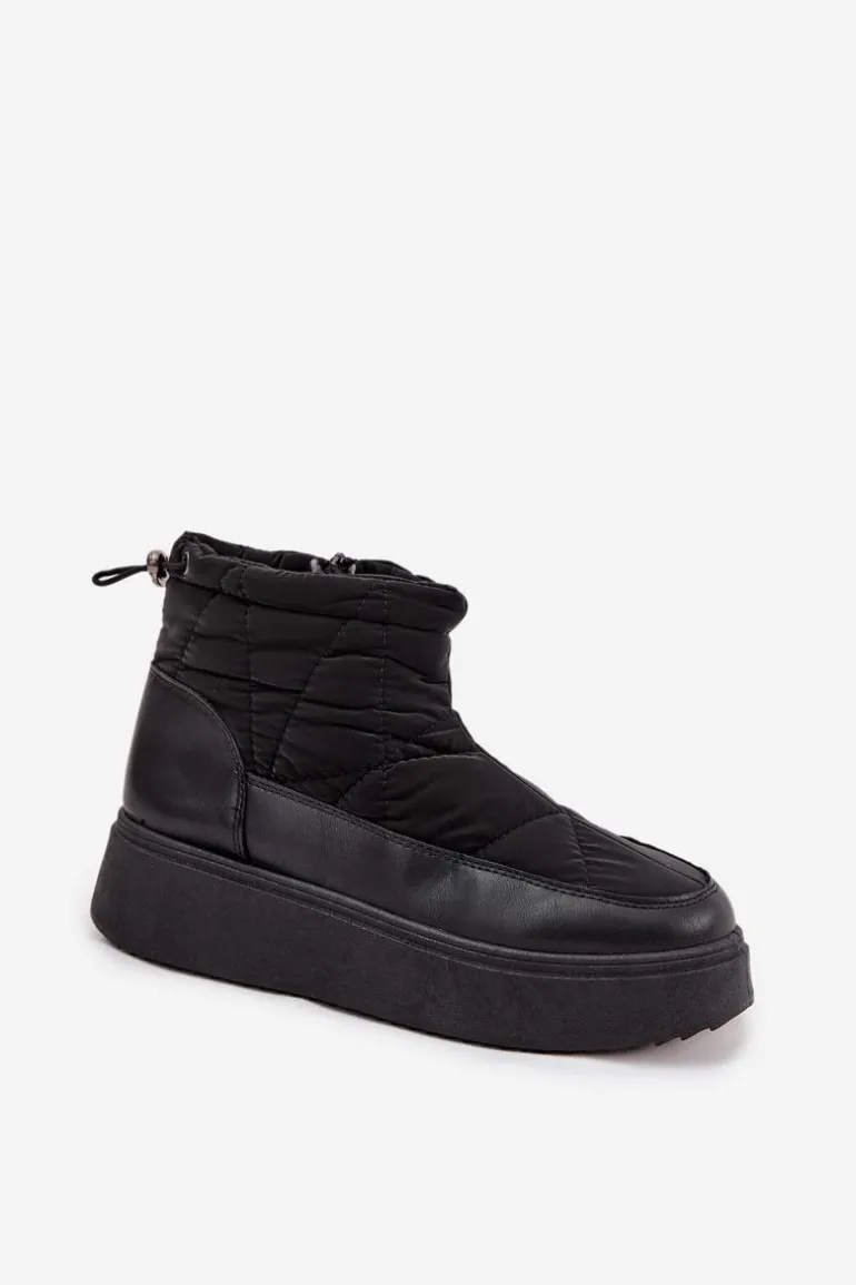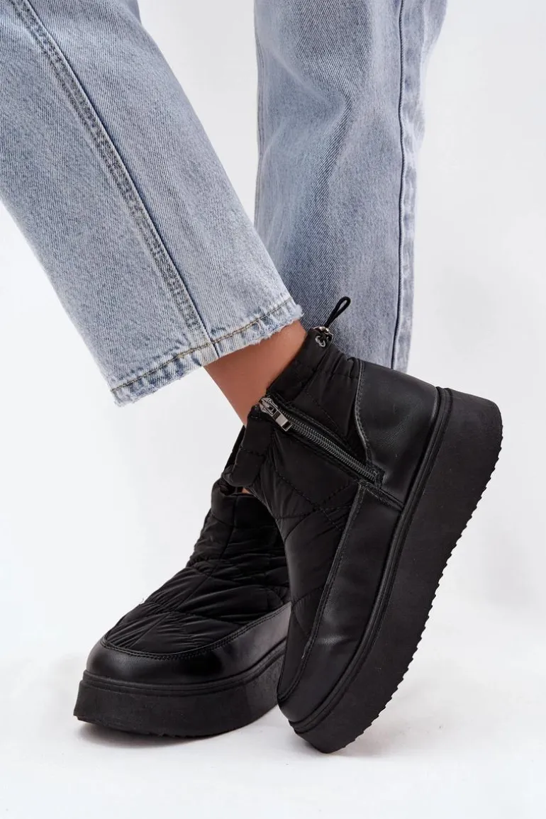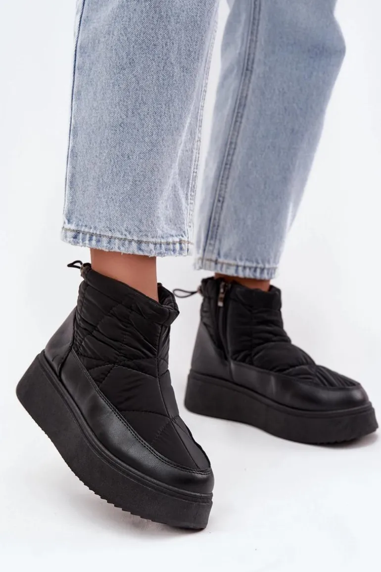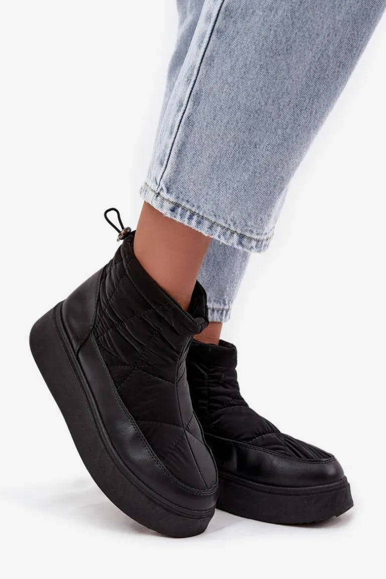 Śniegowce damskie wykonane z eko skóry oraz materiału tekstylnego z dekoracyjnymi przeszyciami, prezentują się stylowo, a jednocześnie doskonale chronią przed zimnem. Model osadzony jest na stabilnej platformie, która zapewnia wygodę i dobrą izolację od chłodnego podłoża. Buty są ocieplane miękkim futerkiem, dzięki czemu gwarantują ciepło nawet w mroźne dni. Zamek ułatwia zakładanie, a ściągacz z tyłu na górze cholewki pozwala dopasować obuwie do nogi, zapobiegając przedostawaniu się zimna. Idealne na zimowe spacery, górskie wyjazdy i codzienne stylizacje w chłodne dni. Przy wyborze rozmiaru prosimy sugerować się tabelą rozmiarów.