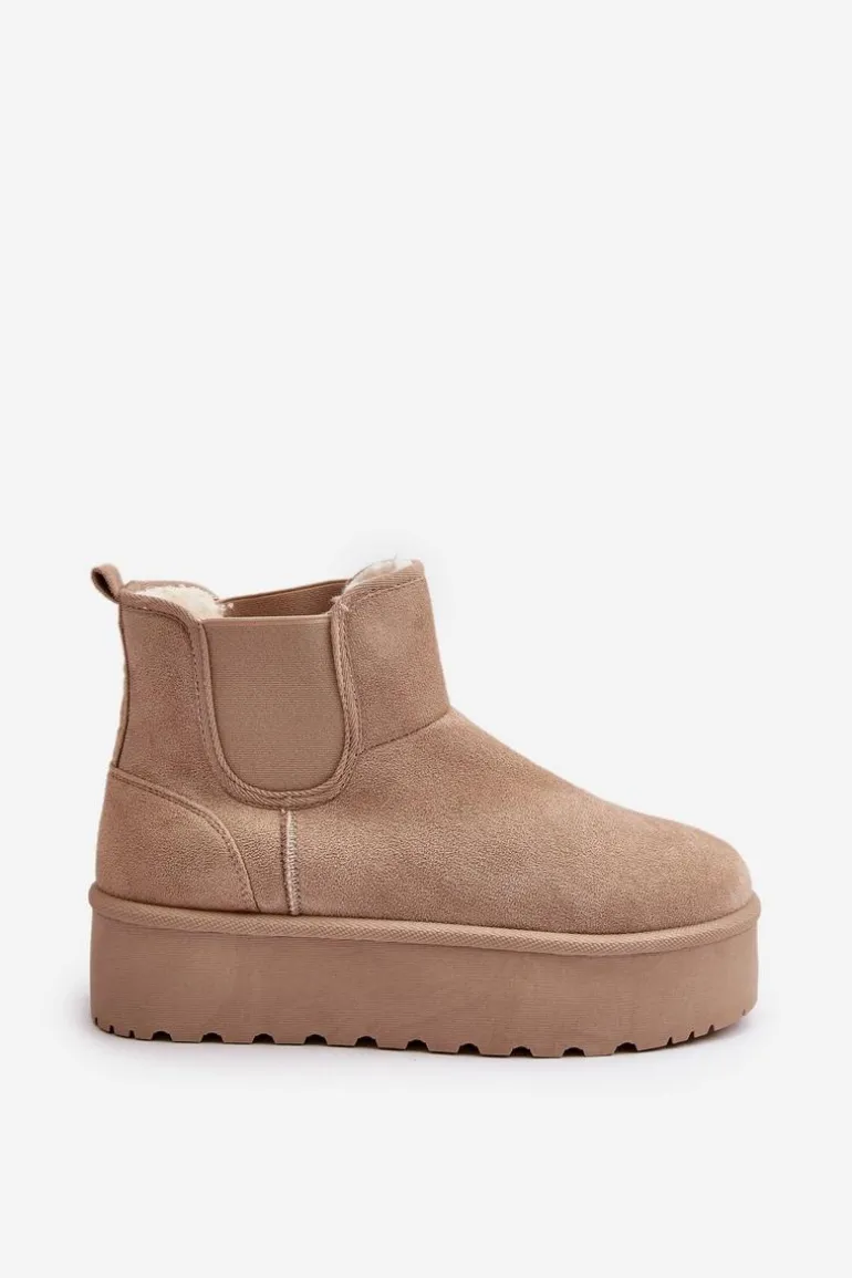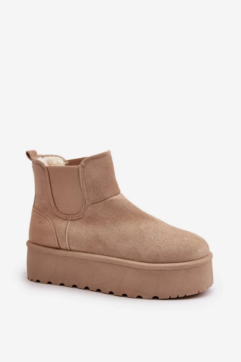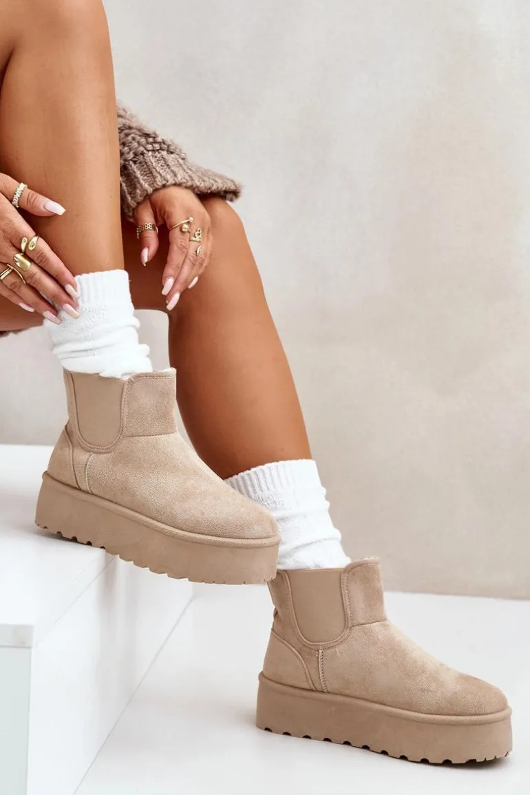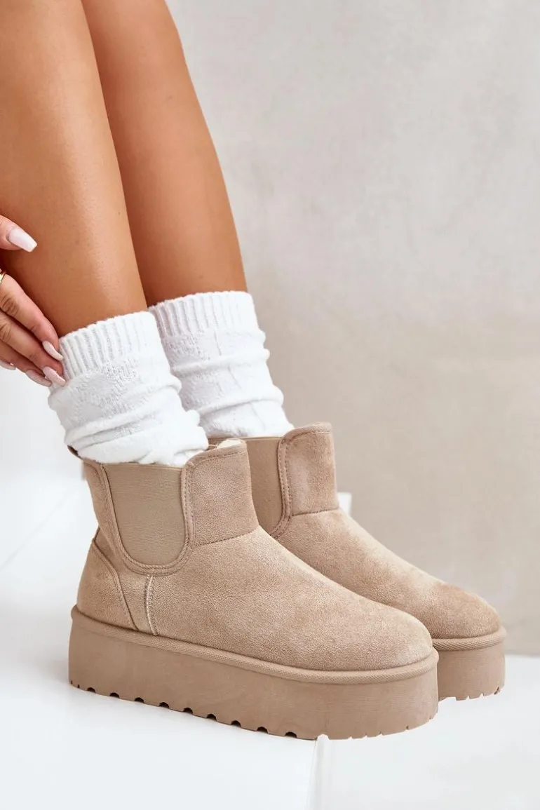 Modne śniegowce damskie osadzone na platformie, która świetnie odizoluje od zimnego podłoża. Wykonane z eko zamszu. Model z niską cholewką, która wzbogacona została elastycznymi wstawkami. Środek ocieplony grubym futerkiem. Ten modny fason dopasujesz do niemalże każdej stylizacji! Przy wyborze rozmiaru prosimy sugerować się tabelą rozmiarów.