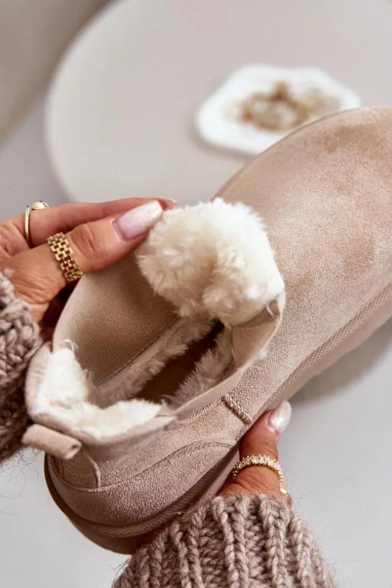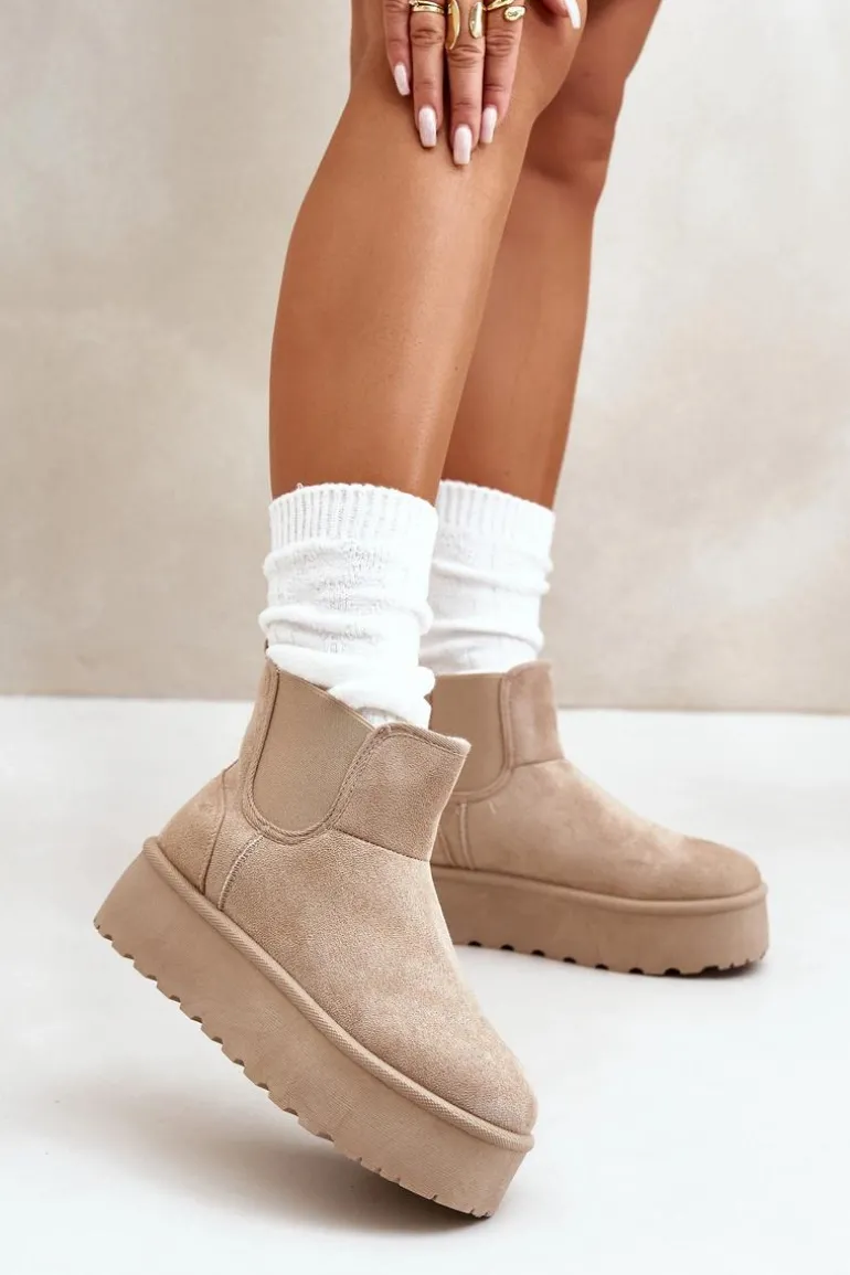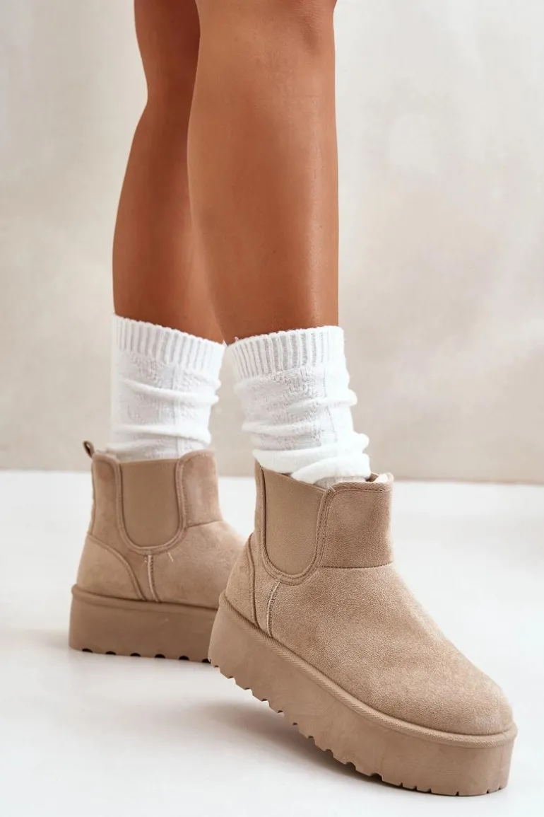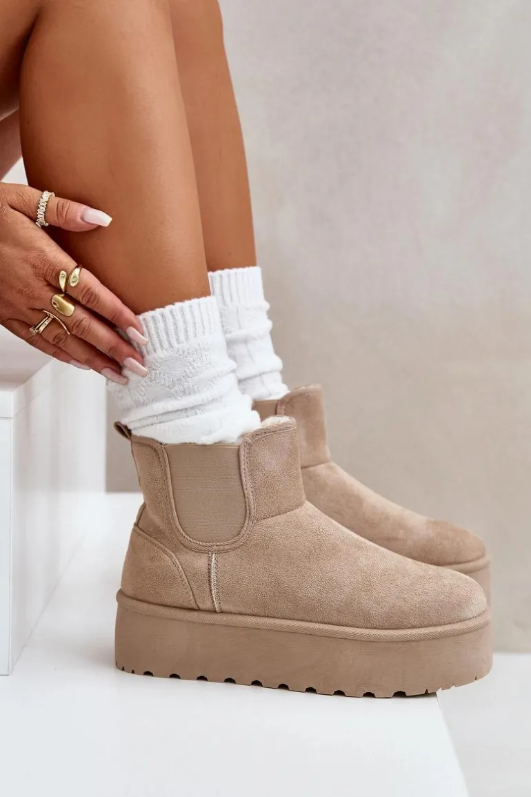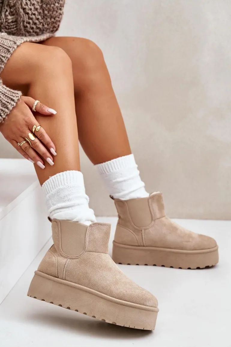 Modne śniegowce damskie osadzone na platformie, która świetnie odizoluje od zimnego podłoża. Wykonane z eko zamszu. Model z niską cholewką, która wzbogacona została elastycznymi wstawkami. Środek ocieplony grubym futerkiem. Ten modny fason dopasujesz do niemalże każdej stylizacji! Przy wyborze rozmiaru prosimy sugerować się tabelą rozmiarów.