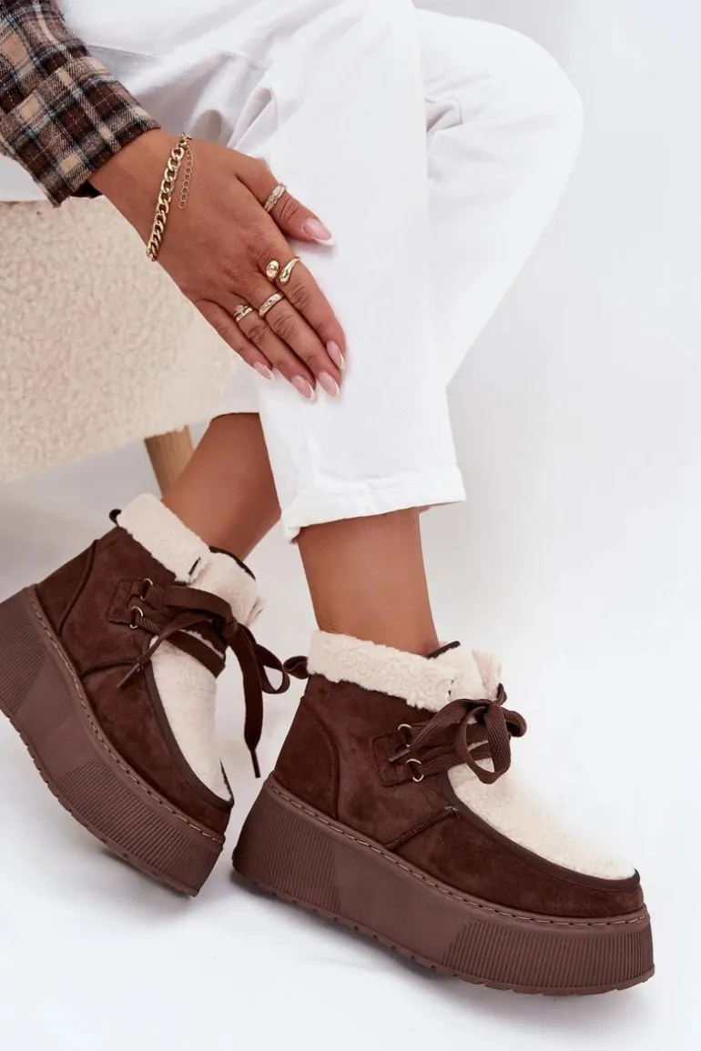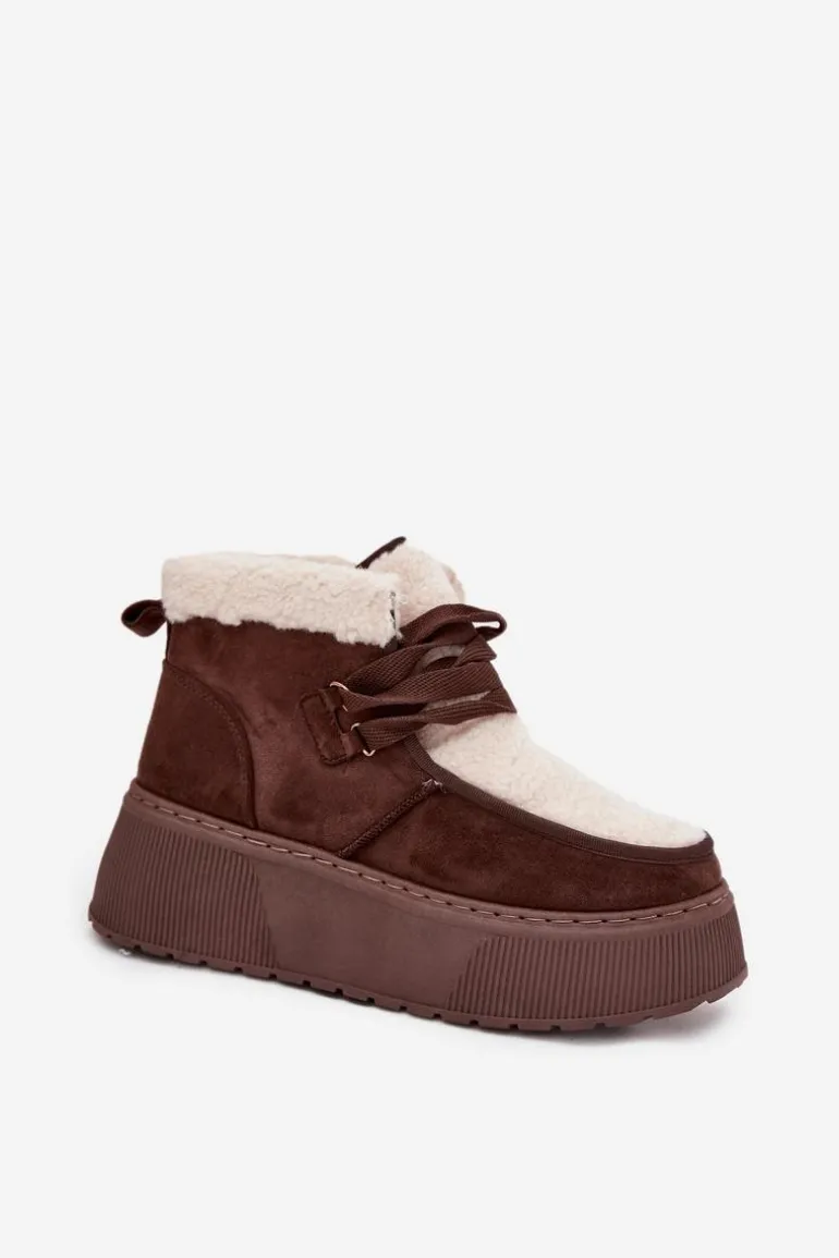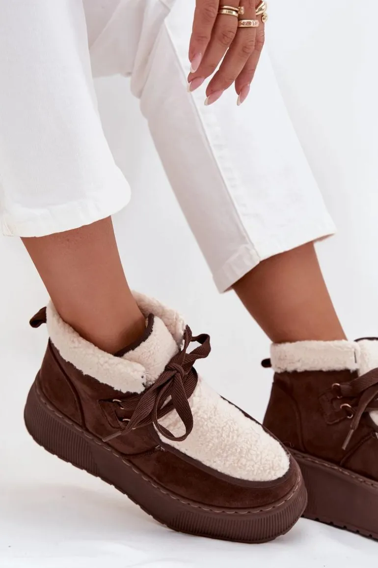 Śniegowce damskie wykonane z miękkiego eko zamszu to idealny wybór na zimowe dni. Model wsuwany ze sznurowaniem świetnie dopasowuje się do stopy, a wnętrze ocieplane futerkiem gwarantuje ciepło i wygodę. Osadzone na solidnej platformie, skutecznie izolują od chłodnego podłoża. To praktyczne i stylowe obuwie, które doskonale sprawdzi się w codziennych, zimowych stylizacjach. Przy wyborze rozmiaru prosimy sugerować się tabelą rozmiarów.