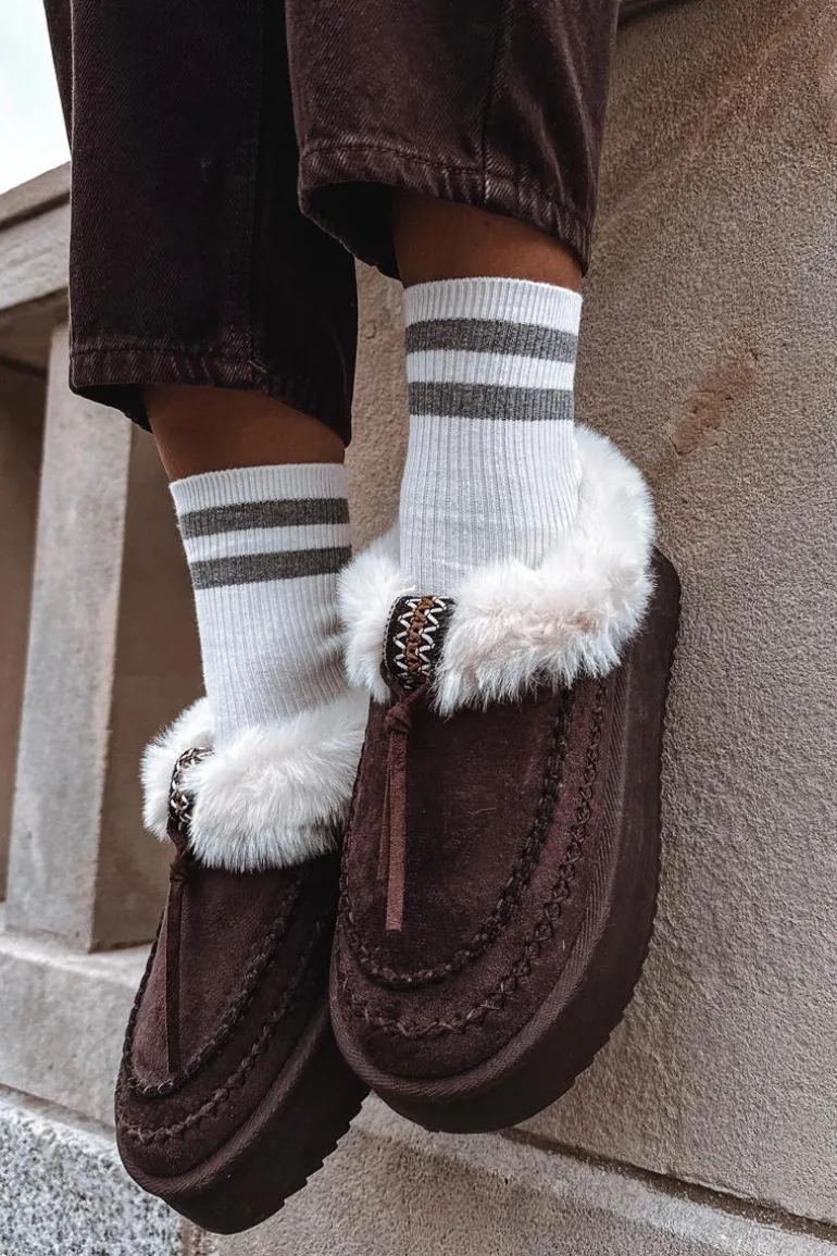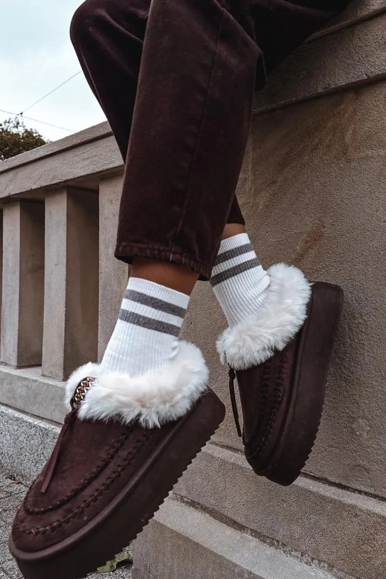 Śniegowce damskie wykonane z eko zamszu to idealne połączenie stylu i wygody na zimowe dni. Osadzone na platformie, która delikatnie wysmukla sylwetkę i doskonale izoluje od chłodnego podłoża, gwarantują komfort podczas noszenia. Górna część cholewki ozdobiona została miękkim futerkiem i dekoracyjnym paseczkiem, co nadaje całości modnego, zimowego charakteru. Wnętrze butów również ocieplone jest futerkiem, zapewniając ciepło i przyjemne otulenie stóp nawet w mroźne dni. To stylowe śniegowce, które świetnie sprawdzą się w codziennych zimowych stylizacjach.