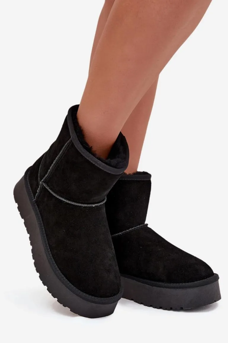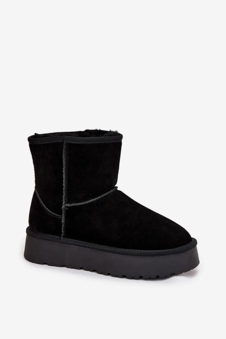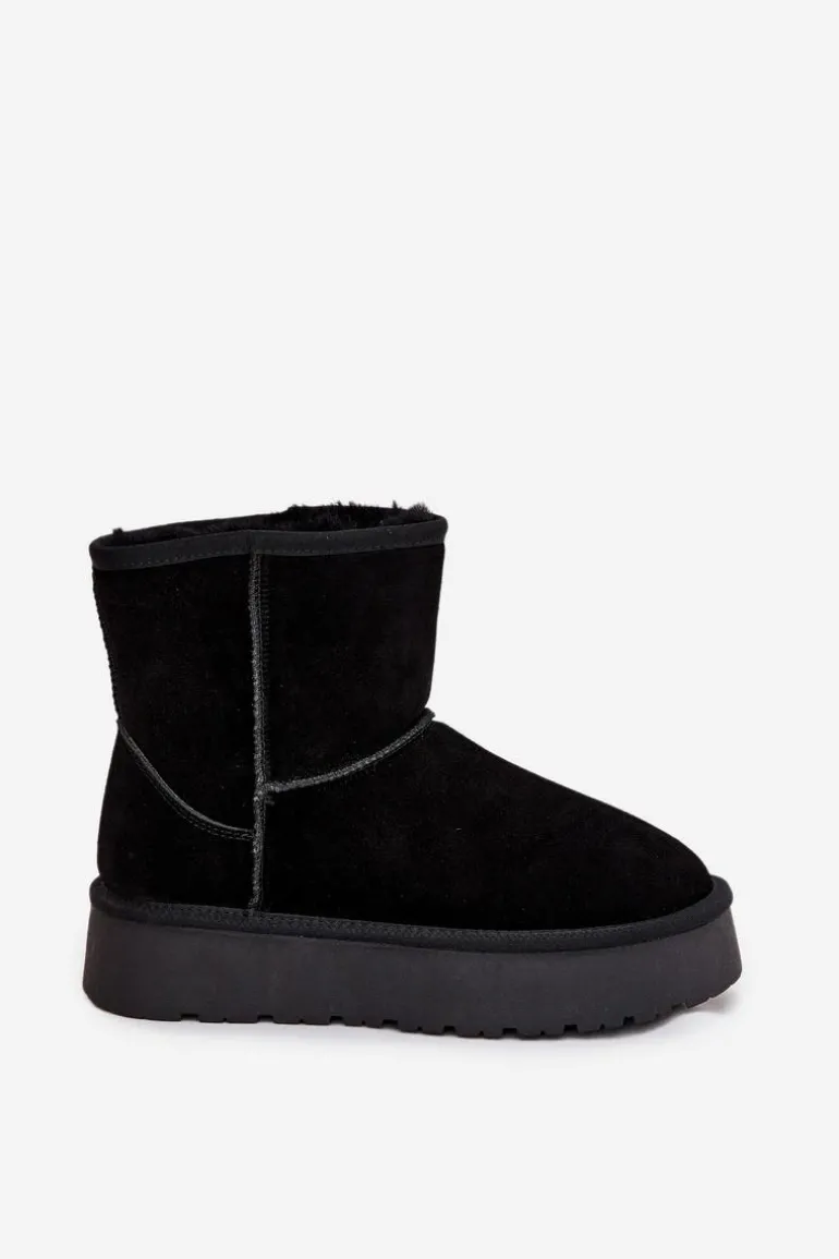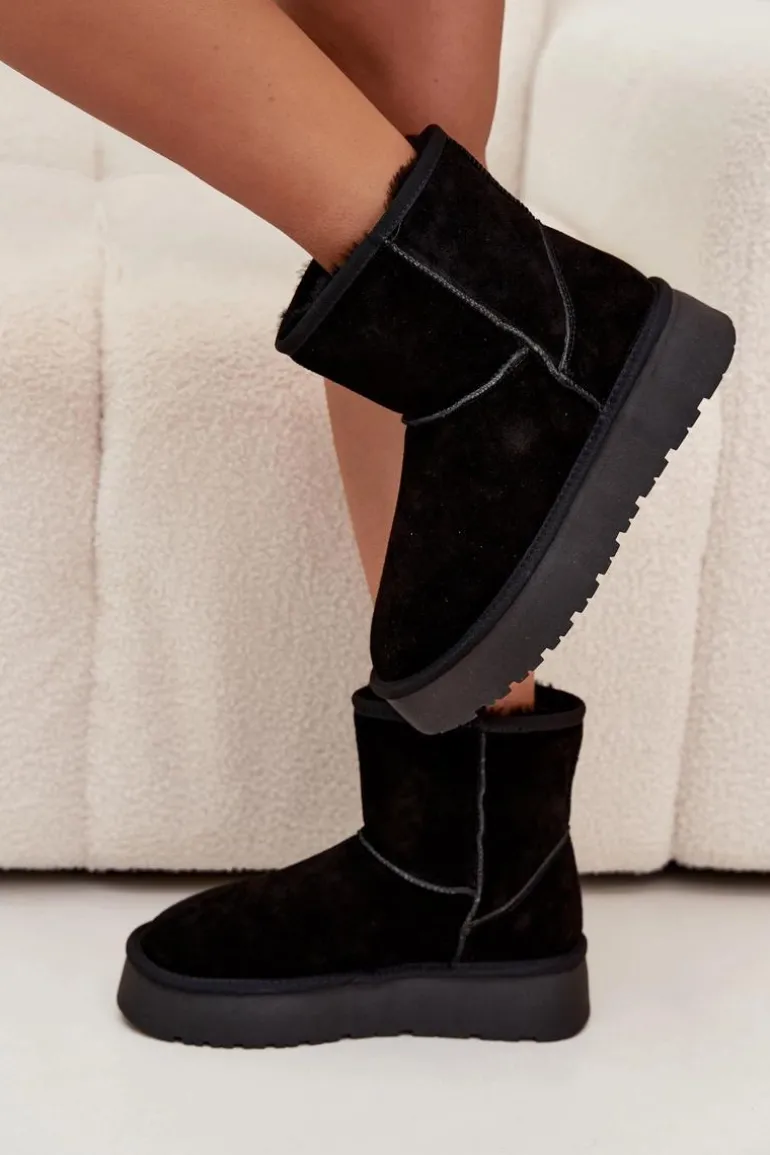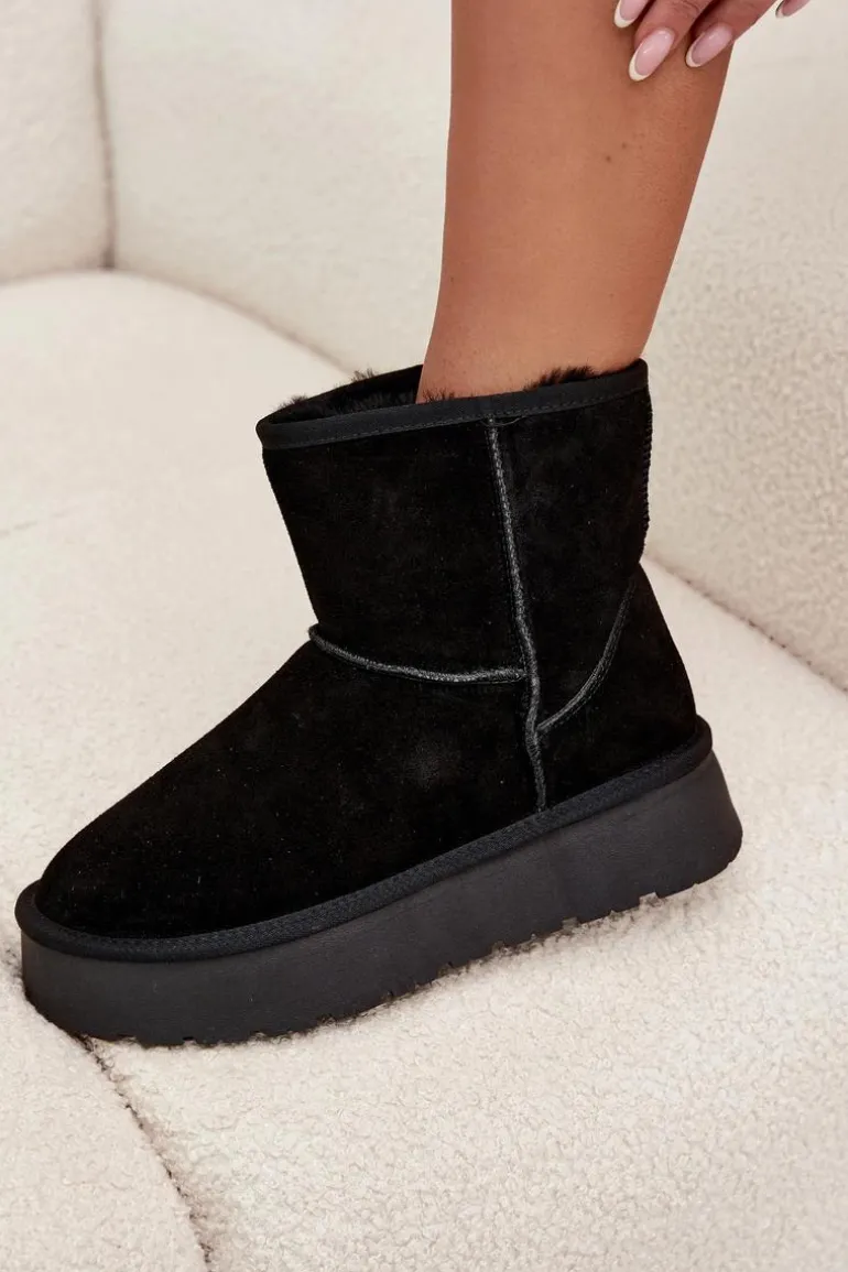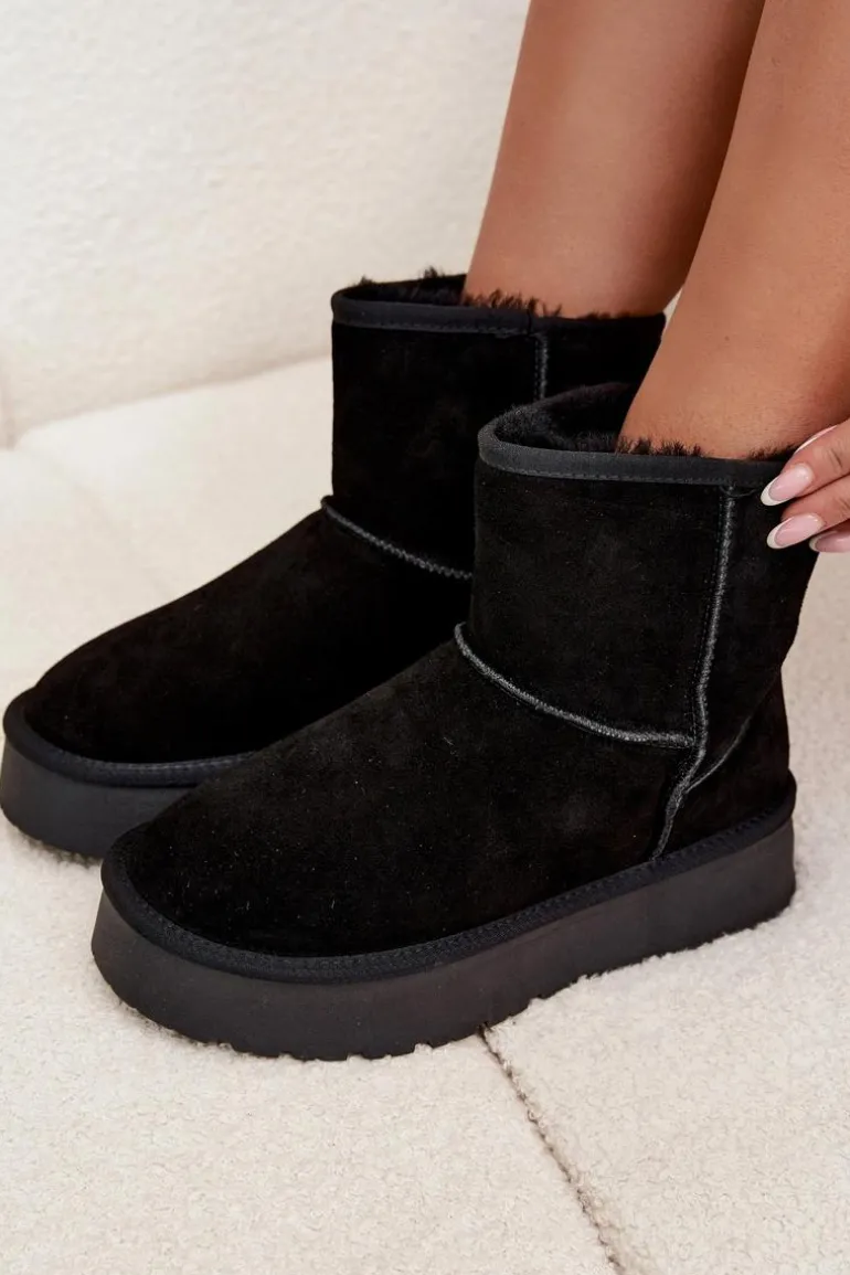 Śniegowce damskie wykonane z naturalnego zamszu. Wnętrze ocieplone miękkim futerkiem gwarantuje komfort i ciepło nawet w mroźne dni. Osadzone na platformie z gumowego tworzywa skutecznie izolują od chłodnego podłoża, zapewniając wygodę podczas codziennego użytkowania. To idealny wybór na zimowe wyjścia – praktyczne, modne i komfortowe. Przy wyborze rozmiaru prosimy sugerować się tabelą rozmiarów.