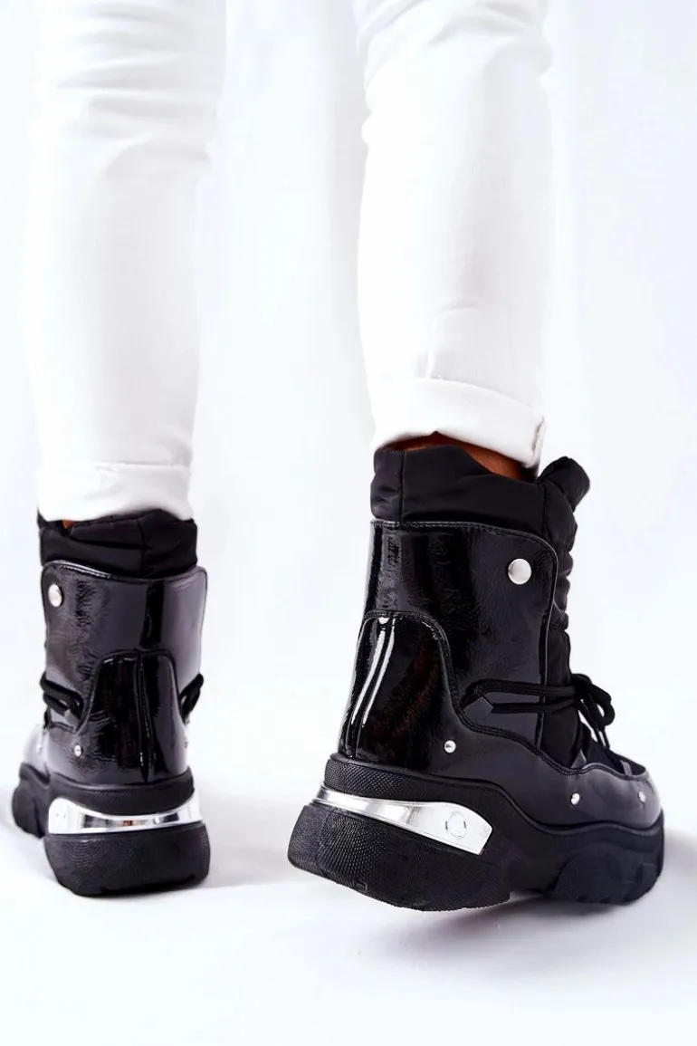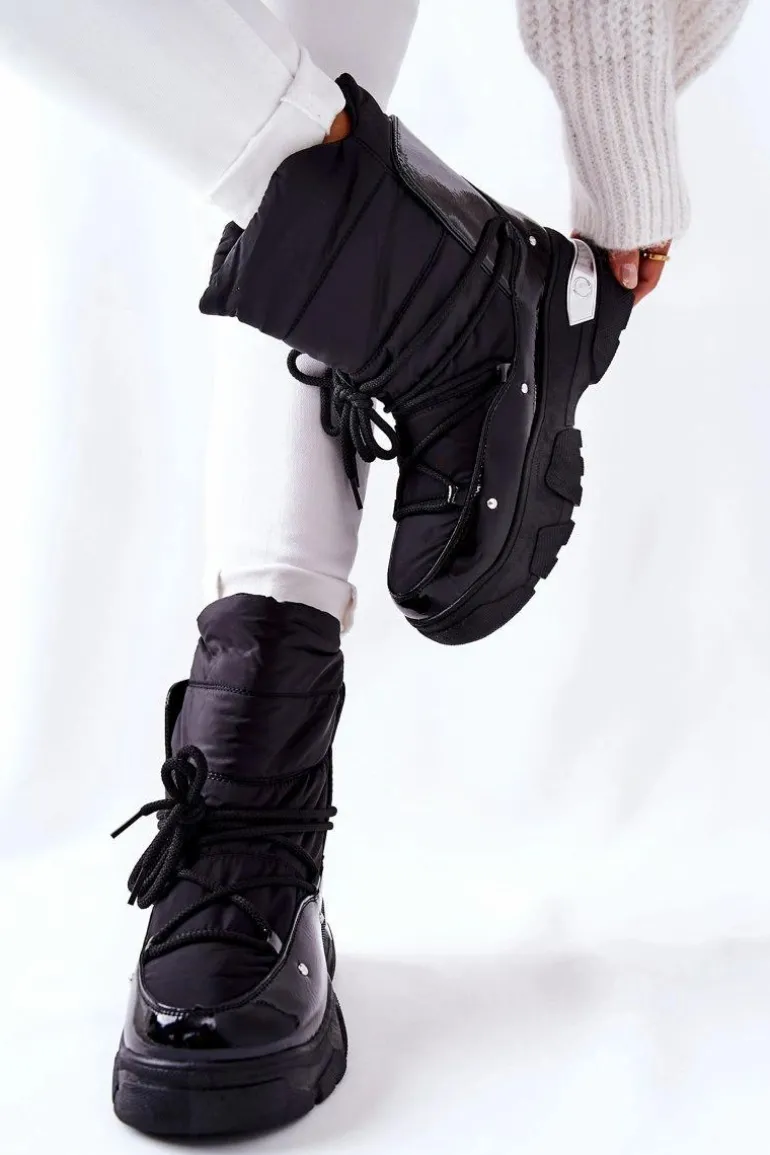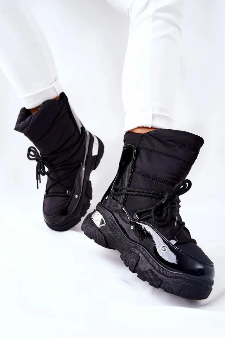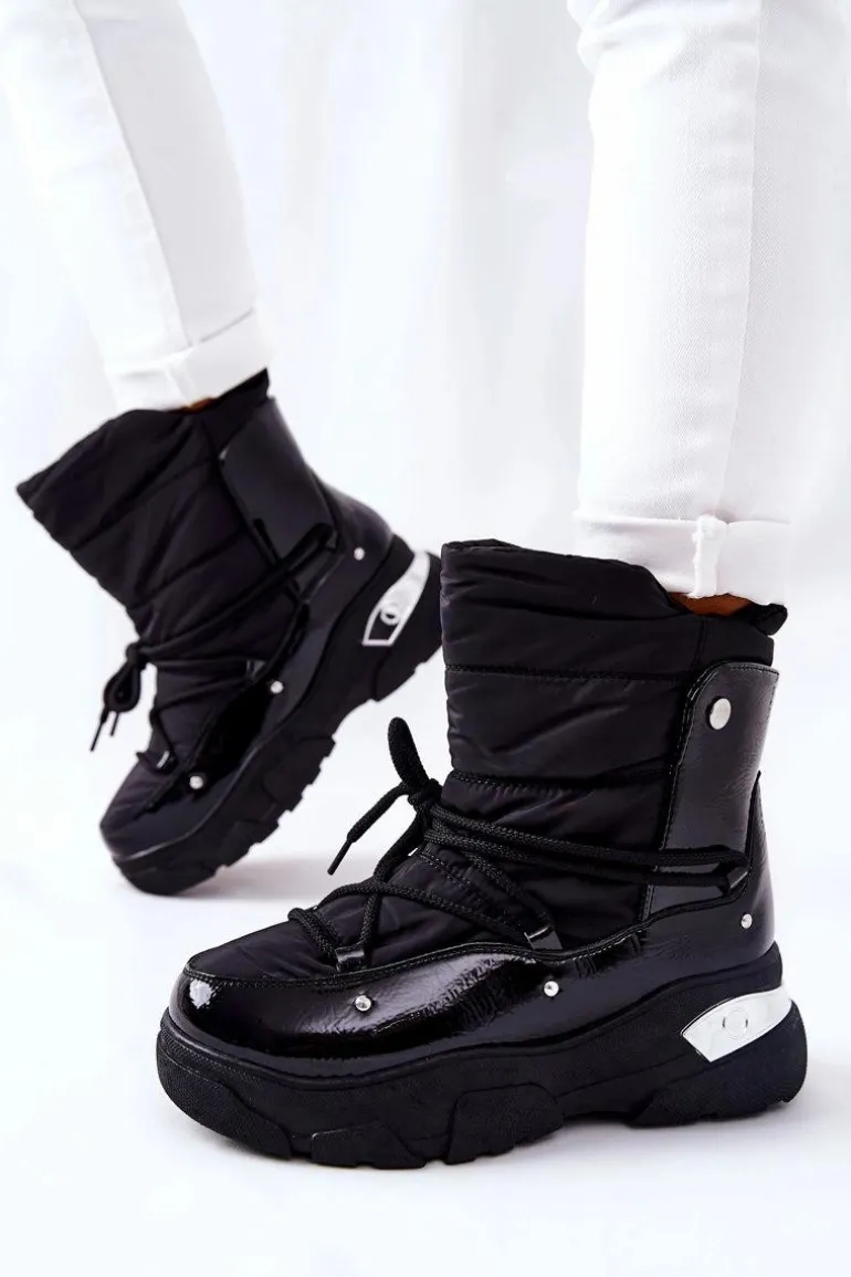 Szukasz ciepłych i wygodnych śniegowców? To dobrze trafiłaś! Śniegowce ocieplane przyjemnym w dotyku futerkiem. Zewnętrzna część buta została wykonana z materiału tekstylnego oraz lakierowanej eko skóry. Solidne sznurowanie zapewni idealne dopasowanie się buta do nogi. Wysoka platforma. Z tyłu podeszwy znajduje się ozdobny element. Przy wyborze rozmiaru prosimy kierować tabelą rozmiarów.
