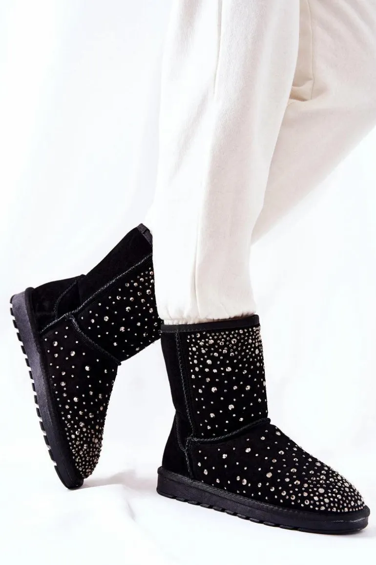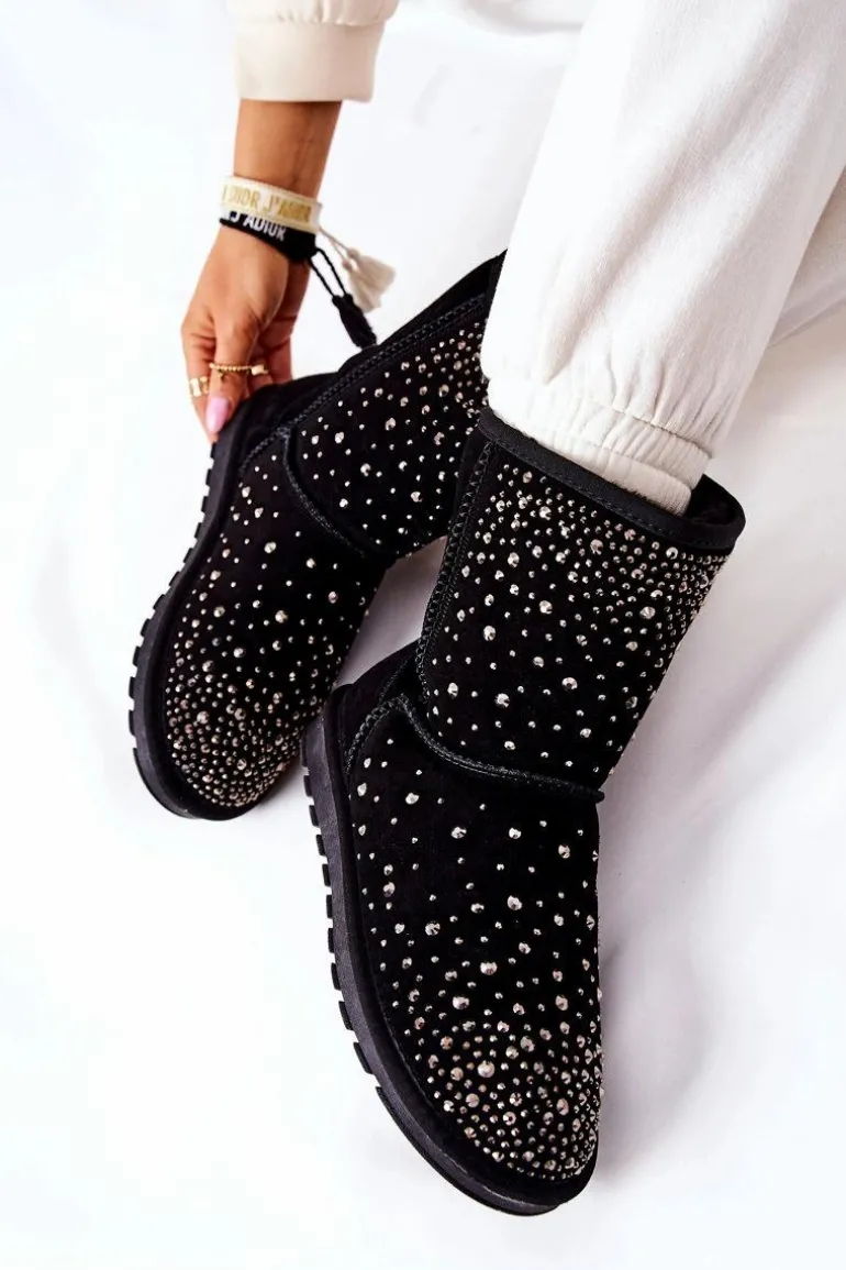 Pięknie zdobione dżetami śniegowce są idealne podczas zimnych dni! W środku posiadają ocieplenie w postaci przyjemnego w dotyku futerka. Zostały wykonane z naturalnego zamszu. Gruba podeszwa ochroni stopy przed zimnem. Koniecznie musisz je mieć, nie czekaj dłużej aż znikną! Przy wyborze rozmiaru, prosimy sugerować się tabelą rozmiarów.